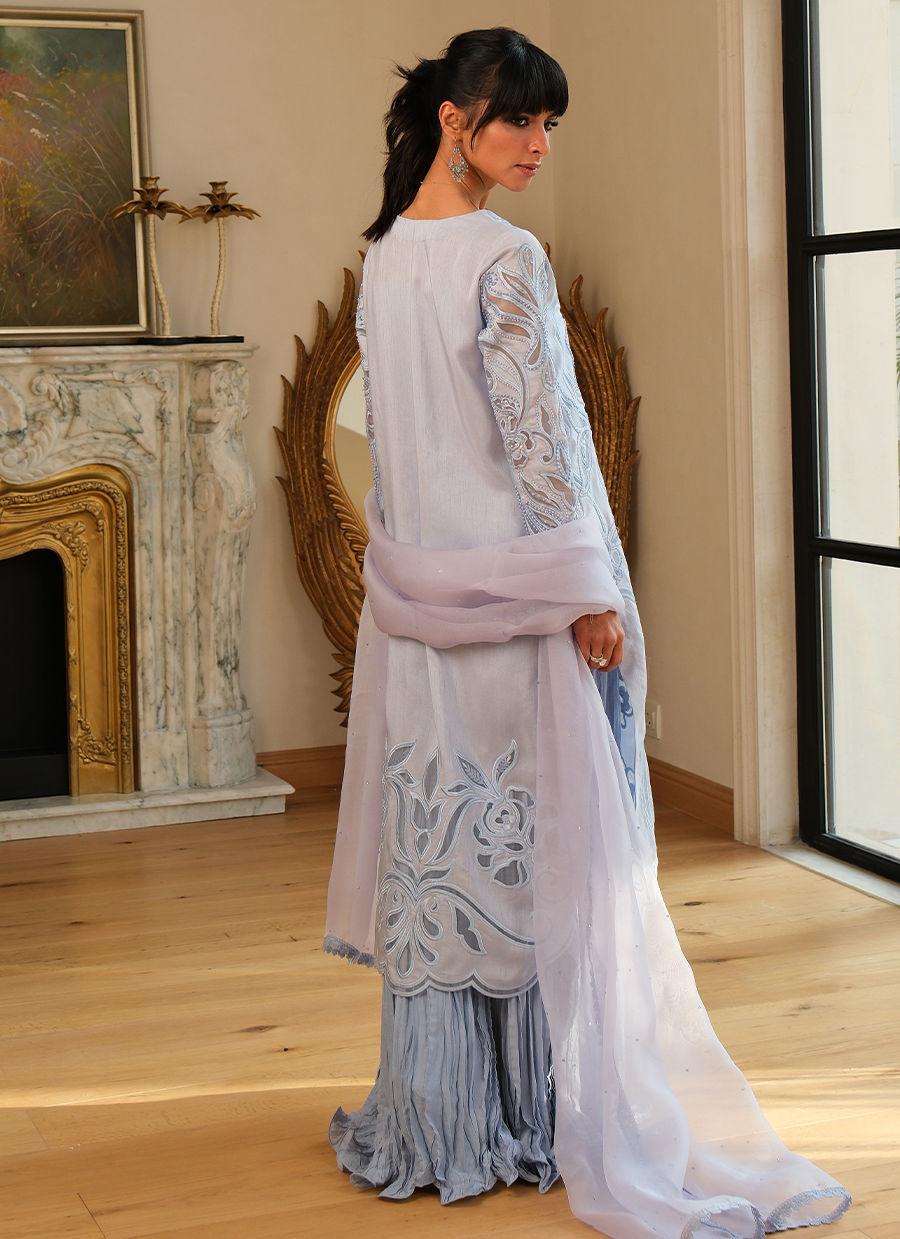Unmistakably couture- Aeris is a timeless and uber flattering silhouette, using luxurious silk and hand-embellished with the finest pearls, crystals, and sequins, layered over organza appliqué that flows across the front, sleeves, and back. Delicate yet impactful, the detailing creates depth and luminosity. It can be dressed up with a crushed silk lehnga and an embroidered organza dupatta for a more formal setting or you can opt for wide leg pants and a medium silk dupatta for a more modern feel. Aeris is the kind of outfit that turns heads quietly — and lingers long after.
