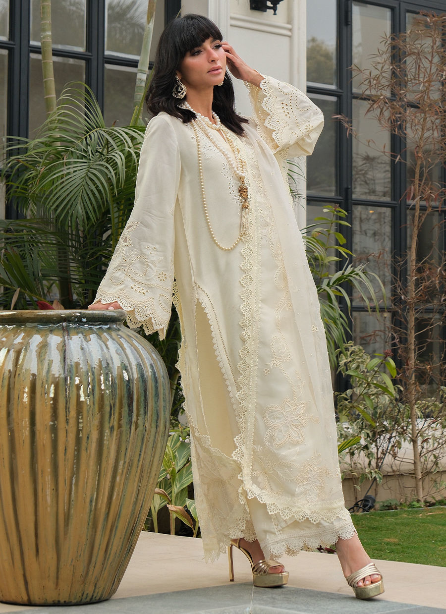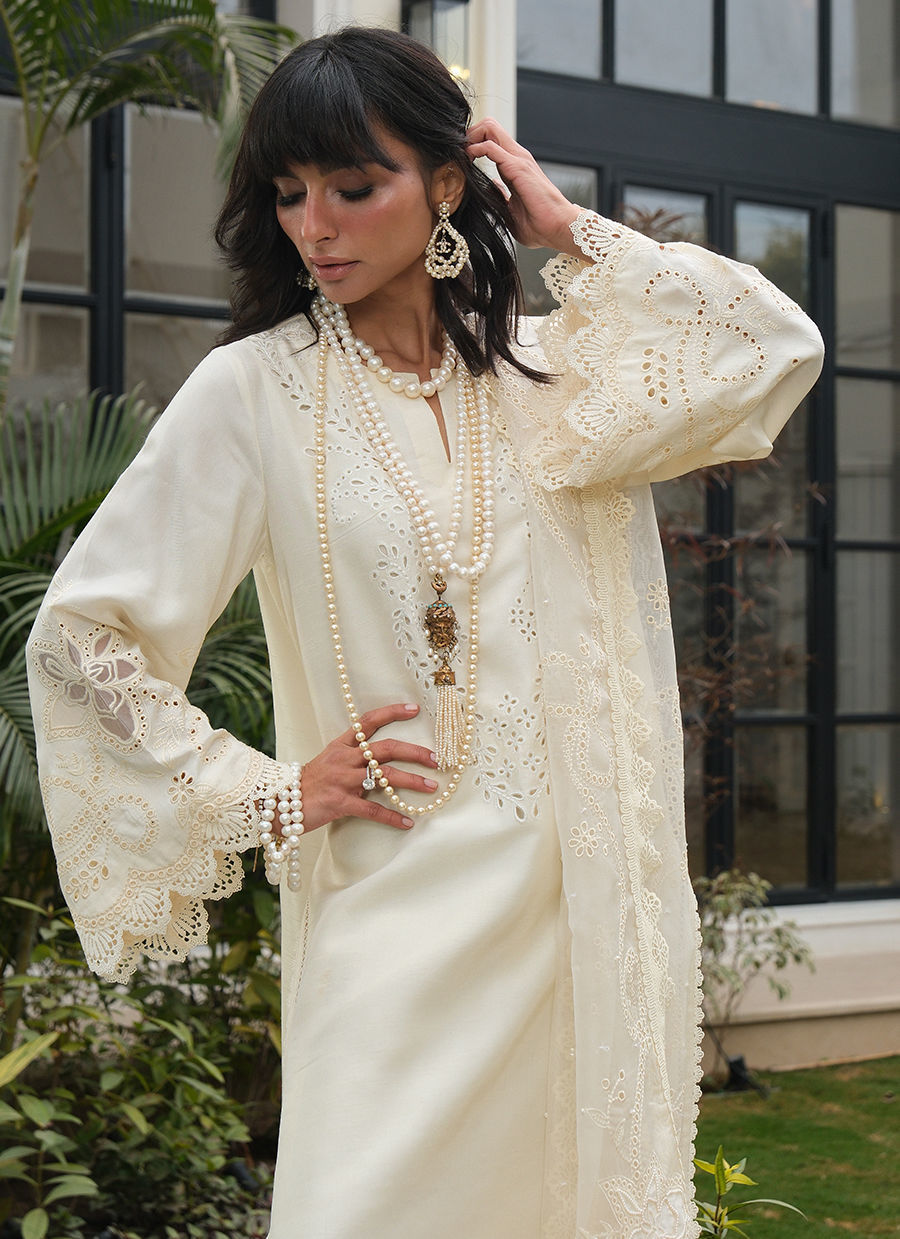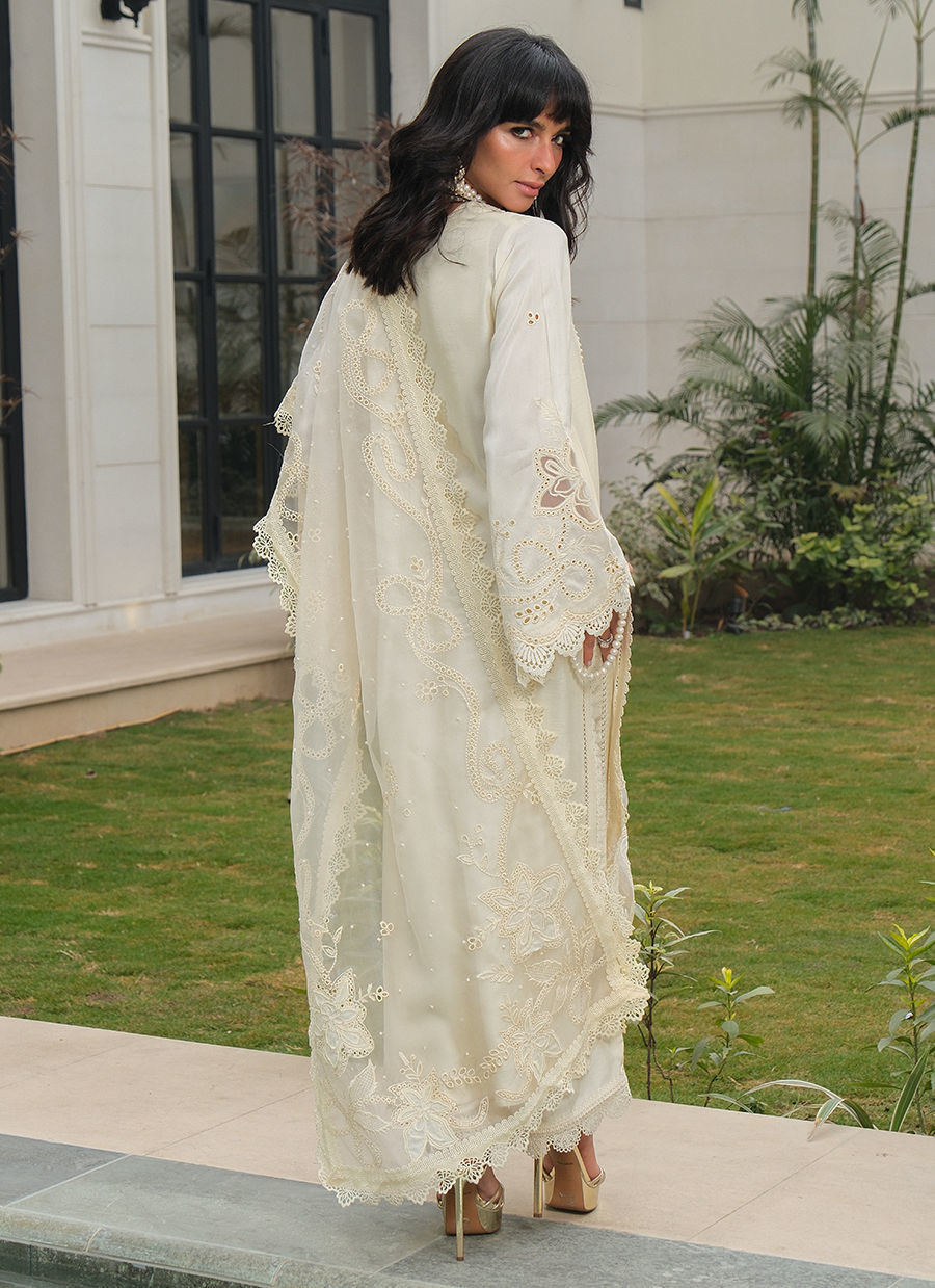 Anaya is a study in understated elegance. Crafted from ivory silk, the shirt and pants are finished with a delicately embroidered neckline and appliquéd sleeves, lending depth and texture. The ensemble is paired with a soft organza dupatta, intricately embroidered and appliquéd, edged with fine lace. Classic yet effortless—an easy, graceful silhouette that transitions seamlessly from day to evening with quiet confidence.