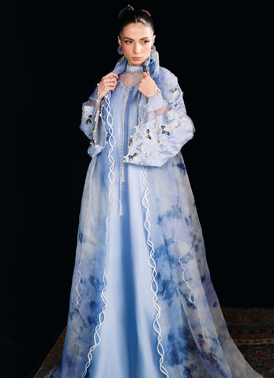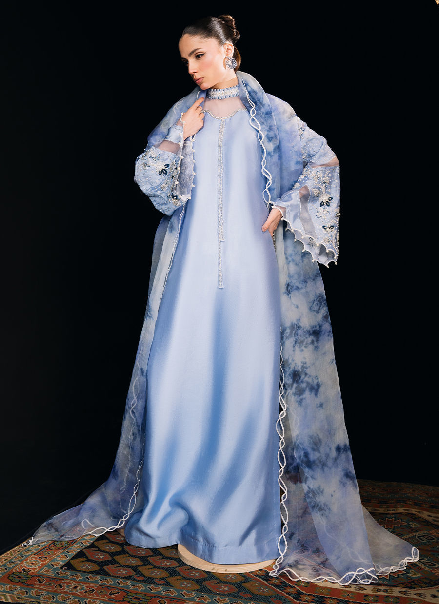 A kaftan dress paired with cigarette pants and a tie-dye organza dupatta. Featuring a hand-embellished neckline with organza and crystal tassel, flared sleeves adorned with dabka, naqshi, crystals, sequins, pearls, and scalloped organza detailing, completed with a scalloped embroidered dupatta border.