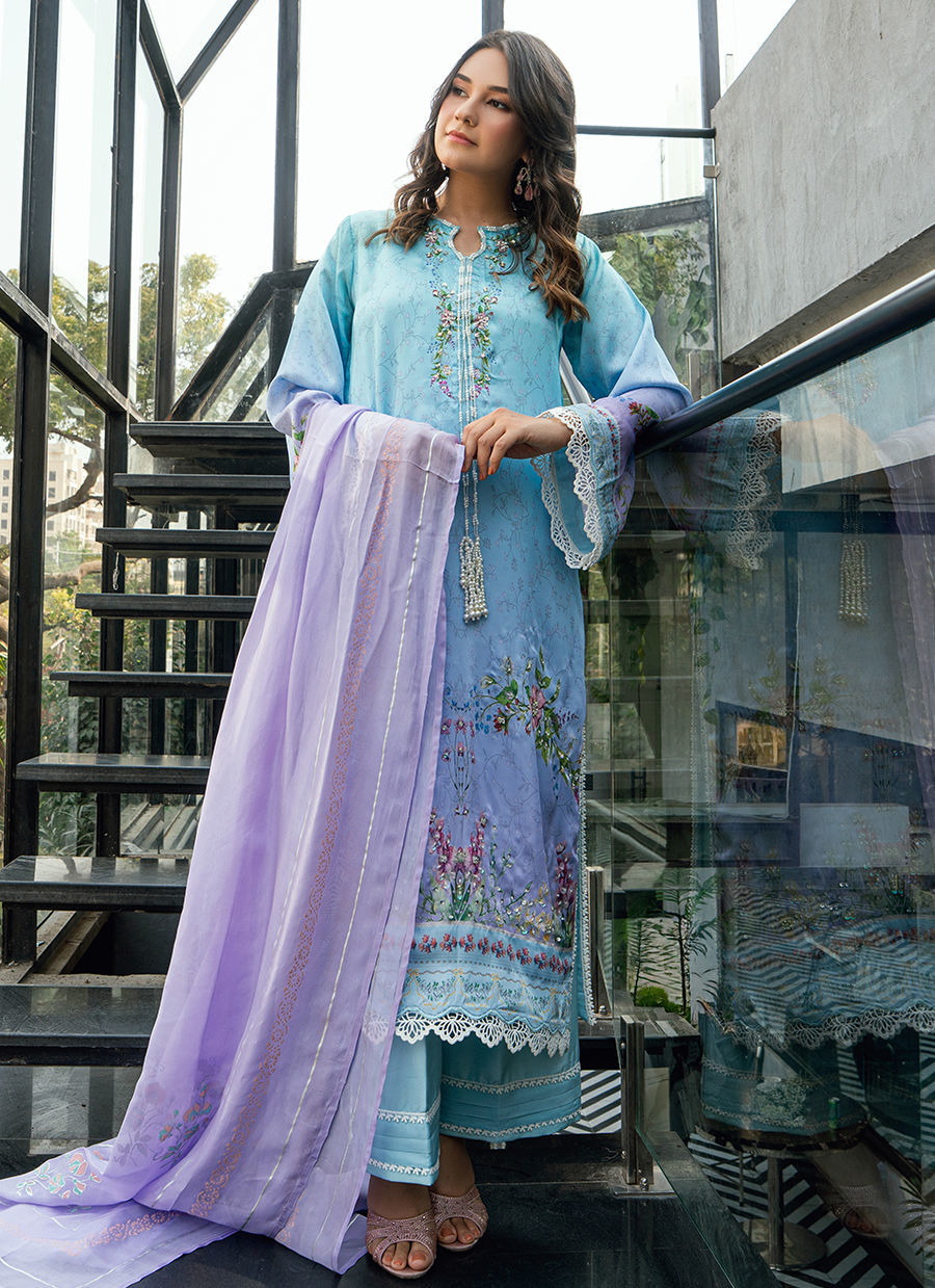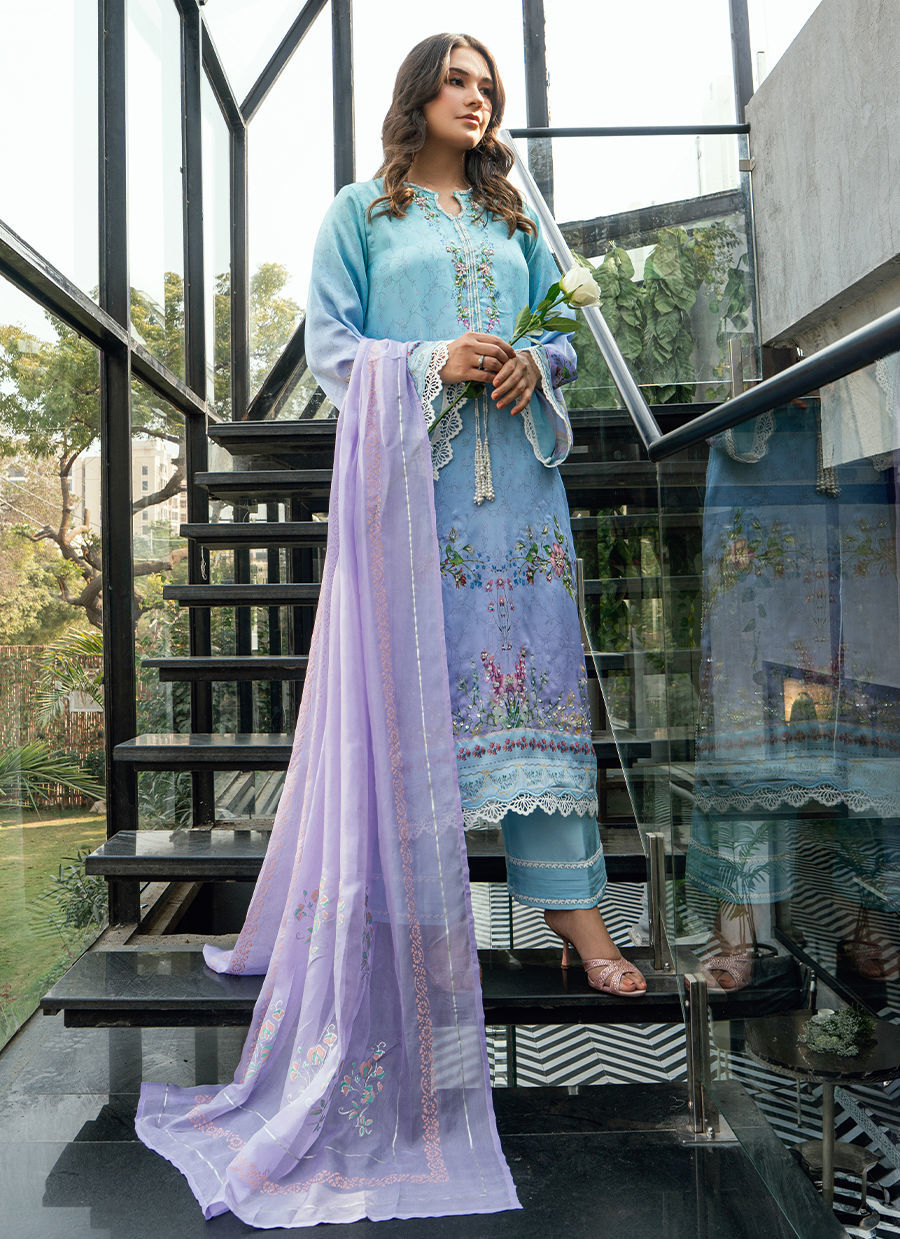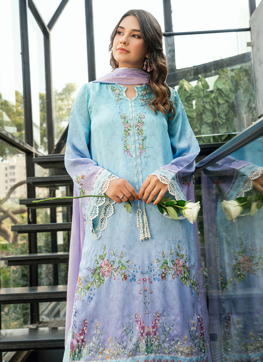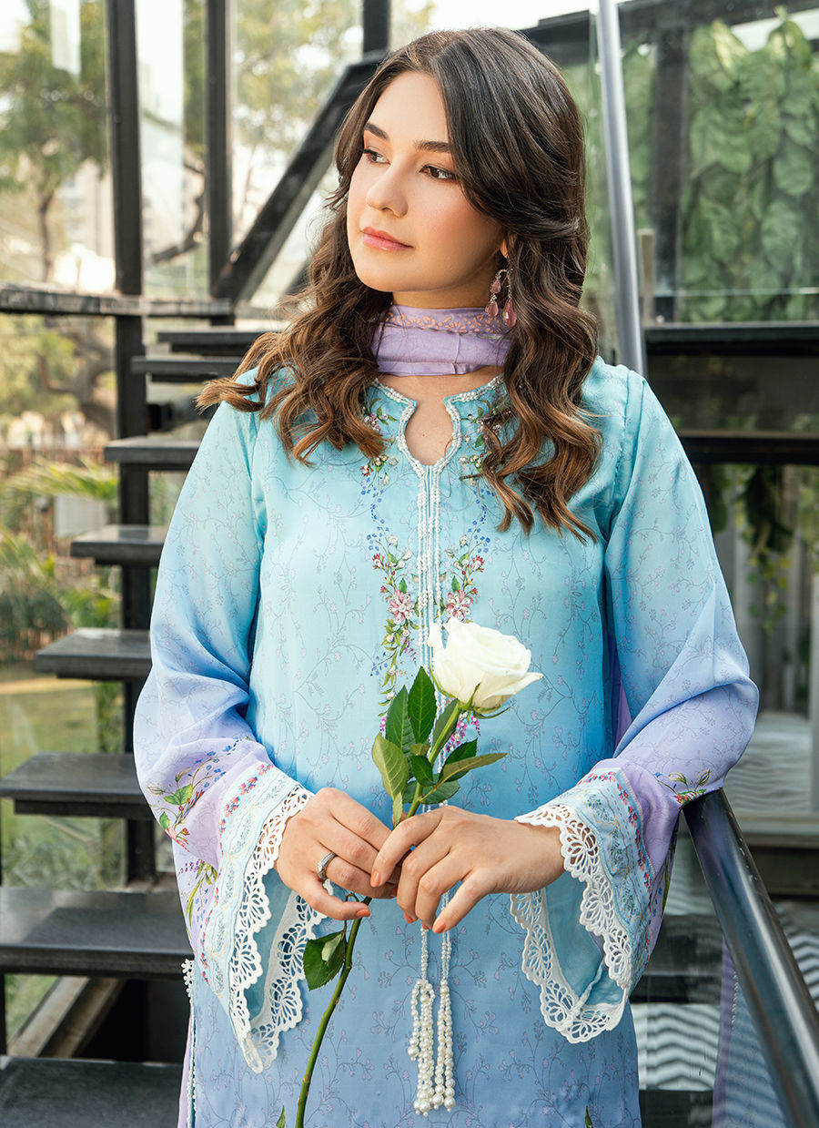 This refined three-piece ensemble features a soft sky-blue long shirt adorned with delicate digital prints inspired by floral and ornamental motifs. The front is beautifully highlighted with hand embellishments and subtle embroidery, adding a graceful sparkle and artisanal depth to the design. Intricate lace detailing at the sleeves and hem enhances the shirt’s elegant finish.