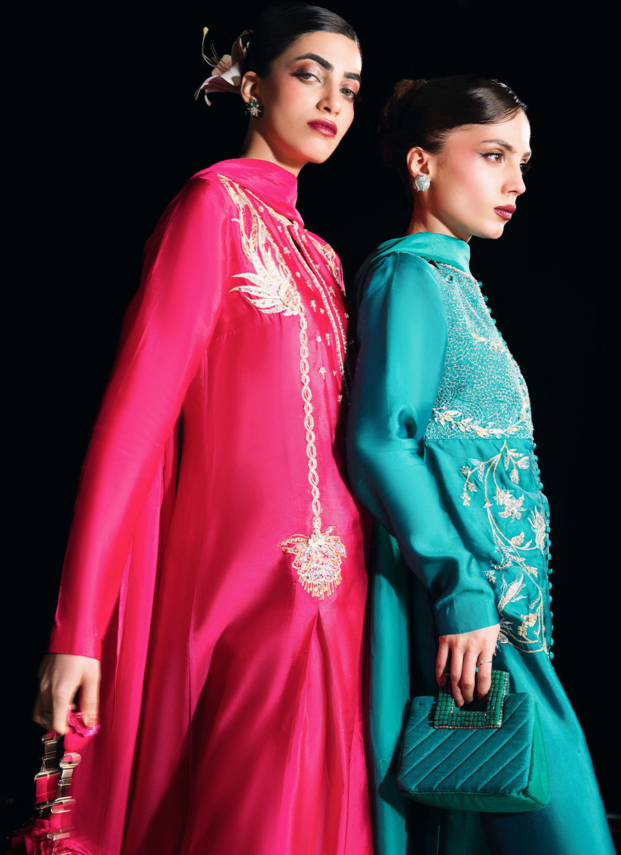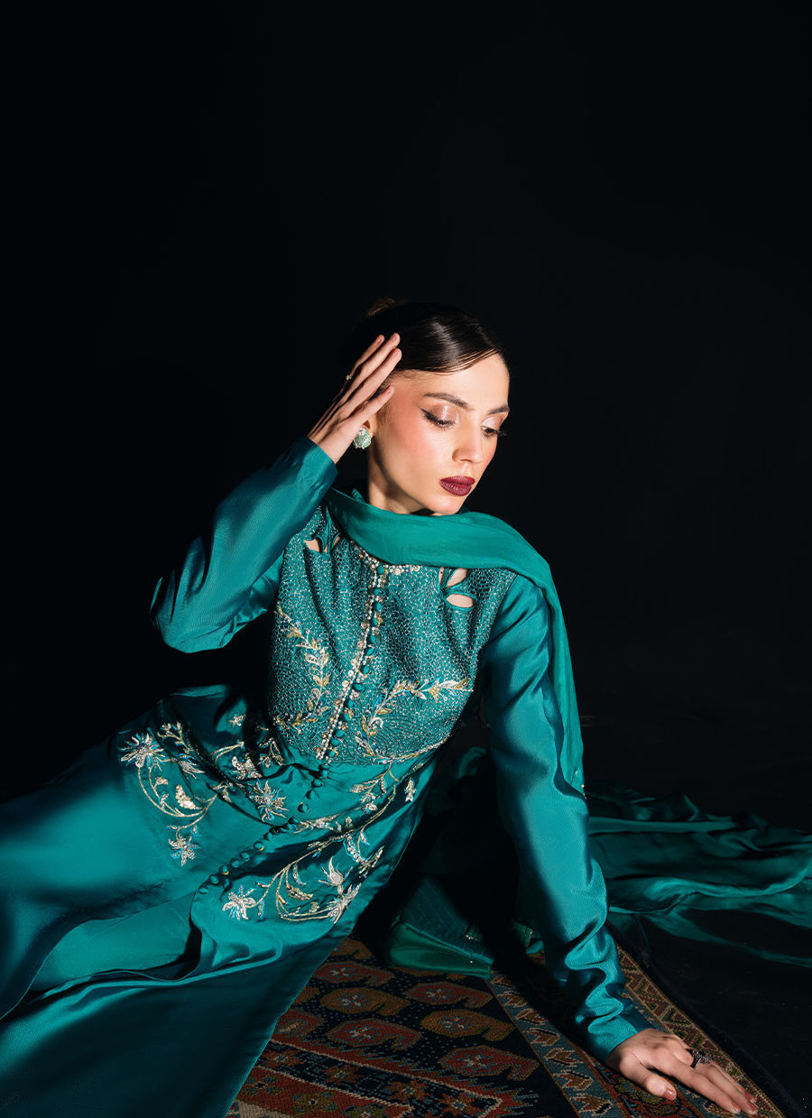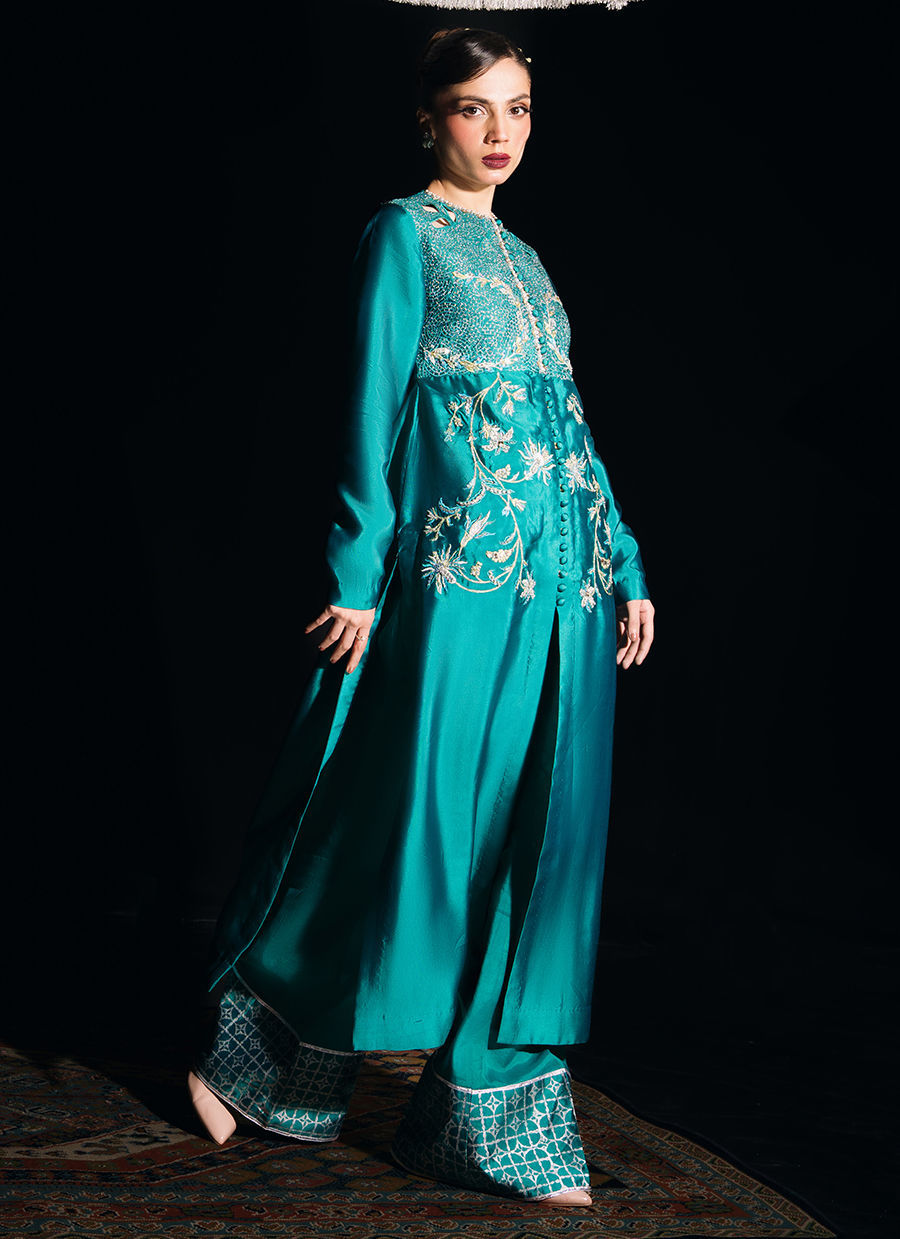 Color: Deep Teal Fabric: Shirt (Tissue Silk), Pants(Thai silk), Dupatta (Medium silk) Work Details: Hand-Embroidered