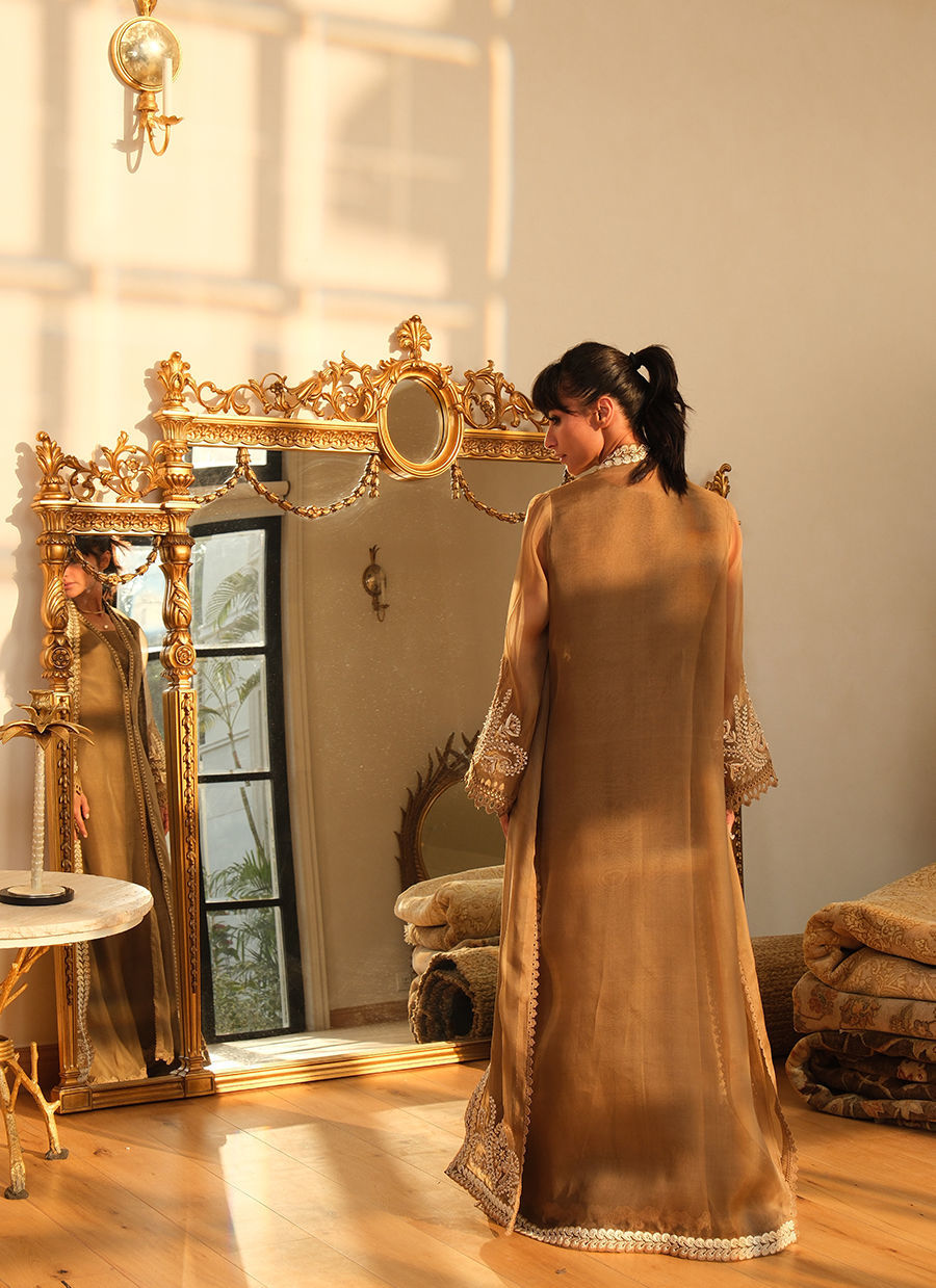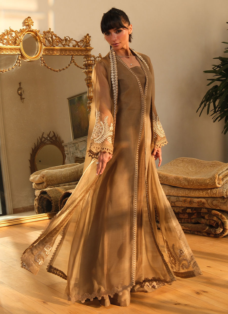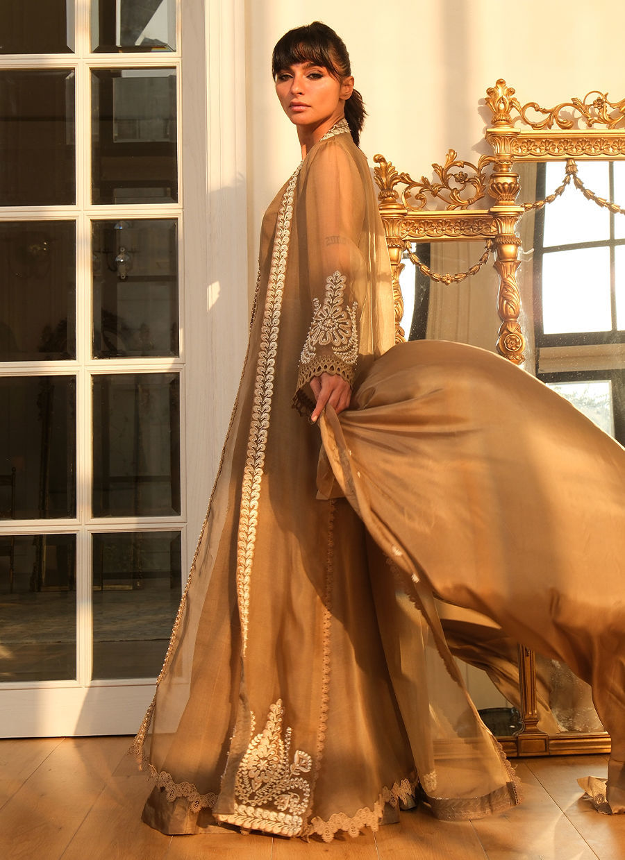 Caramel A triple-layered statement in a rich biscuit-gold tone—built for the woman who wants luxury you can feel, not shout. The look starts with a sleek, gown-cut inner that creates a long, fluid line, then gets elevated with a sheer organza jacket that moves like light. The jacket is framed with hand embroidery—a regal, vine-style border running down the front, finished with ornate motifs at the hem and cuffs, plus delicate lace edging for that couture close-up detail. Paired with a wide leg silk pant and medium silk dupatta.