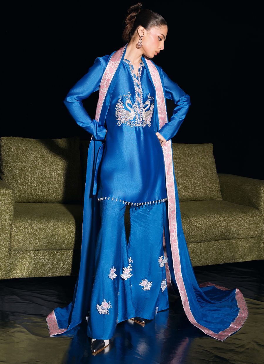 Color: Berry Blue Fabric: Shirt (Tissue Silk), Trouser (Thai silk), Dupatta (Medium silk) Work Details: Hand-Embellished