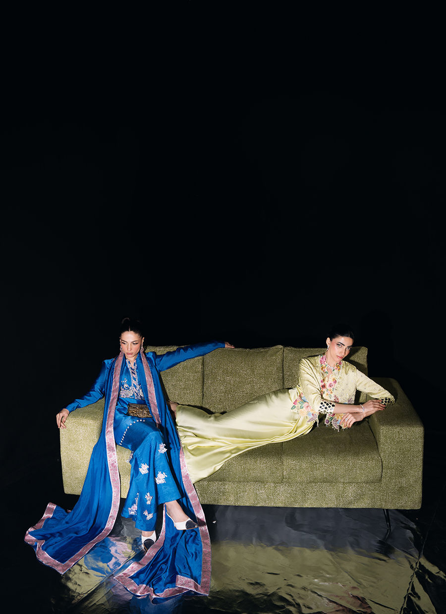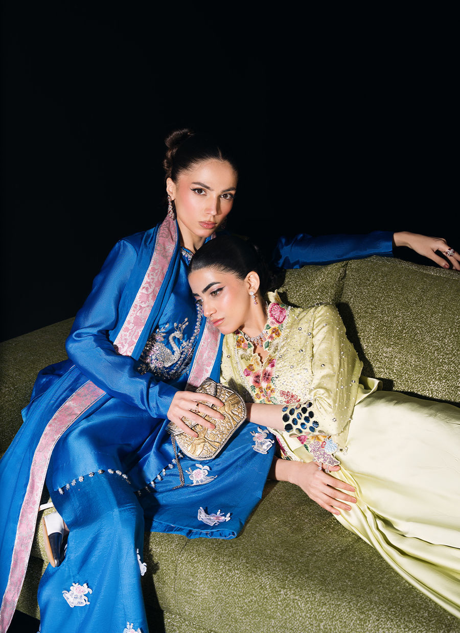 A mid-length shirt paired with flared bootcut trousers and a silk dupatta, adorned with hand-embellished birds and florals in dabka, naqshi, crystals, sequins, and pearls, featuring a round neckline with chatta patti and crystal hangings. The look is completed with cutwork embroidered trousers and a silk dupatta finished with a contrast border and lappa detailing.