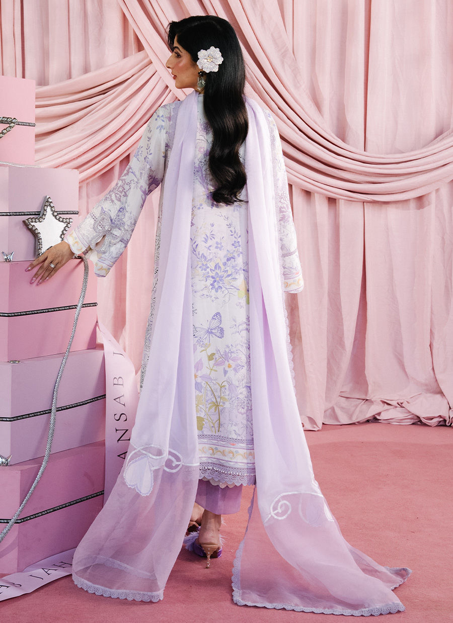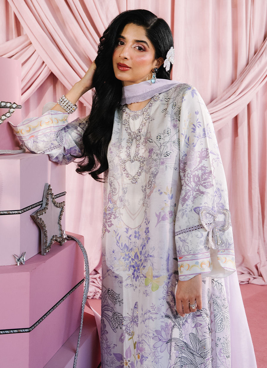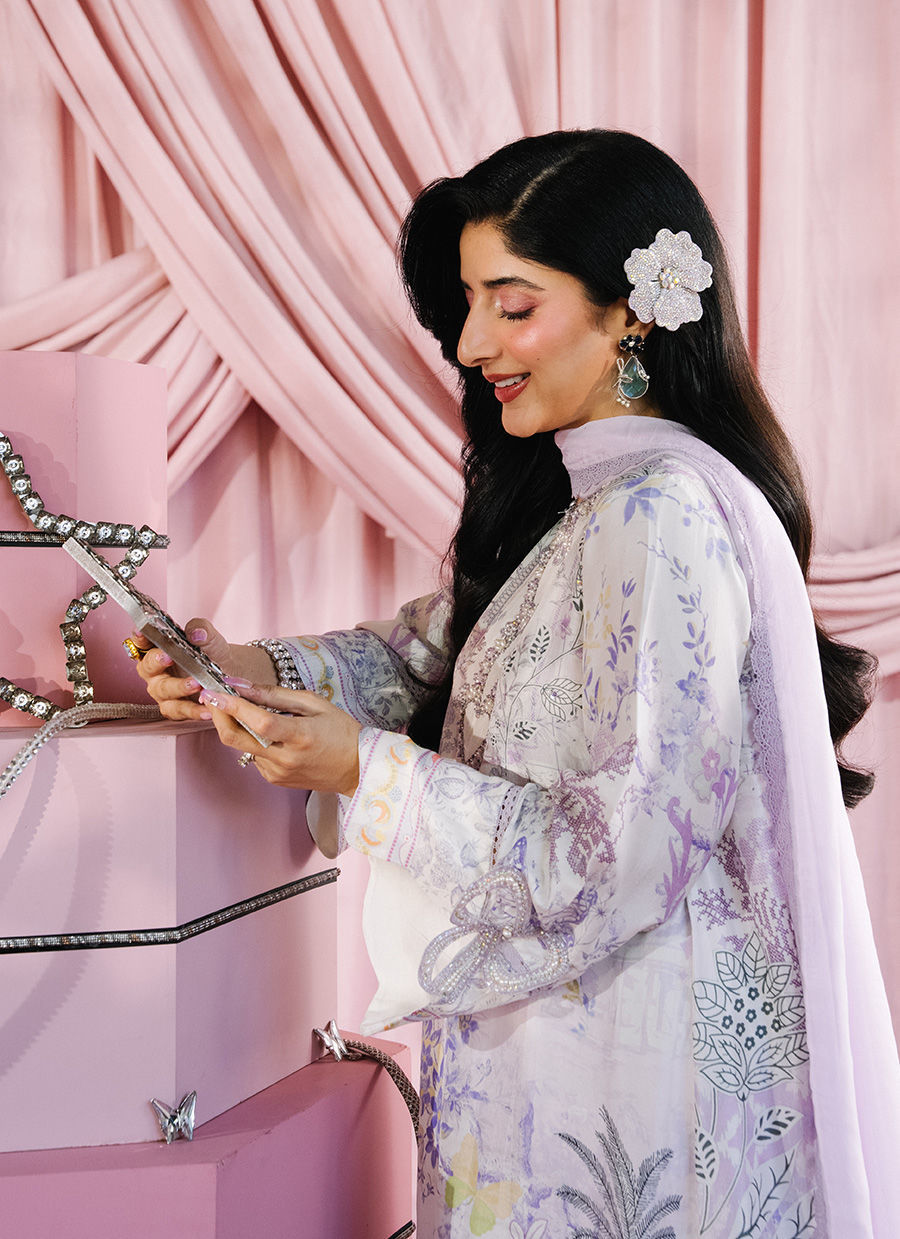 A graceful lilac and white printed long shirt designed with a soft, feminine aesthetic and effortless flow. Paired with a white sheesha silk izaar, the ensemble balances comfort with understated luxury. The look is completed with a medium silk dupatta, elevated with delicate organza details and subtle hand embellishments that add texture and refinement.