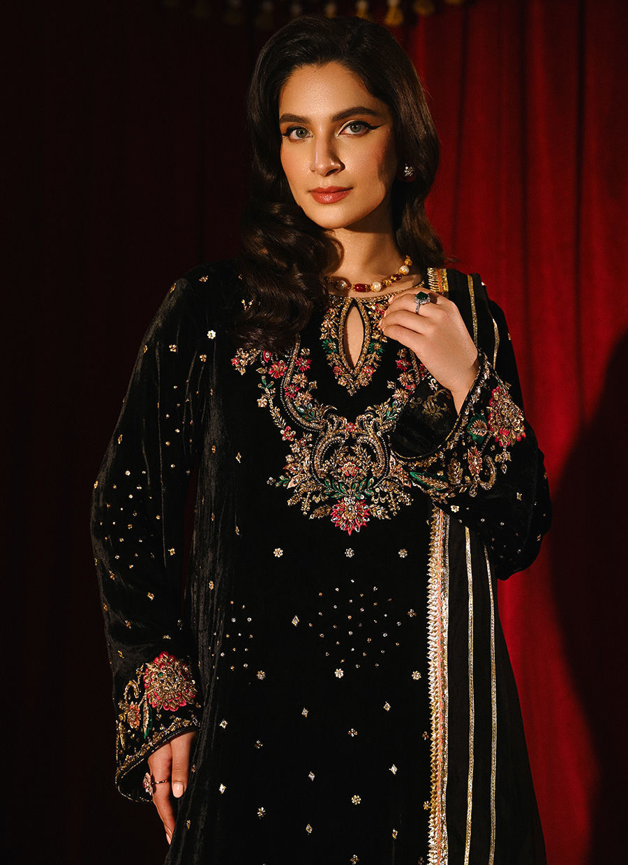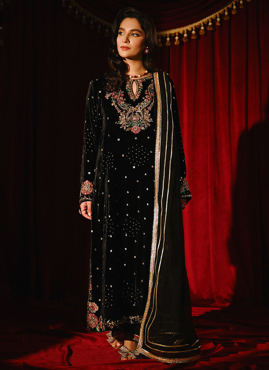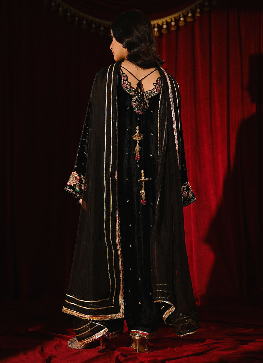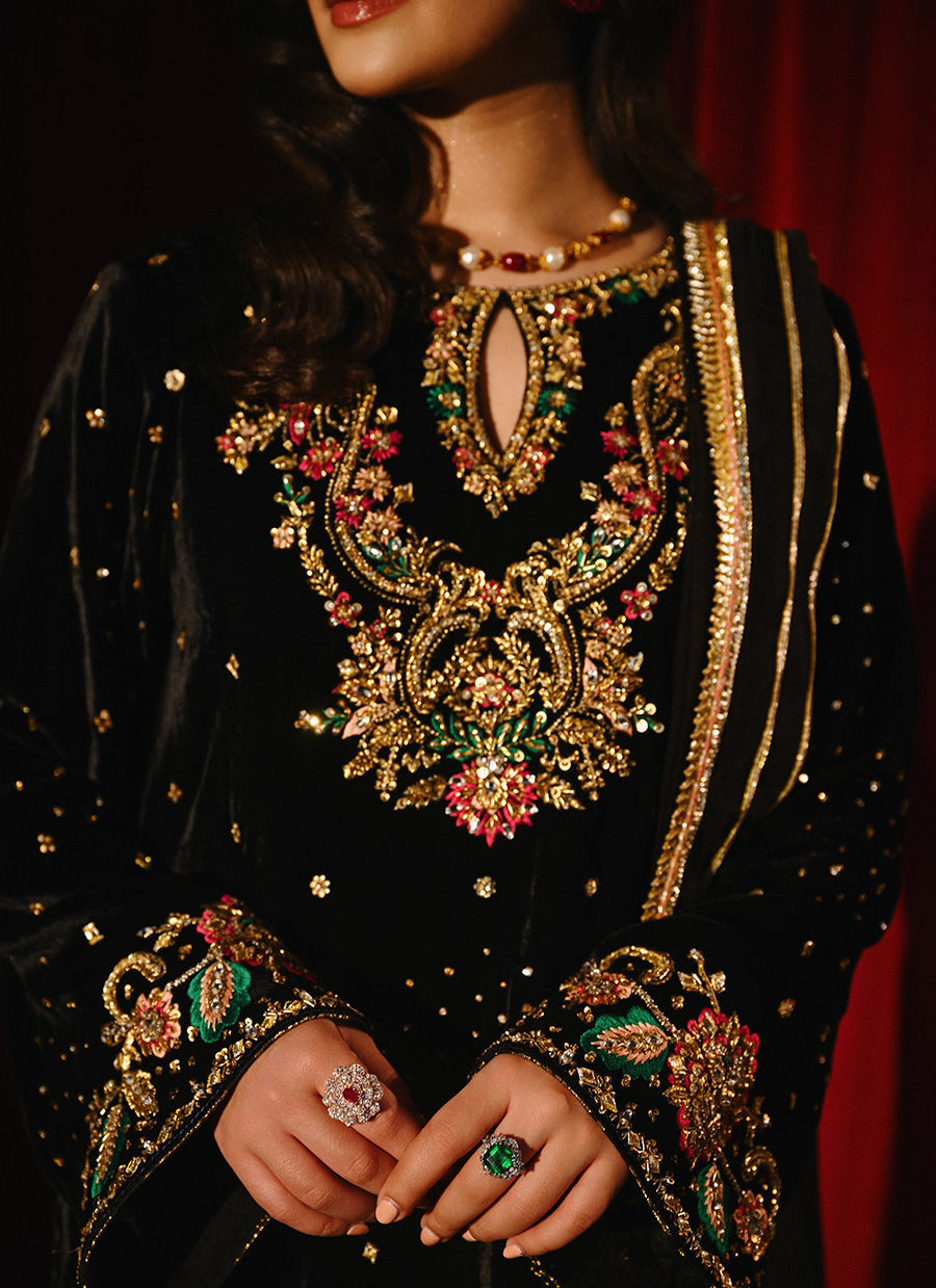 This luxurious black velvet ensemble is adorned with intricate colored resham and zardozi handwork, complemented by a delicate gold sequin spray that adds a soft, luminous sheen. Paired with a block-printed izaar and dupatta, the look beautifully combines rich craftsmanship with timeless elegance.