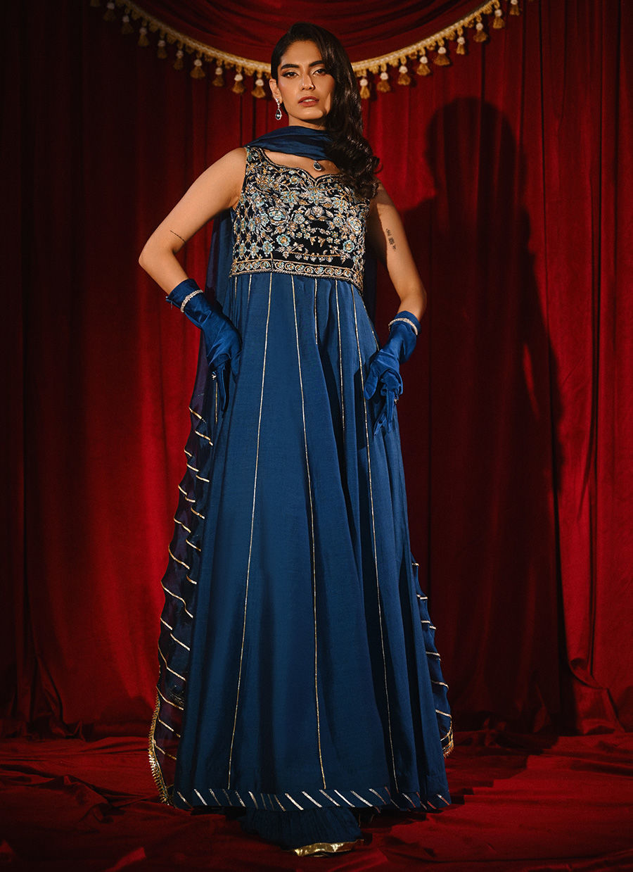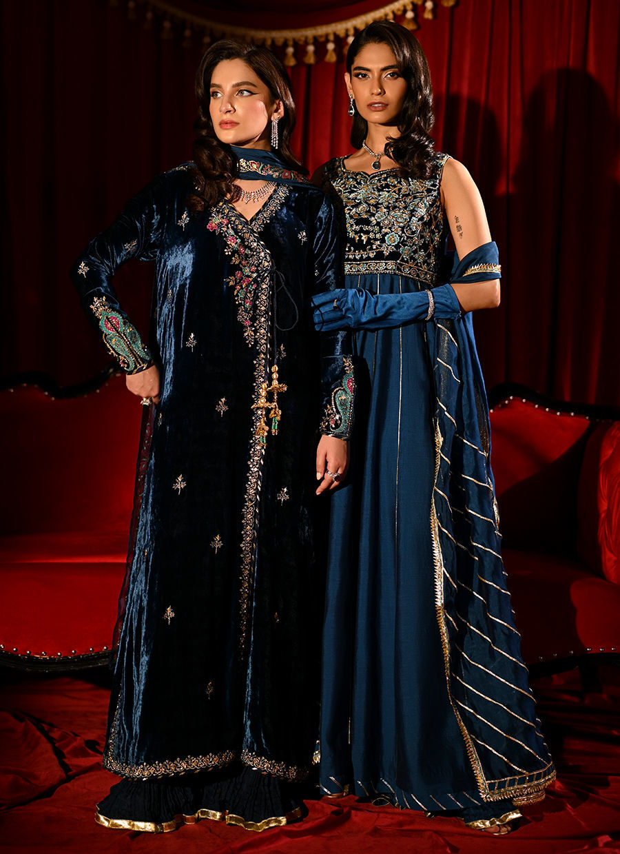 This sleeveless kaftan-style kalidaar features a richly hand-embroidered velvet bodice that exudes timeless elegance. The luxurious texture of the velvet contrasts beautifully with the flowing medium silk dupatta, creating a harmonious balance of structure and softness. Refined craftsmanship and graceful detailing make this ensemble a statement of understated sophistication.