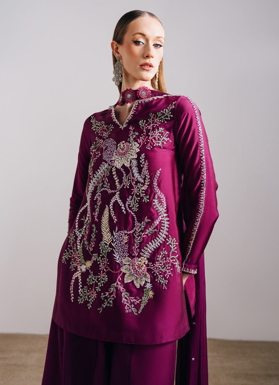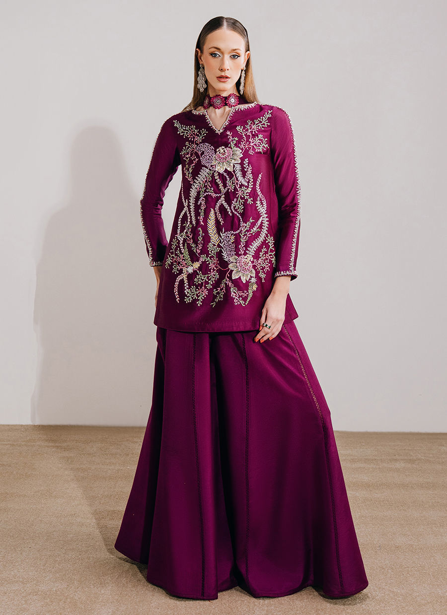 This light plum ensemble features a mid-thigh shirt paired with a sharara and a medium silk dupatta, offering a refined yet graceful silhouette. The shirt is adorned with exquisite hand-embroidered florals, elevated with hand-embellished borders on the neckline and sleeves and enhanced with crystals, sequins, and pearls for a subtle shimmer. A delicate keyhole detail at the back neckline, finished with embellished tassels, adds a thoughtful touch, while the sharara is detailed with lace inserts for added movement. The look is completed with a medium silk dupatta, highlighted with three-dimensional florals and pleat detailing, bringing depth and elegance to the ensemble.