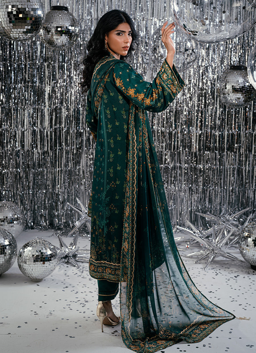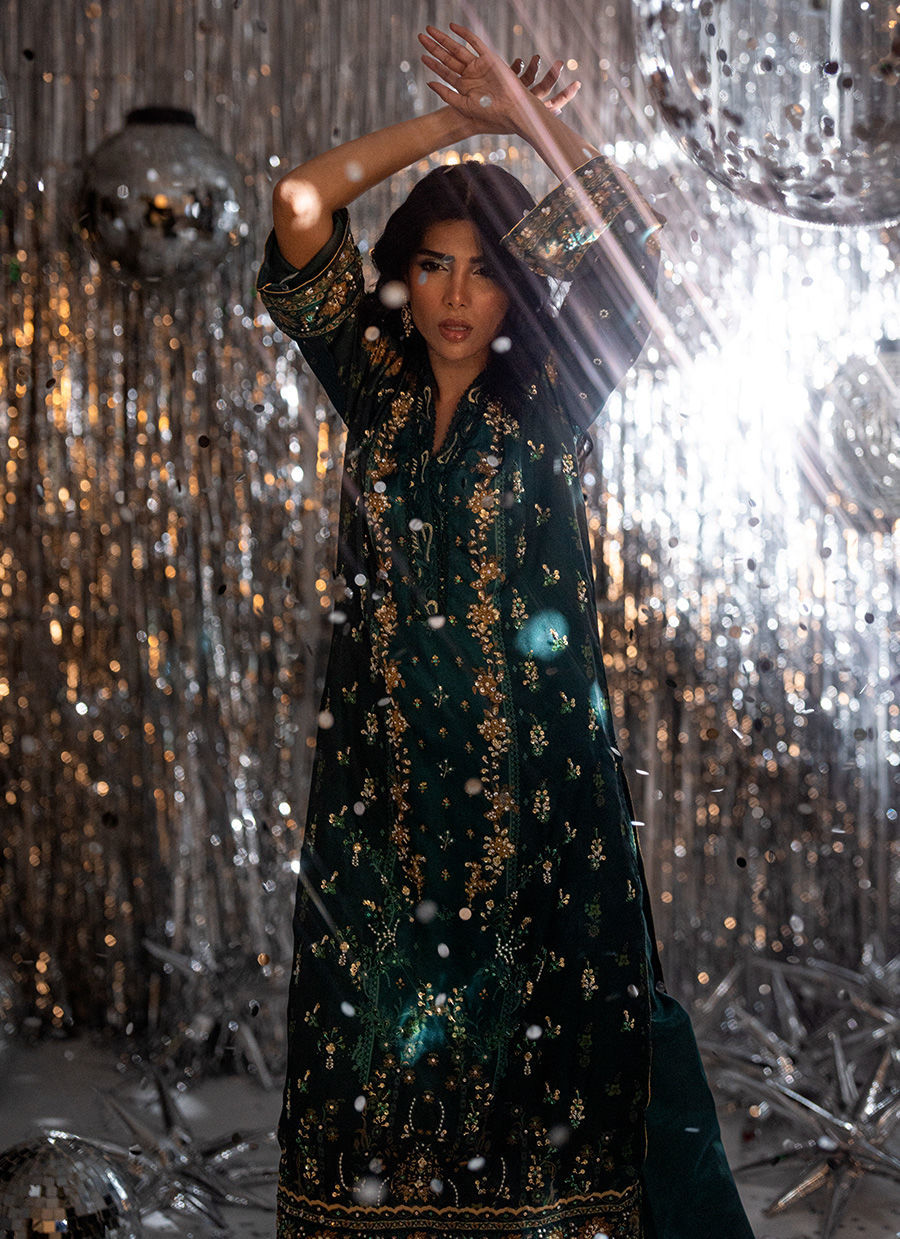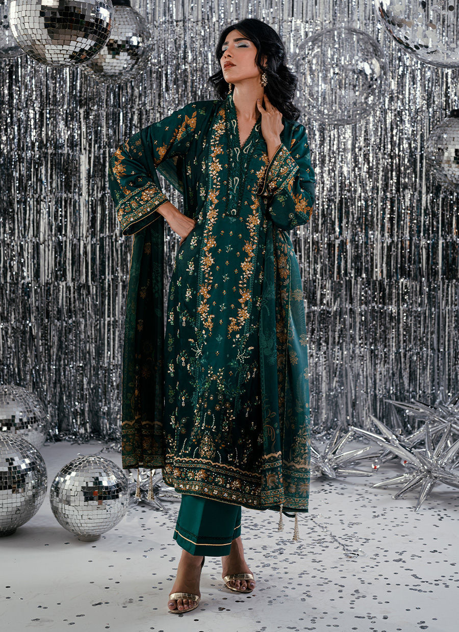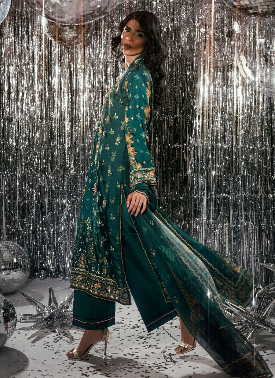 An ode to regal elegance, Forest Veil enchants with its deep emerald canvas and self-digital print that exudes quiet luxury. The long-length shirt is beautifully accentuated with intricate gold handwork, rendered with finesse along the neckline and panels to create a statement of timeless sophistication. Delicate craftsmanship meets modern refinement through subtle detailing and a graceful silhouette, perfectly paired with coordinated trousers and a matching digitally printed dupatta. A masterpiece of understated opulence, Forest Veil embodies refined artistry—designed for the woman who carries tradition with a modern spirit.