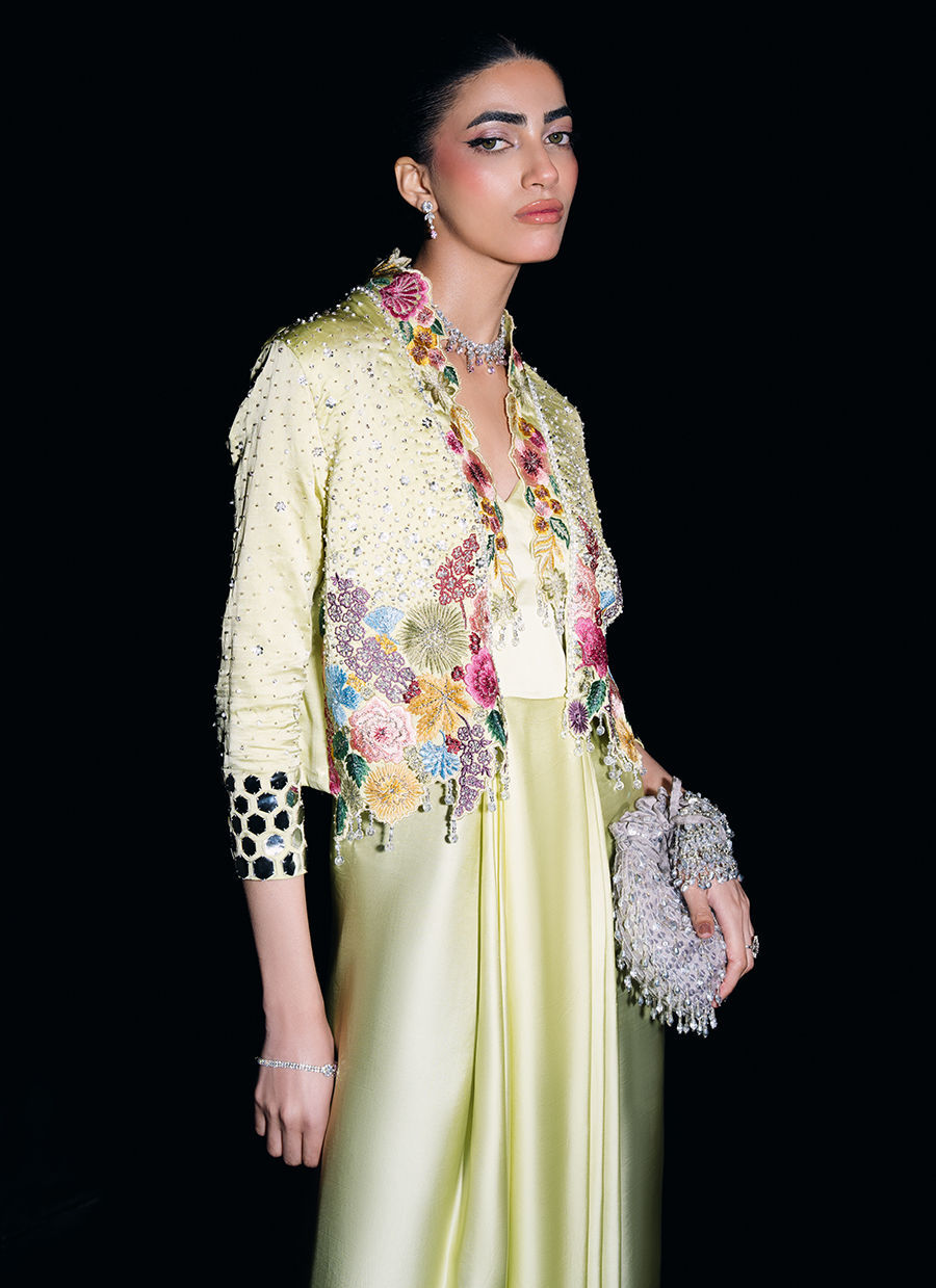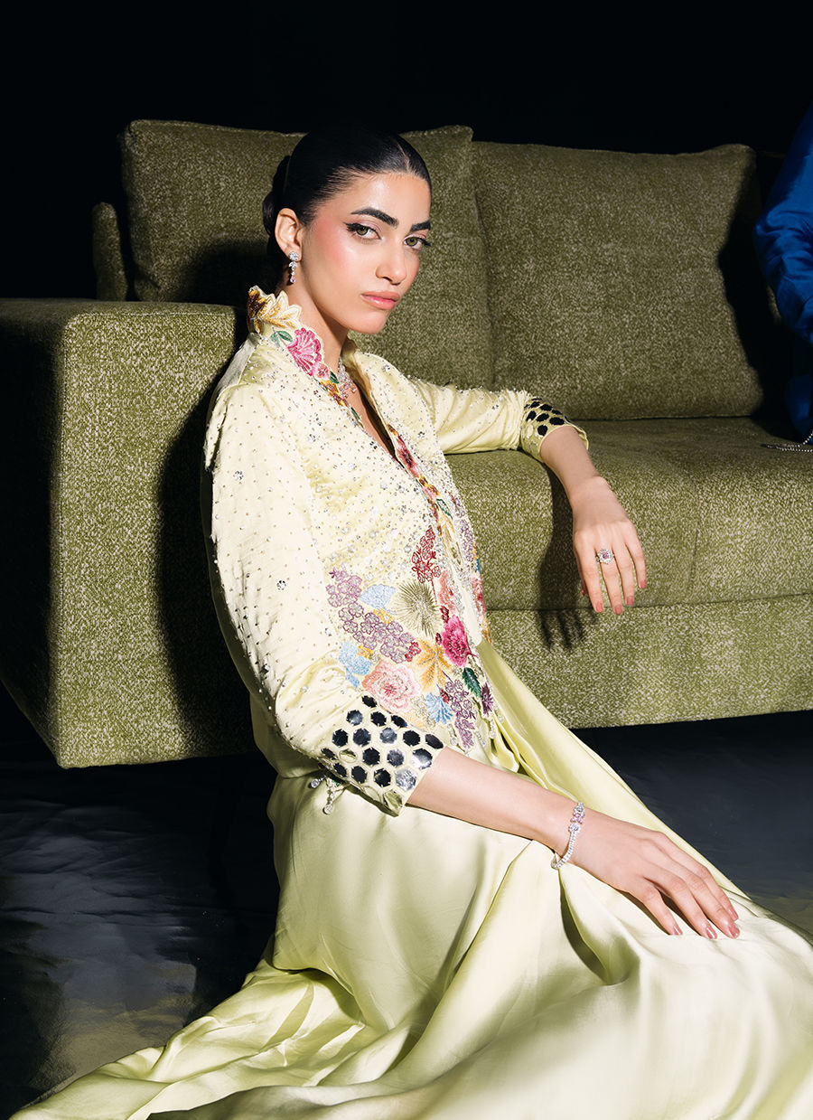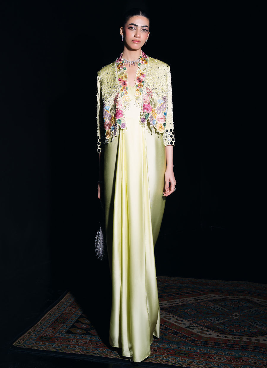 Color: Butter Yellow Fabric: Jacket (Tissue Silk), Dress(Chimose silk) Work Details: Hand-Embroidery