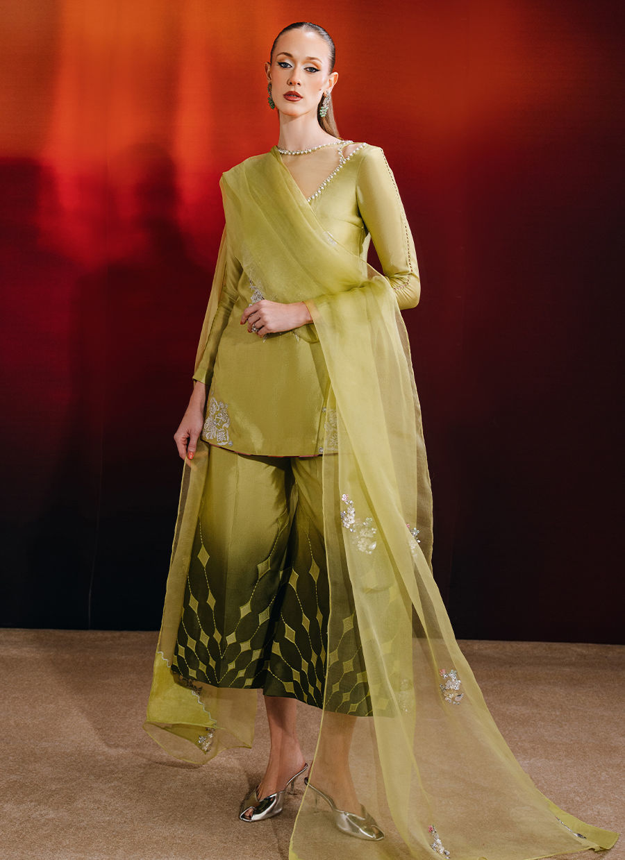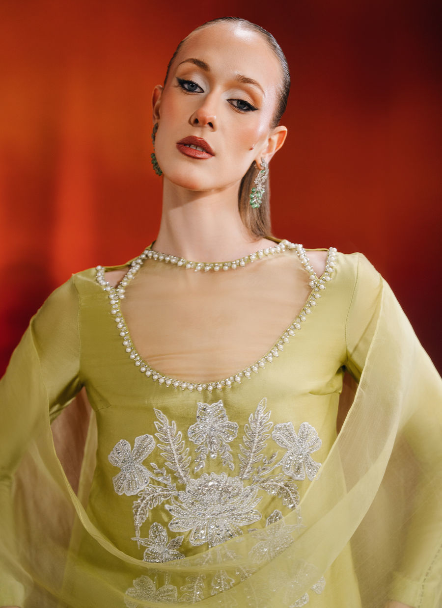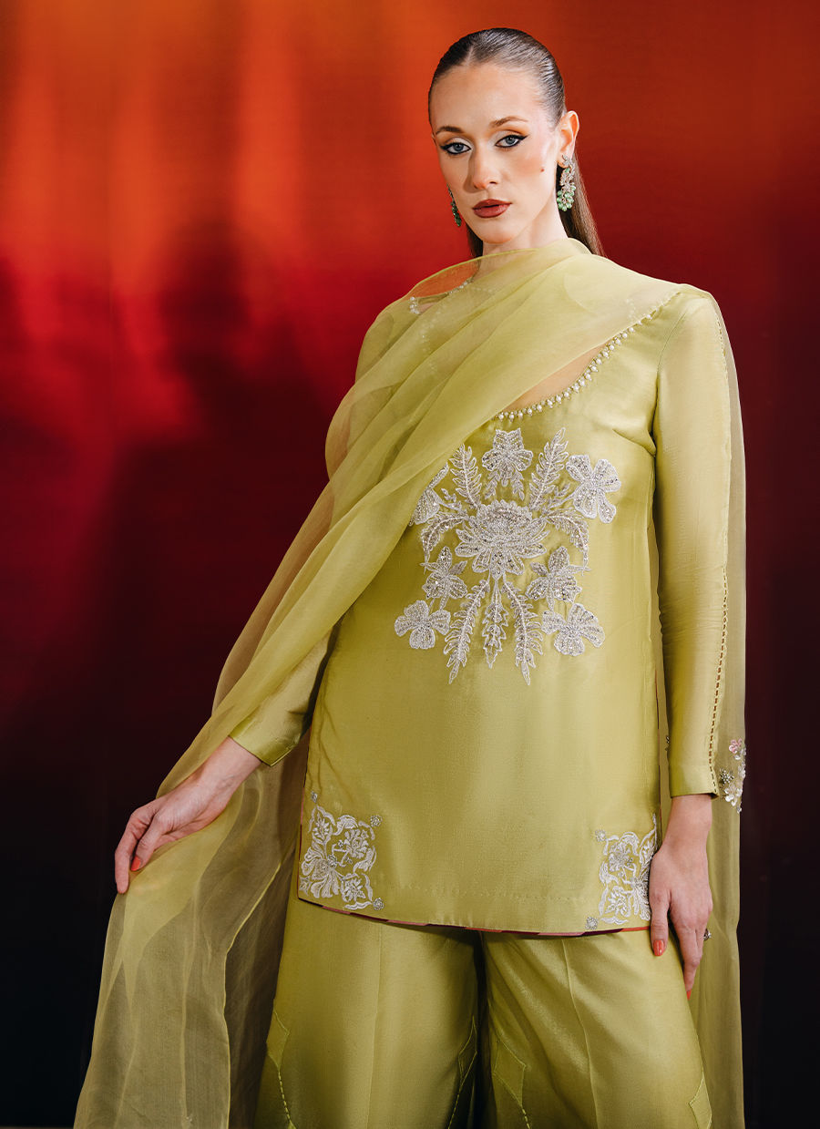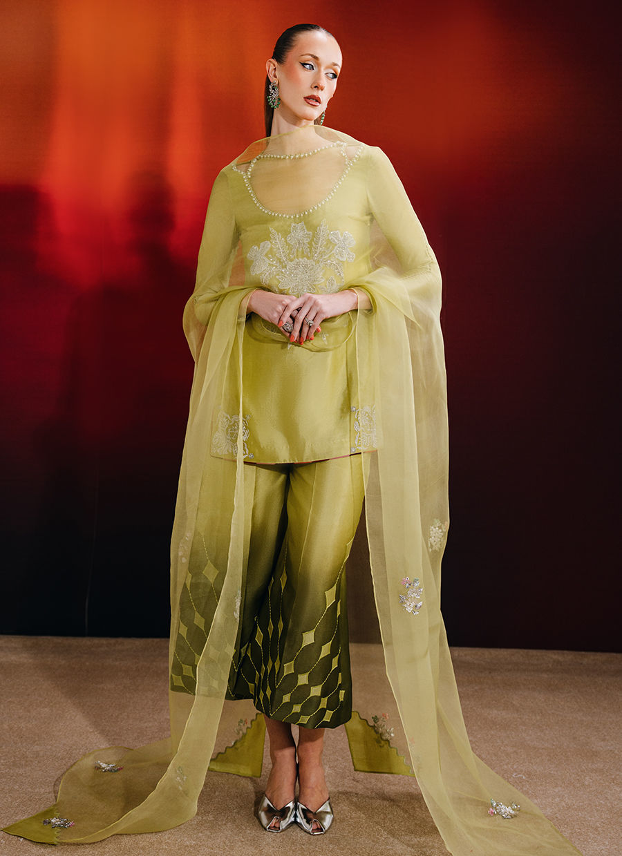 This lemon yellow ensemble features a mid-thigh short shirt paired with an ombré culotte and a sheer organza dupatta, creating a fresh yet refined silhouette. The shirt is adorned with exquisite hand-embroidered florals, delicately embellished with dabka, crystals, sequins, and pearls, and finished with an organza neckline featuring cut-out detailing highlighted by hand-embellished borders. Lace inserts on the sleeves add softness, while the ombré culotte is elevated with intricate embroidered detailing for graceful movement. The look is completed with an organza dupatta, beautifully accented with embellished florals and detailed corners for an elevated finish.