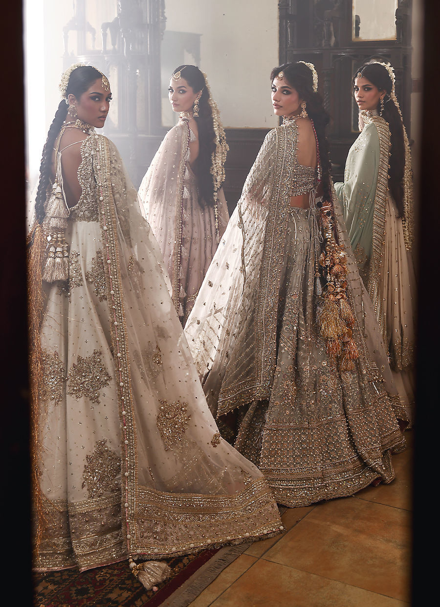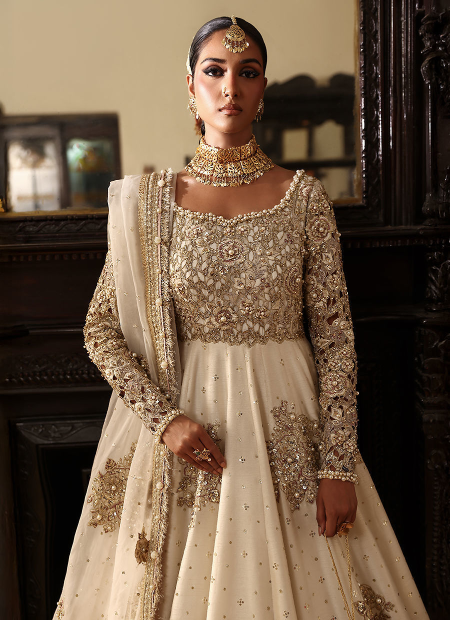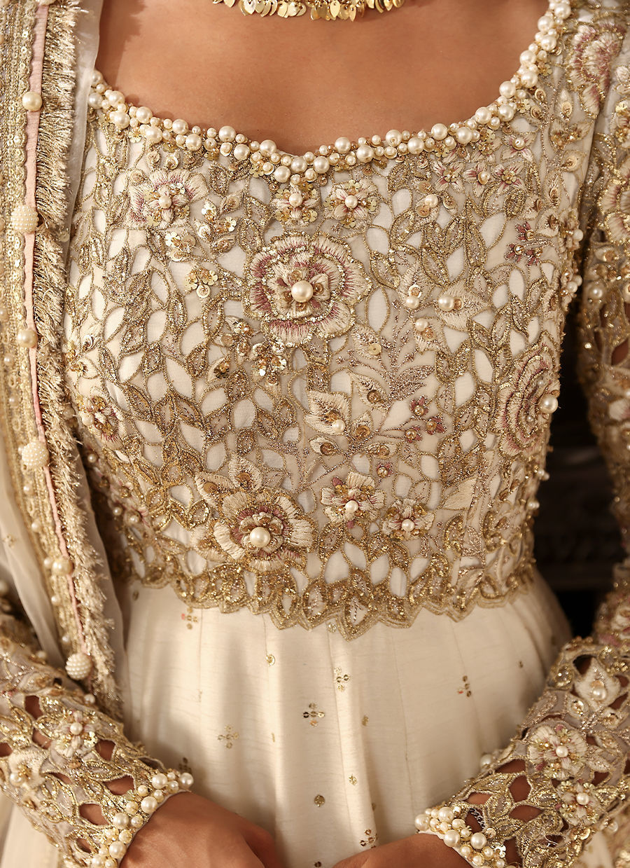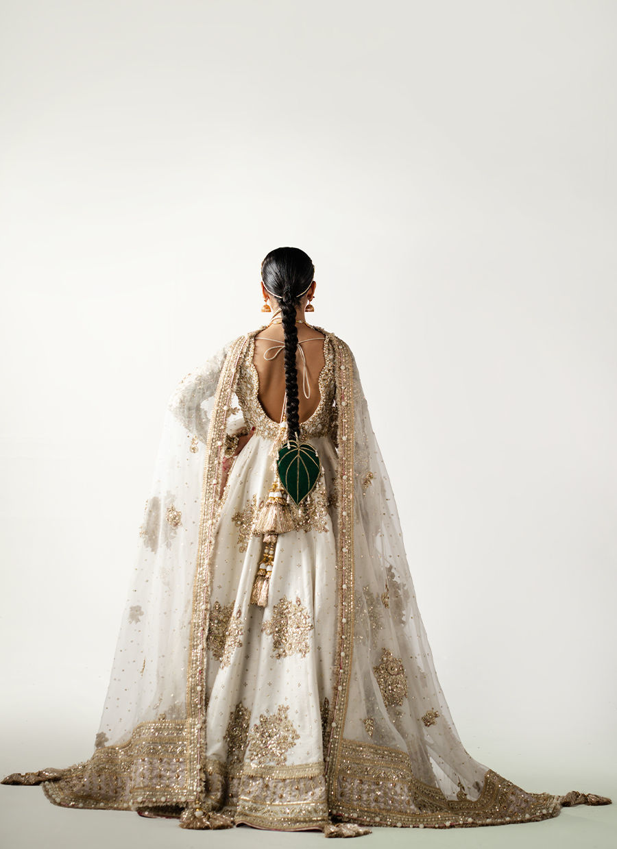 Modern grace meets classic tradition in this white Indian-silk peshwas, delicately sprinkled with chan. The bodice and sleeves feature intricate 3D cutwork appliqué, pearls, naqshi, and hammered detailing. Paired with a dreamy organza dupatta finished with kiran edging — effortlessly refined and eternally elegant.