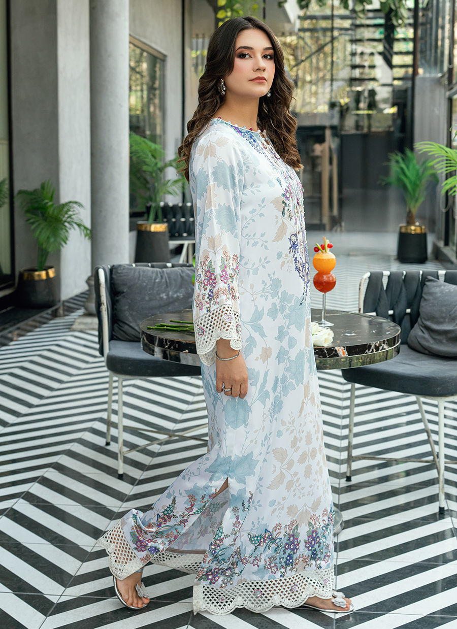 This elegant kaftan is crafted on a soft ivory-white base, delicately adorned with a high-definition digital floral print in soothing tones of powder blue, soft aqua, muted teal, lavender, lilac, blush pink, and warm beige. The balanced color palette creates a fresh, airy, and refined look, perfect for graceful daytime wear.