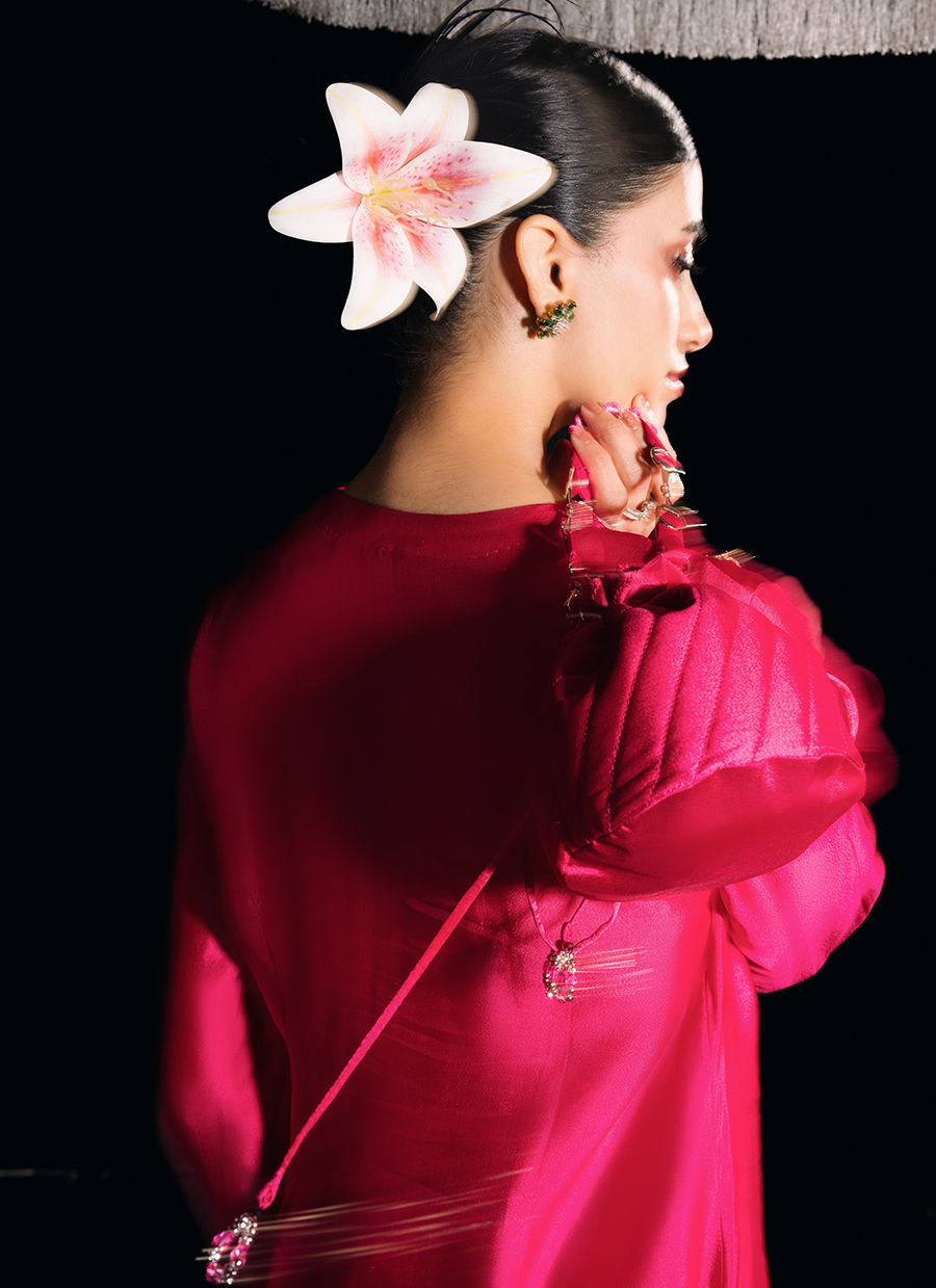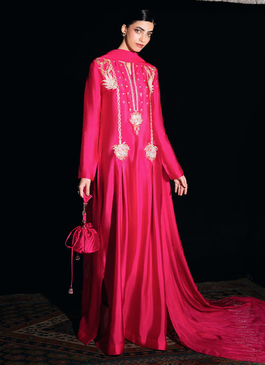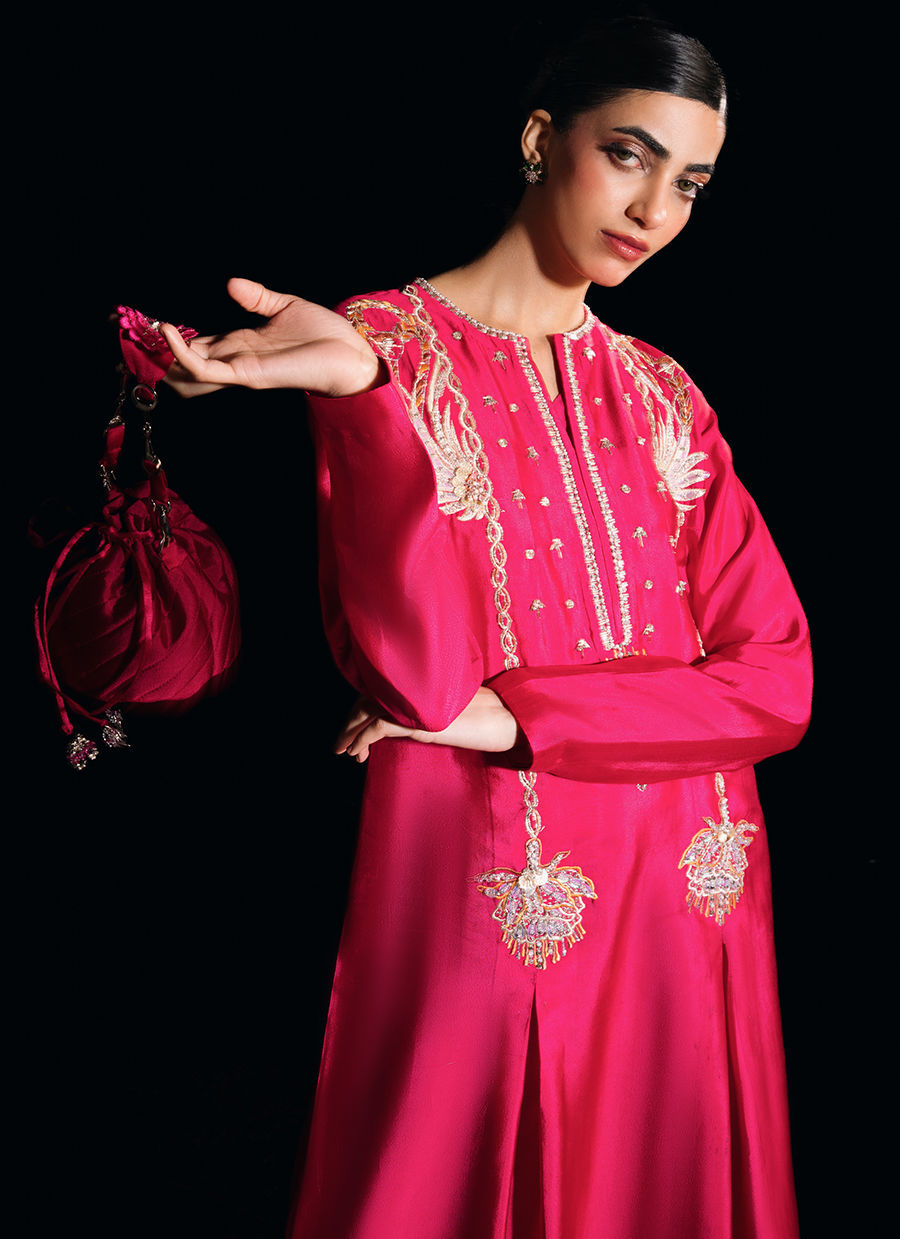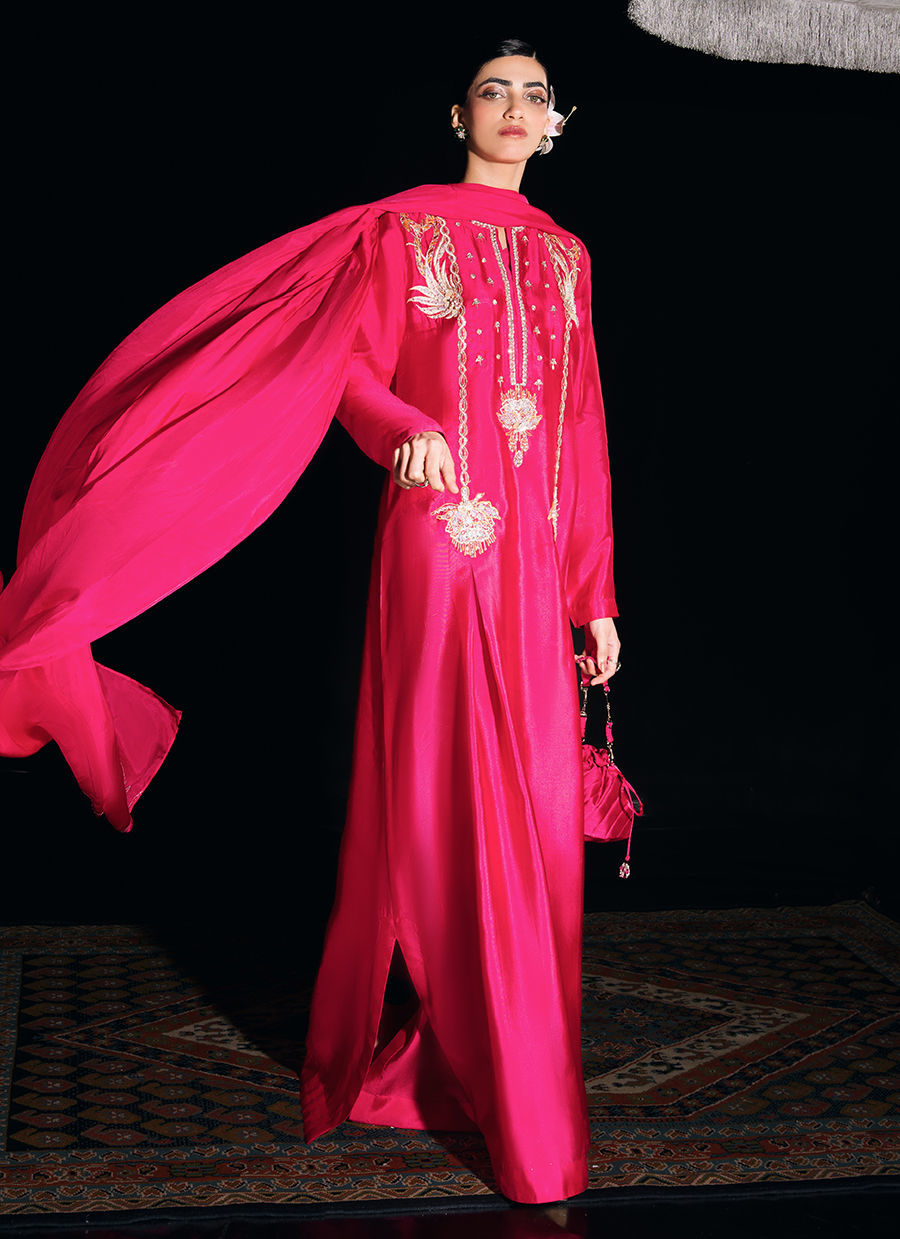 Color: Hot Pink Fabric: Kaaftan (Tissue Silk), Cigarette pant (Thai silk), Dupatta (Medium silk) Work Details: Hand-Emberoidered And Embellished