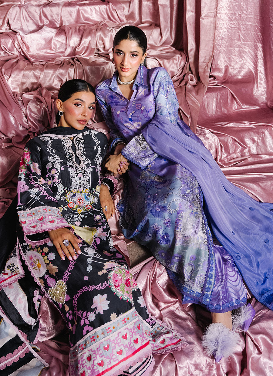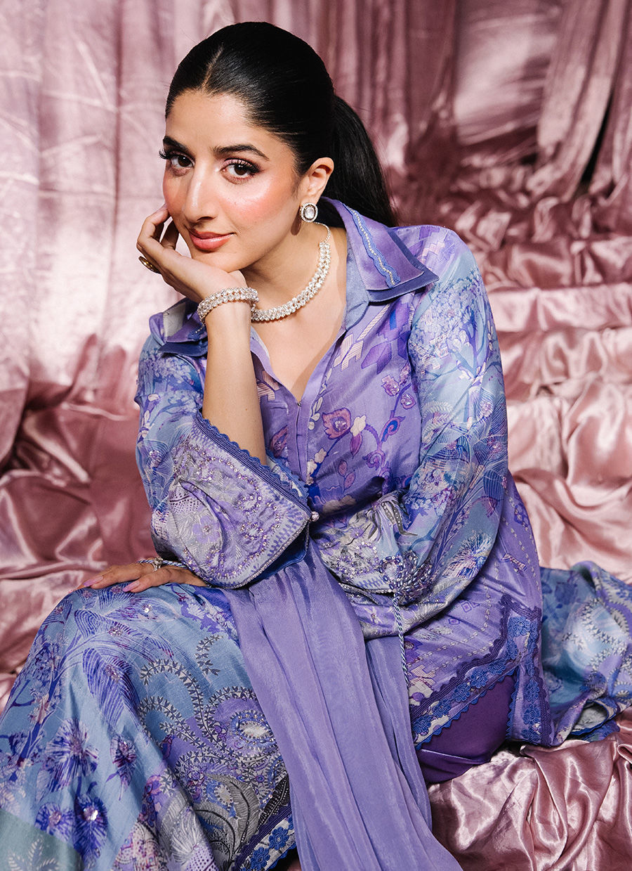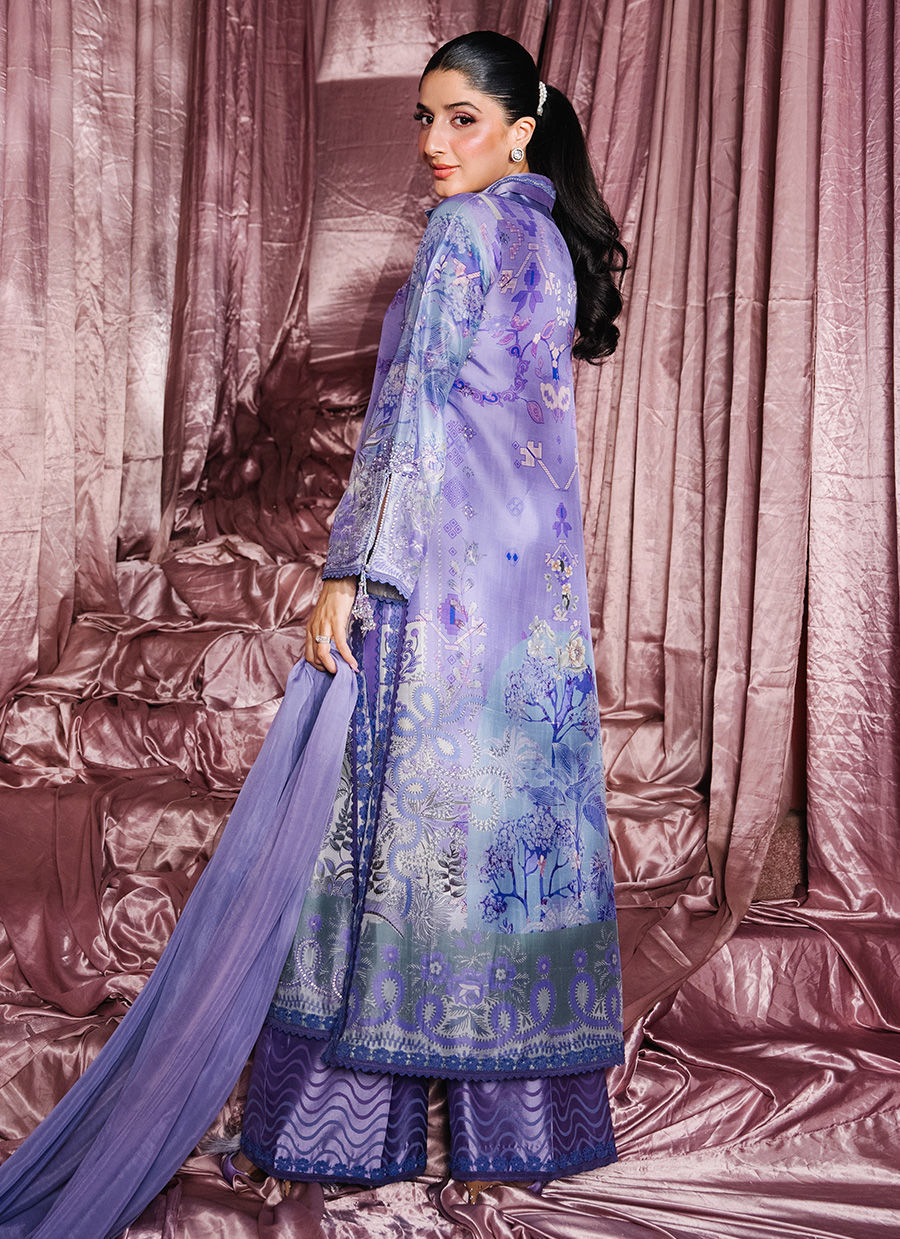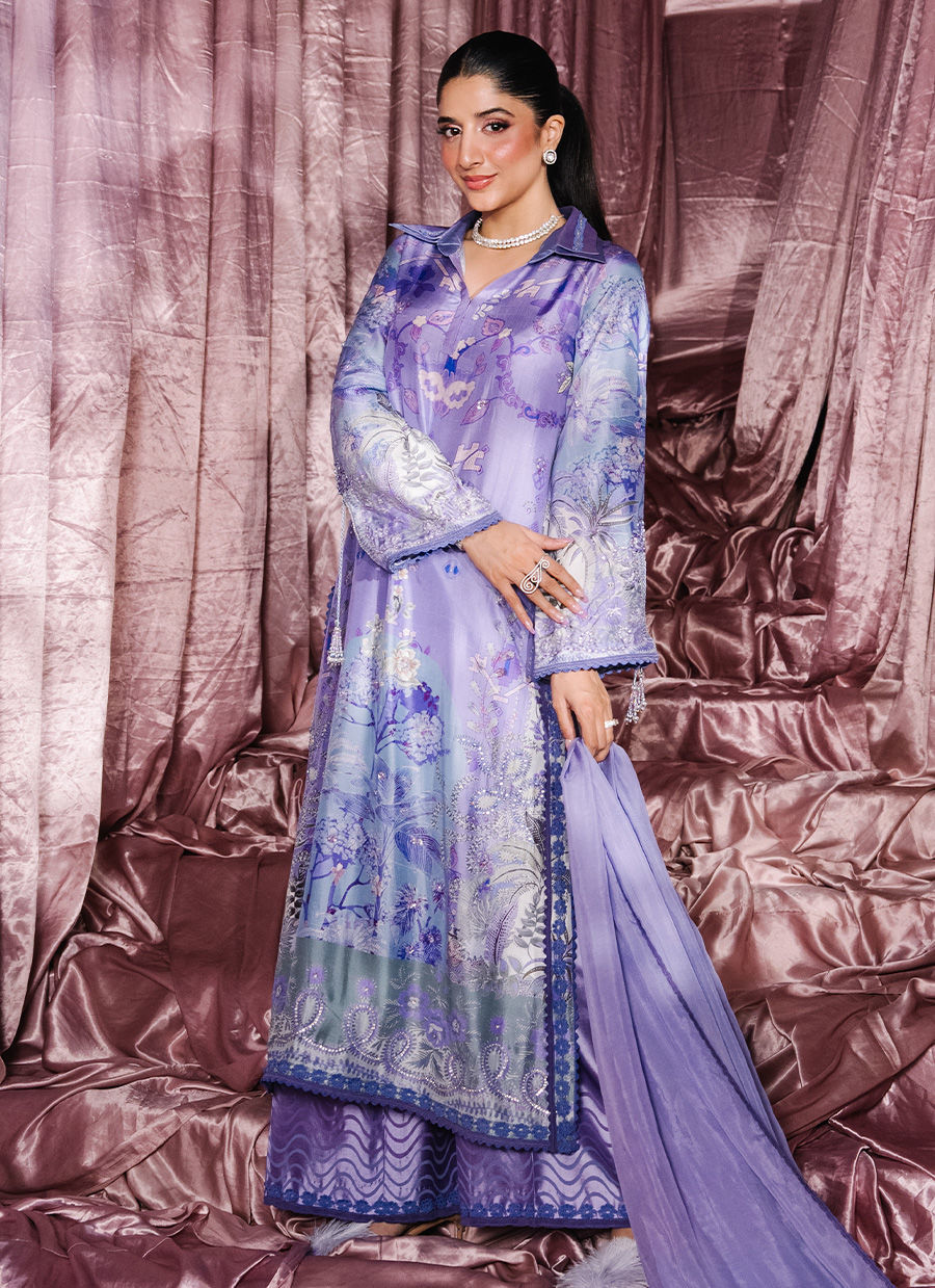A regal purple long shirt designed with a distinctive double collar, brought to life through refined monochromatic detailing. Hand-embellished accents and delicate lace inserts add depth and artisanal charm to the silhouette. The sleeves feature elegant slits finished with tassel detailing. Paired with a beautifully crafted ombré dupatta adorned with lace edging and delicate floral botis, the look is completed with luxurious sheesha silk pants, enhanced with block prints and lace details. An effortlessly elegant ensemble that blends tradition with contemporary finesse.