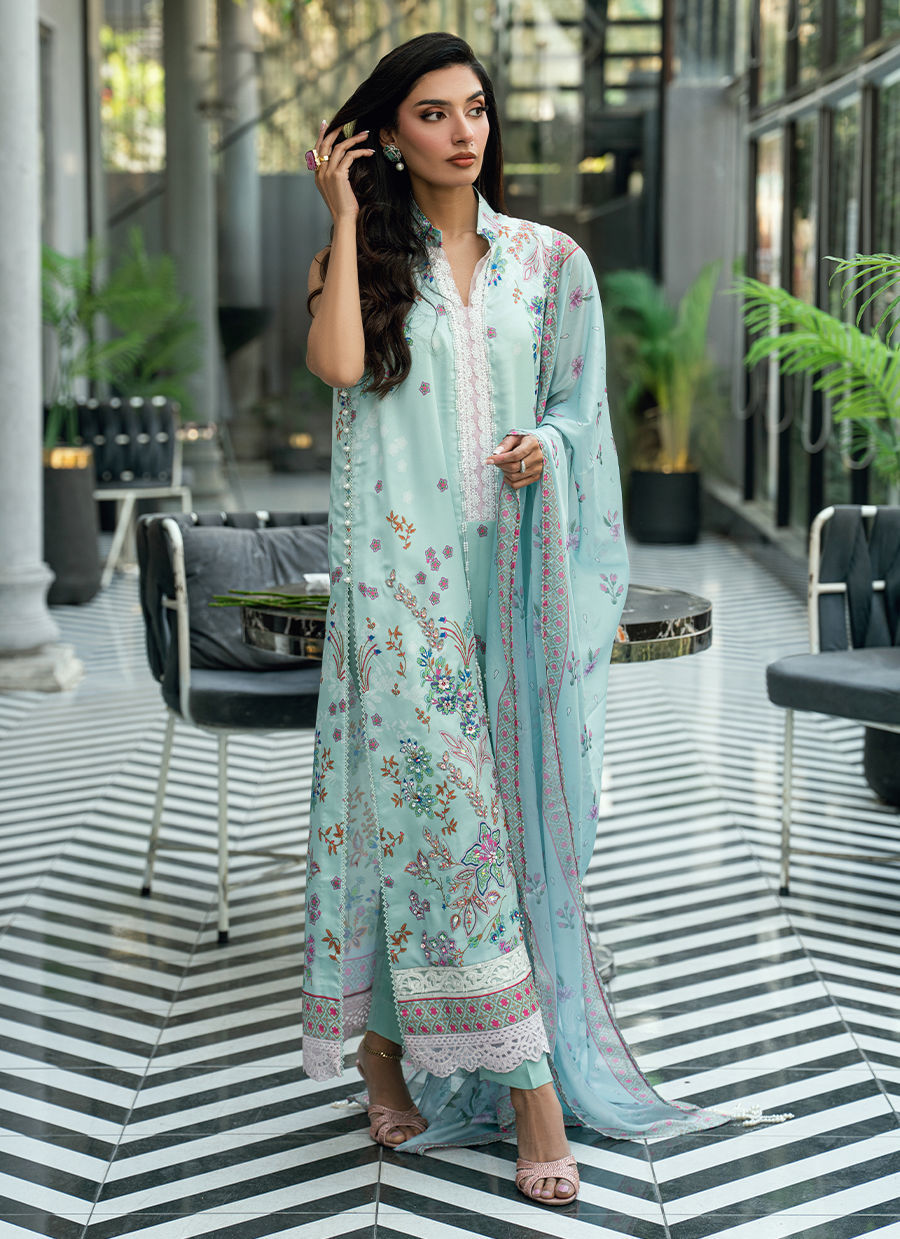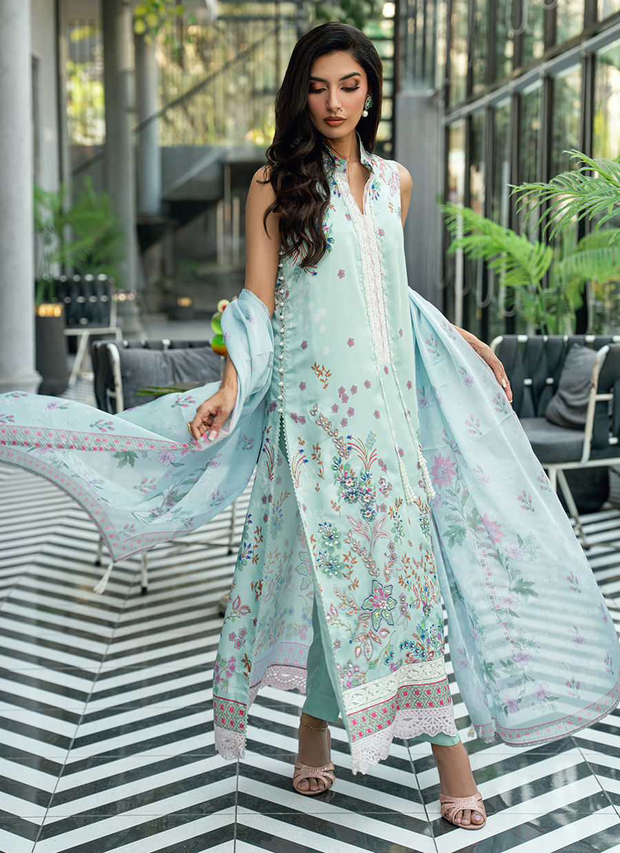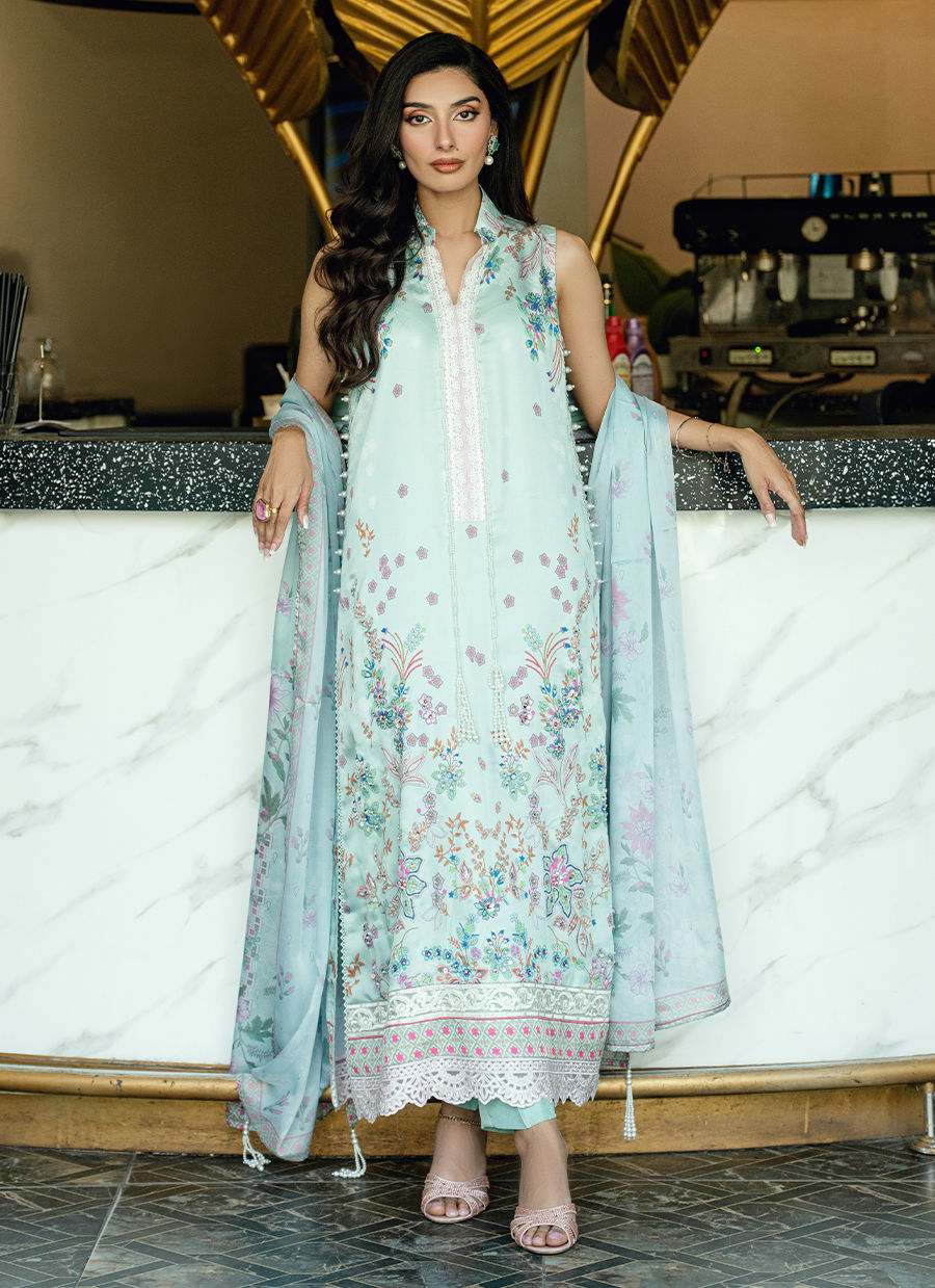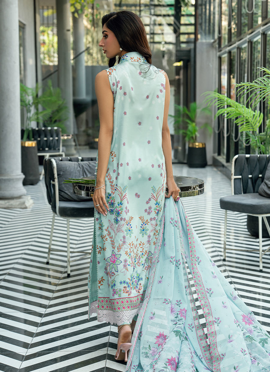 This elegant three-piece outfit is crafted in a refreshing mint–aqua base, adorned with delicate digital floral prints in soft shades of blush pink, lilac, lavender, muted coral, ivory, and subtle hints of sage green. The color palette feels light, feminine, and refined—perfect for graceful daytime dressing.