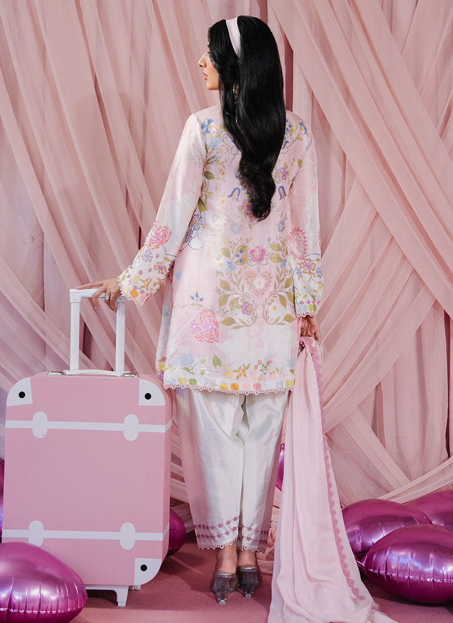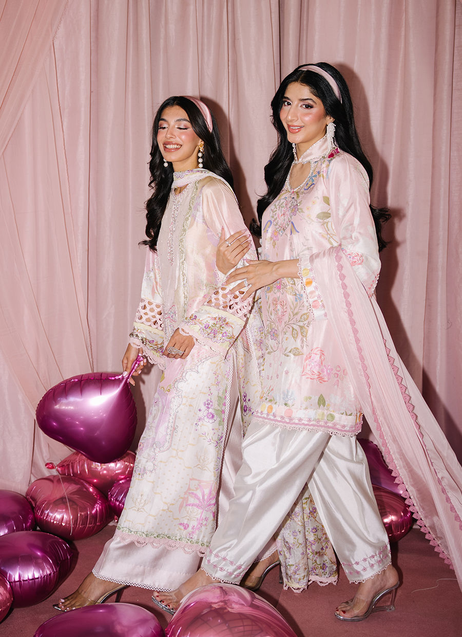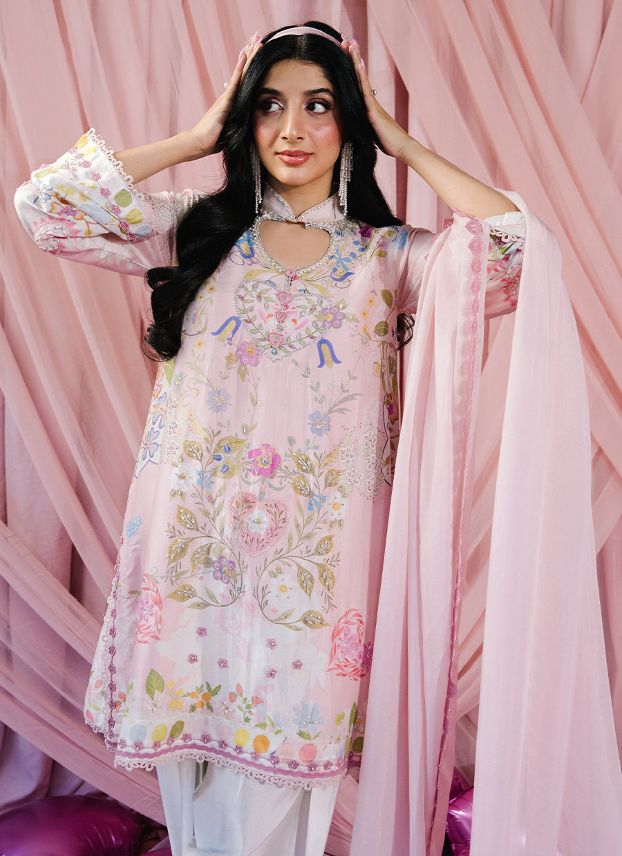 A charming blush pink short shirt paired with a classic white narrow shalwar, creating a soft yet statement-making silhouette. The shirt is adorned with delicate hand-embellished details and refined lace accents, beautifully framing a heart-shaped neckline finished with a subtle collar. Playful heart-shaped button detailing adds a romantic touch to the design. The look is complemented with luxurious sheesha silk pants enhanced with lace detailing, while a medium silk printed dupatta, finished with delicate lace edging, completes the ensemble with effortless elegance and feminine appeal.