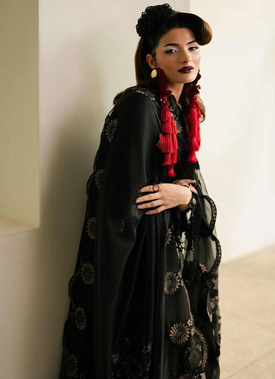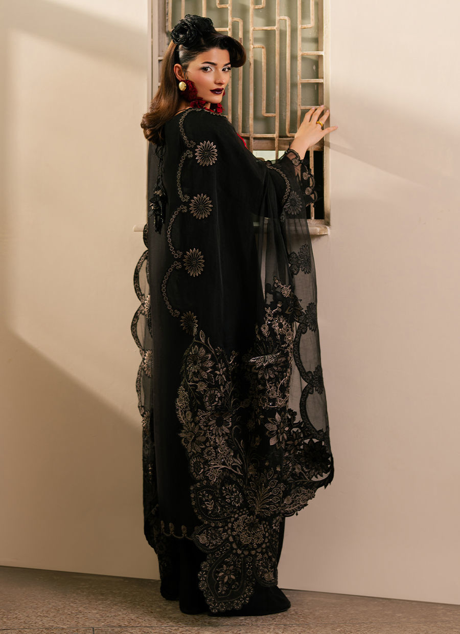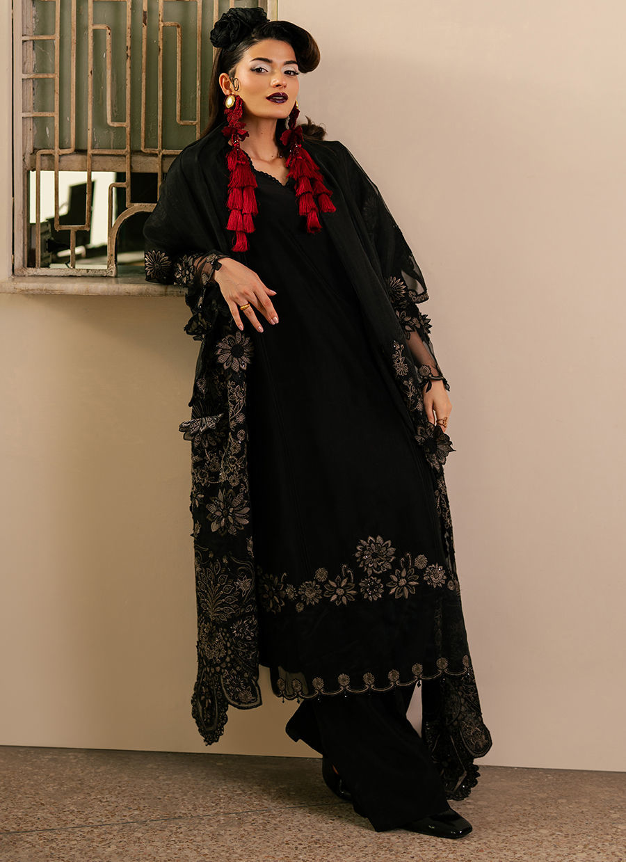 Color: Black Fabric: Shirt And Trouser: Rameen Silk, Dupatta: Chiffon Work Details: Embroidered