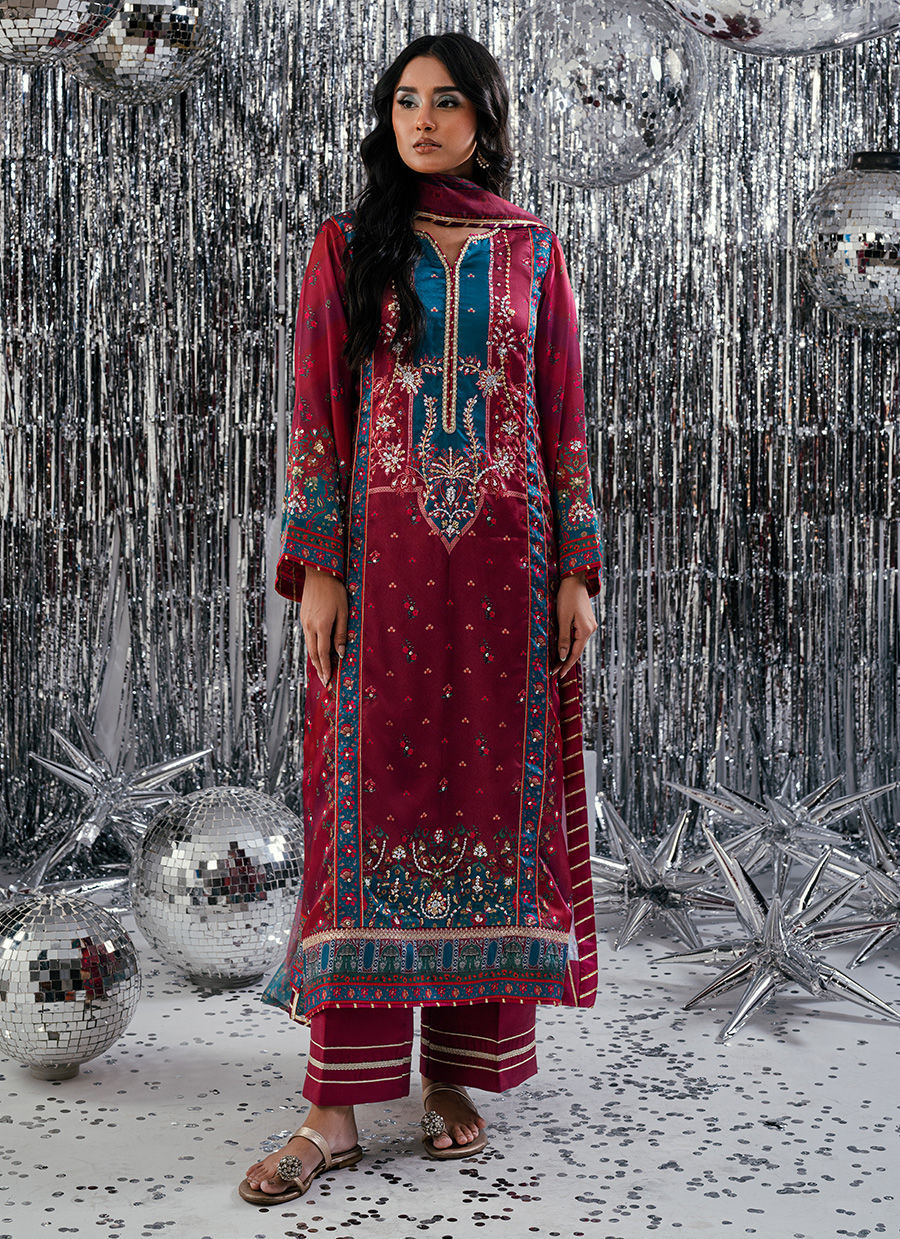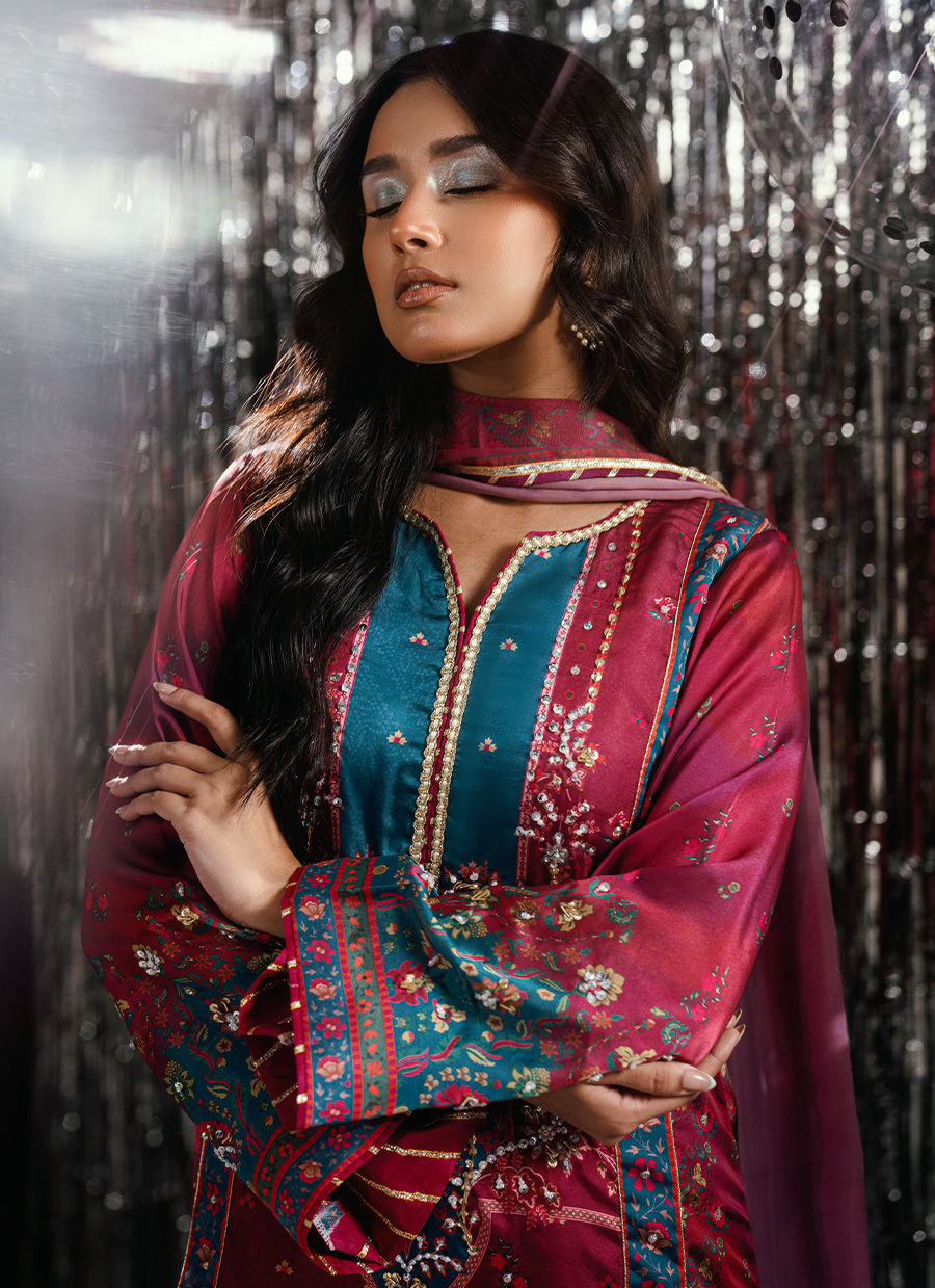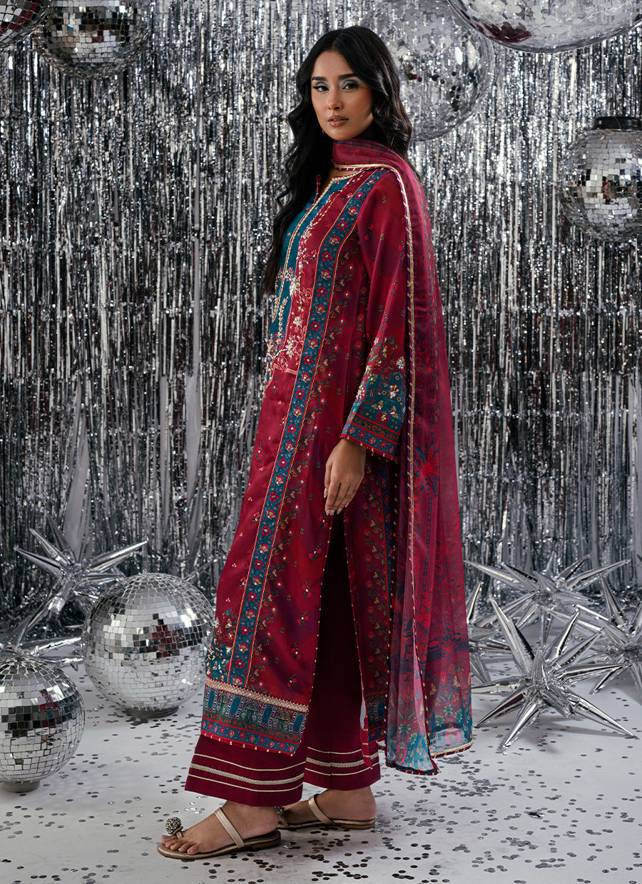 An elegant digital print ensemble featuring a long-length shirt in rich magenta tones, paired with a matching trouser. The design is enhanced with a self-digital pattern that exudes understated luxury. A beautifully composed digital print dupatta completes the look, adding depth and sophistication. Perfect for festive gatherings or refined daywear with a touch of modern tradition.
