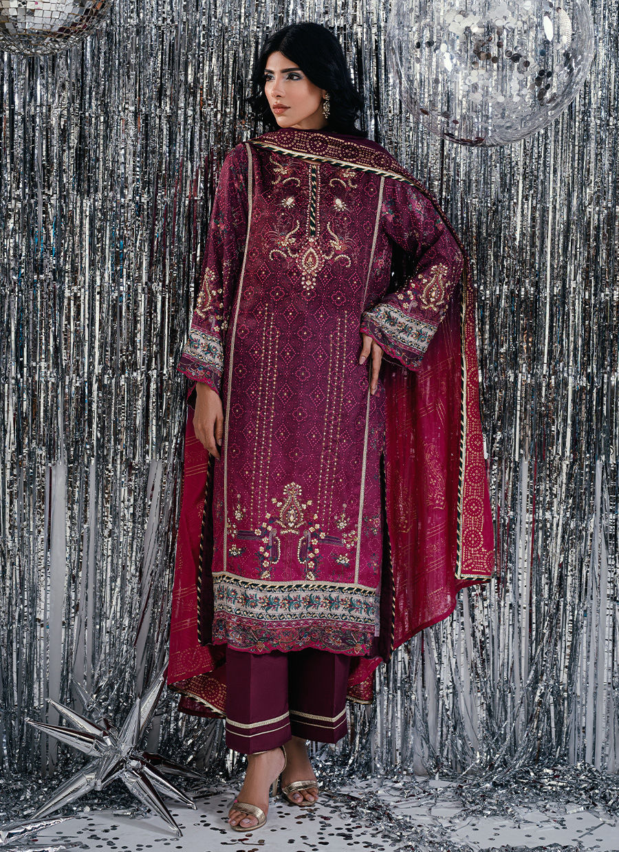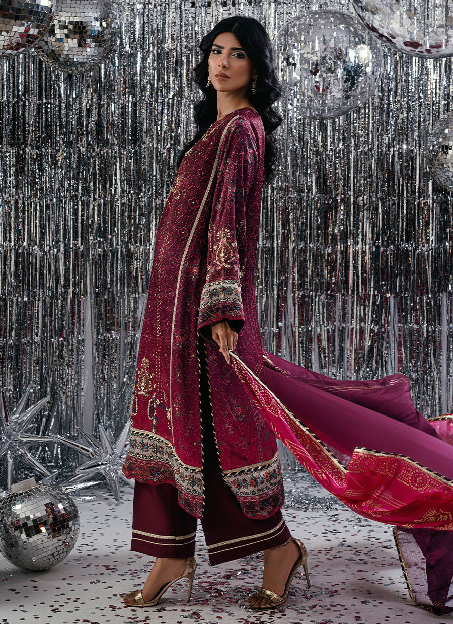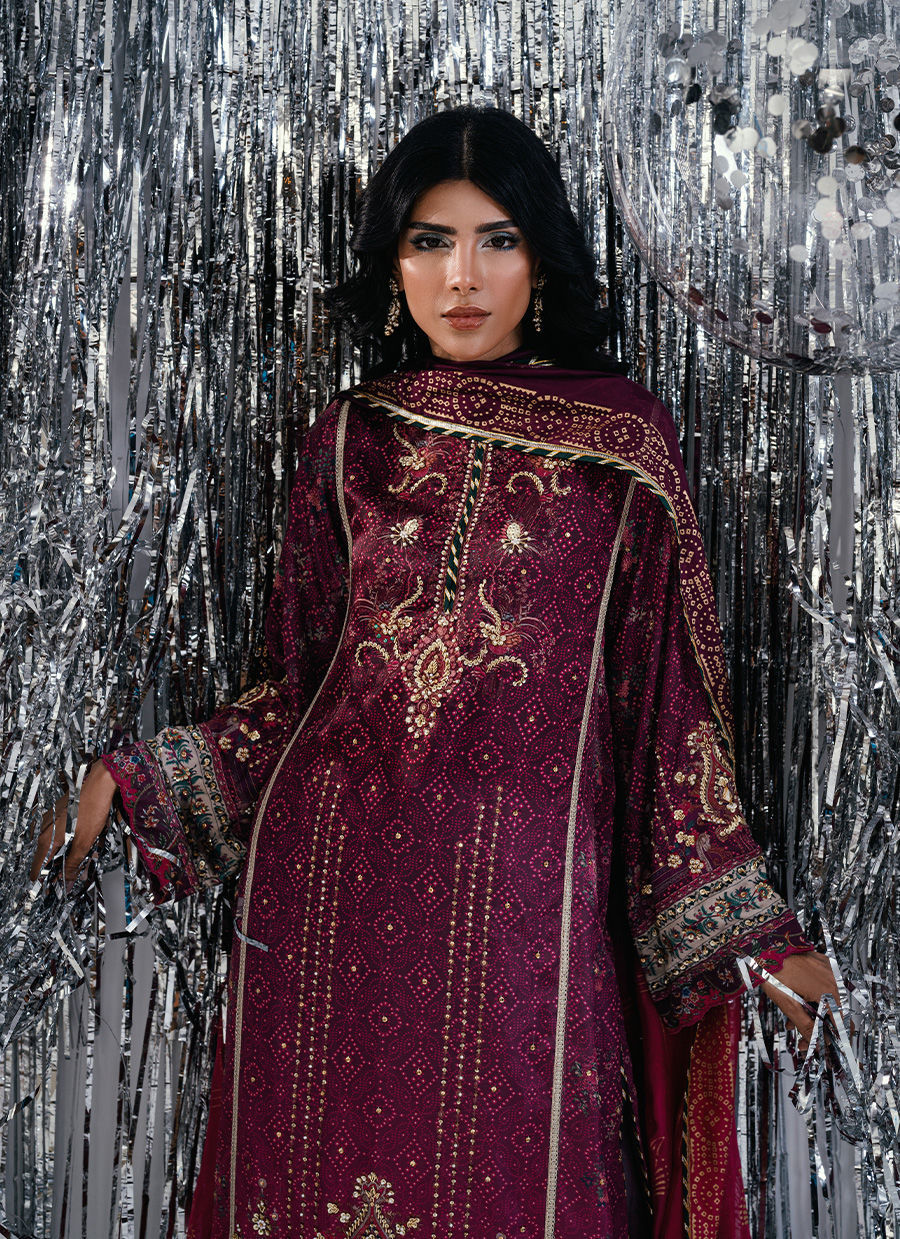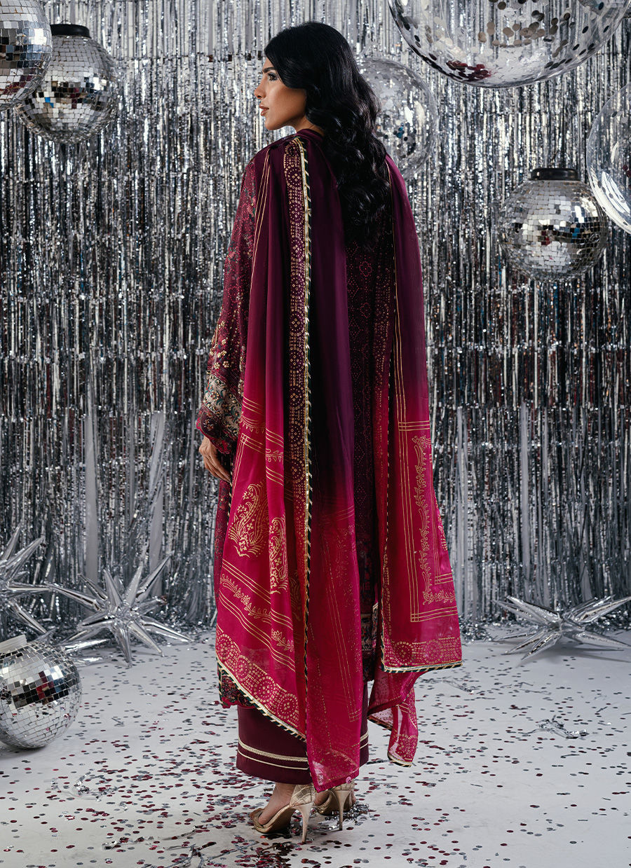 A refined expression of modern elegance, this ombre chundri ensemble features a self-digital printed shirt in rich magenta tones paired with a matching trouser. The look is beautifully completed with a handcrafted block-printed dupatta, adding a touch of tradition to its contemporary silhouette. Perfect for festive occasions and effortless sophistication.