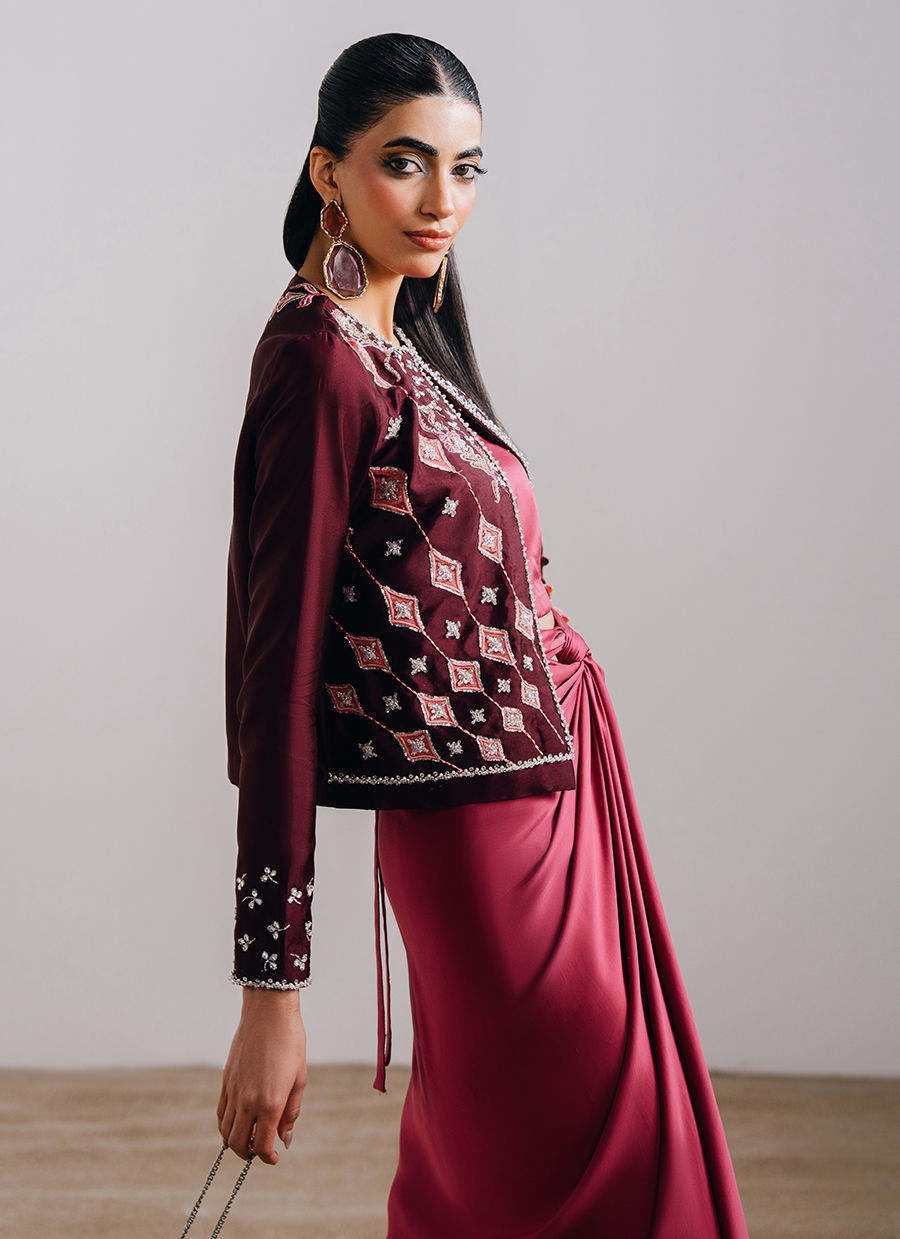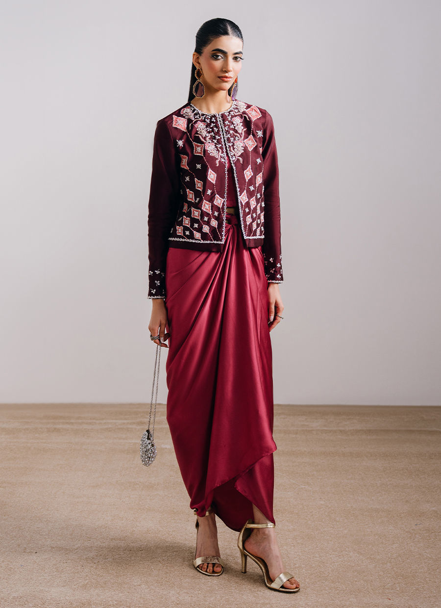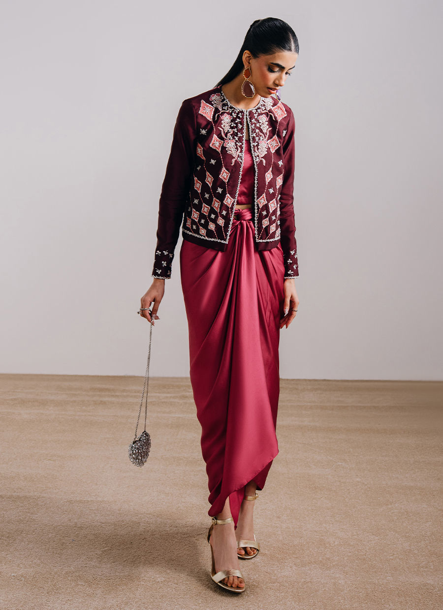 This maroon ensemble features a round-neck, front-open jacket paired with a flowing skirt, creating an elegant and contemporary silhouette. The jacket is adorned with exquisite hand-embroidered and embellished florals, complemented by embroidered and embellished sleeve detailing for a refined finish. It is paired with a flowy wrap-around chiffon skirt, adding graceful movement and completing the look with effortless sophistication.