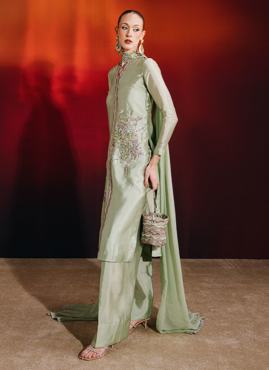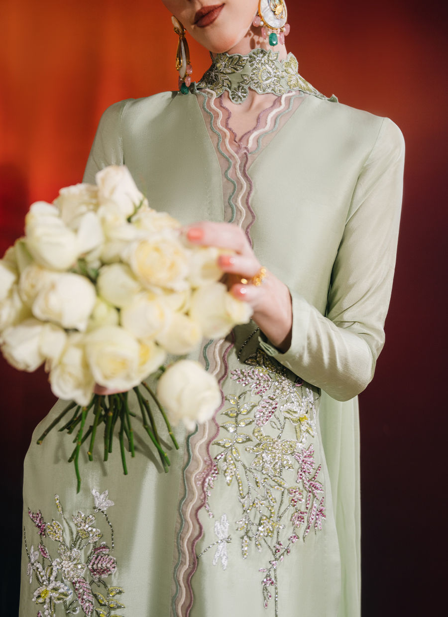 This mint ensemble features a knee-length shirt paired with a farshi shalwar and an embroidered chiffon dupatta, creating a graceful and elevated silhouette. The shirt is adorned with exquisite hand-embellished florals, enhanced with crystals, sequins, and kut dana, and finished with embroidered scalloped borders on the front for added detail. The farshi shalwar adds volume and movement, while the chiffon dupatta, detailed with an embroidered border and pleat accents, completes the look with refined elegance.
