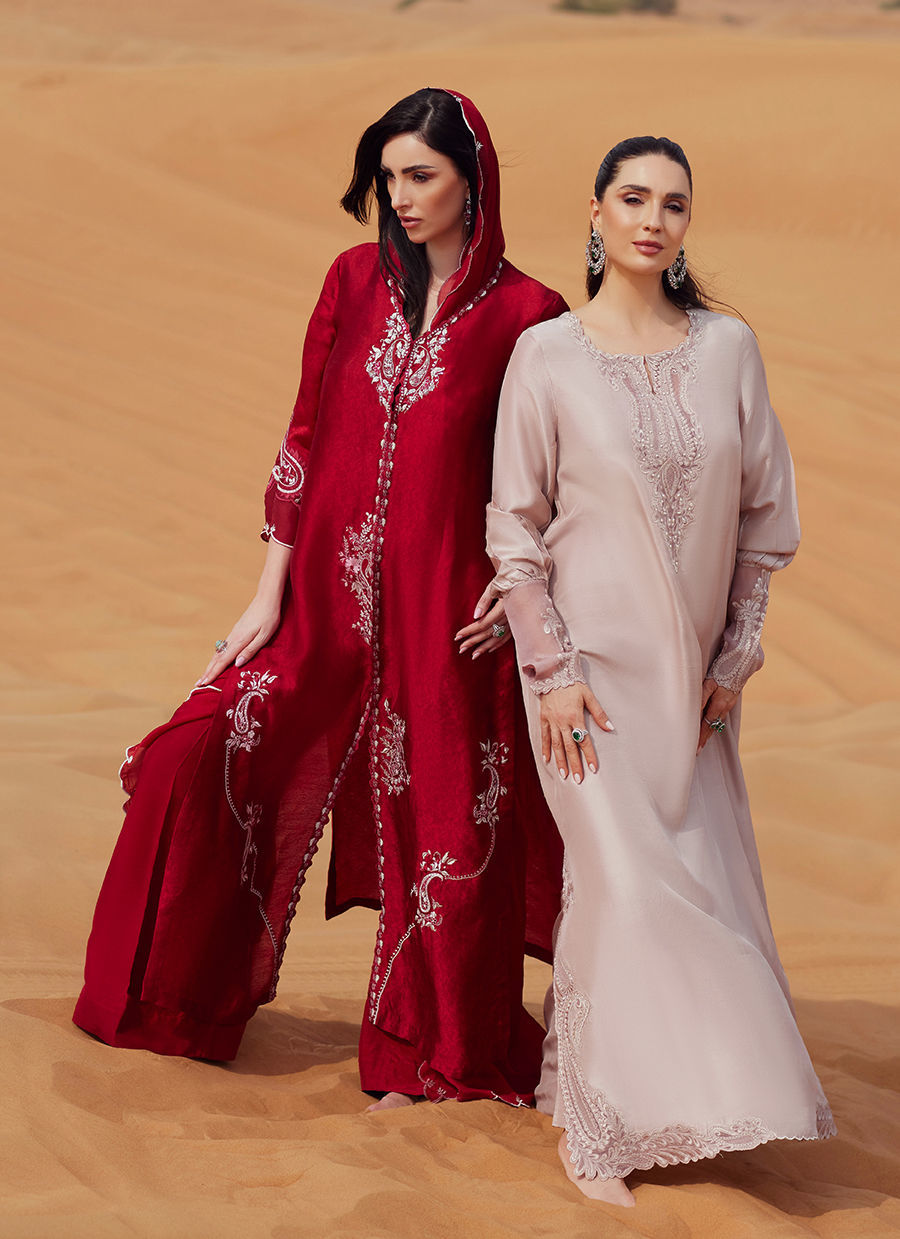 A pure raw silk shirt designed in a fluid kaftan silhouette, elevated with intricate embroidery and pearl embellishments along the neckline. Detailed cuff sleeves feature refined embroidery, adding structure and elegance. Paired with a tailored Korean silk cigarette trouser and finished with a KP silk scarf for a clean, contemporary look.