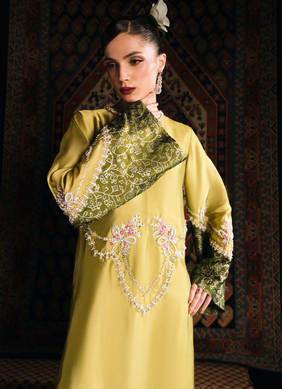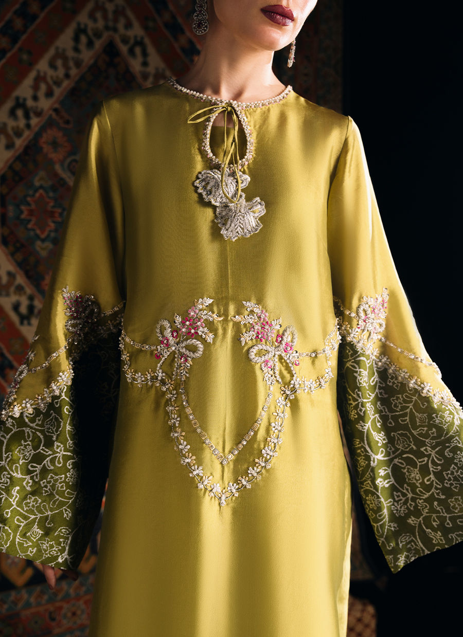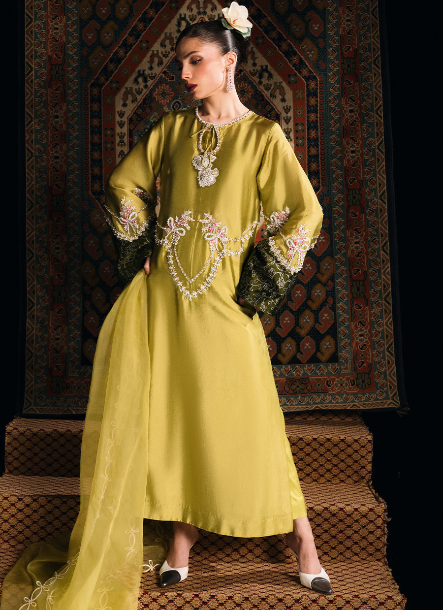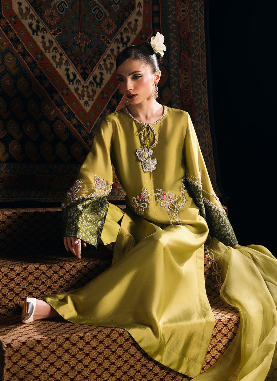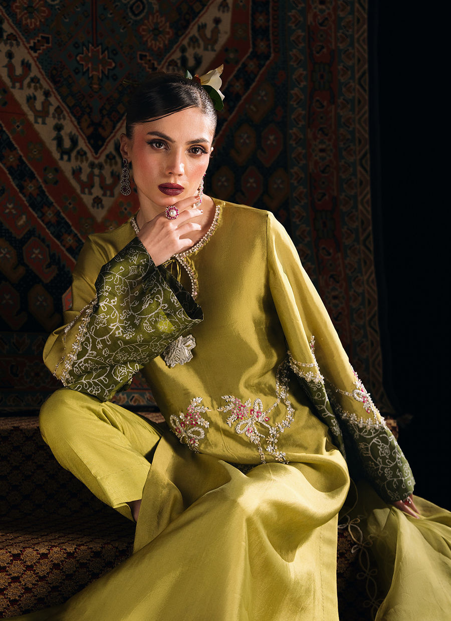 Color: Yellow Green Fabric: Shirt (Tissue Silk), Trouser(Thai silk), Dupatta (Organza) Work Details: Hand-Embroidered