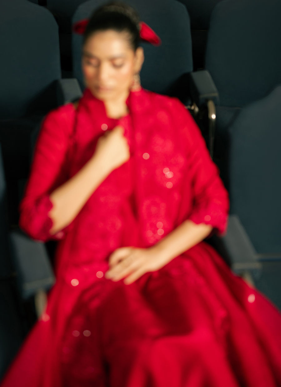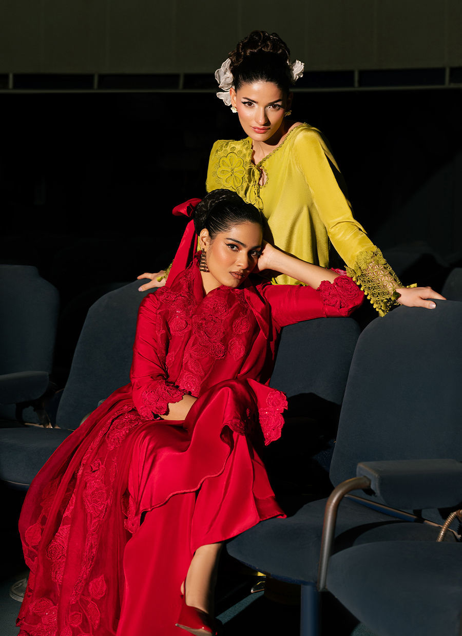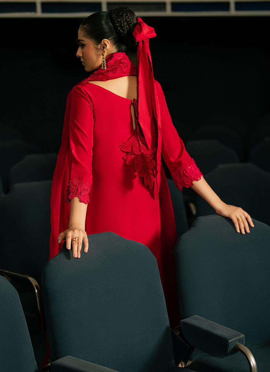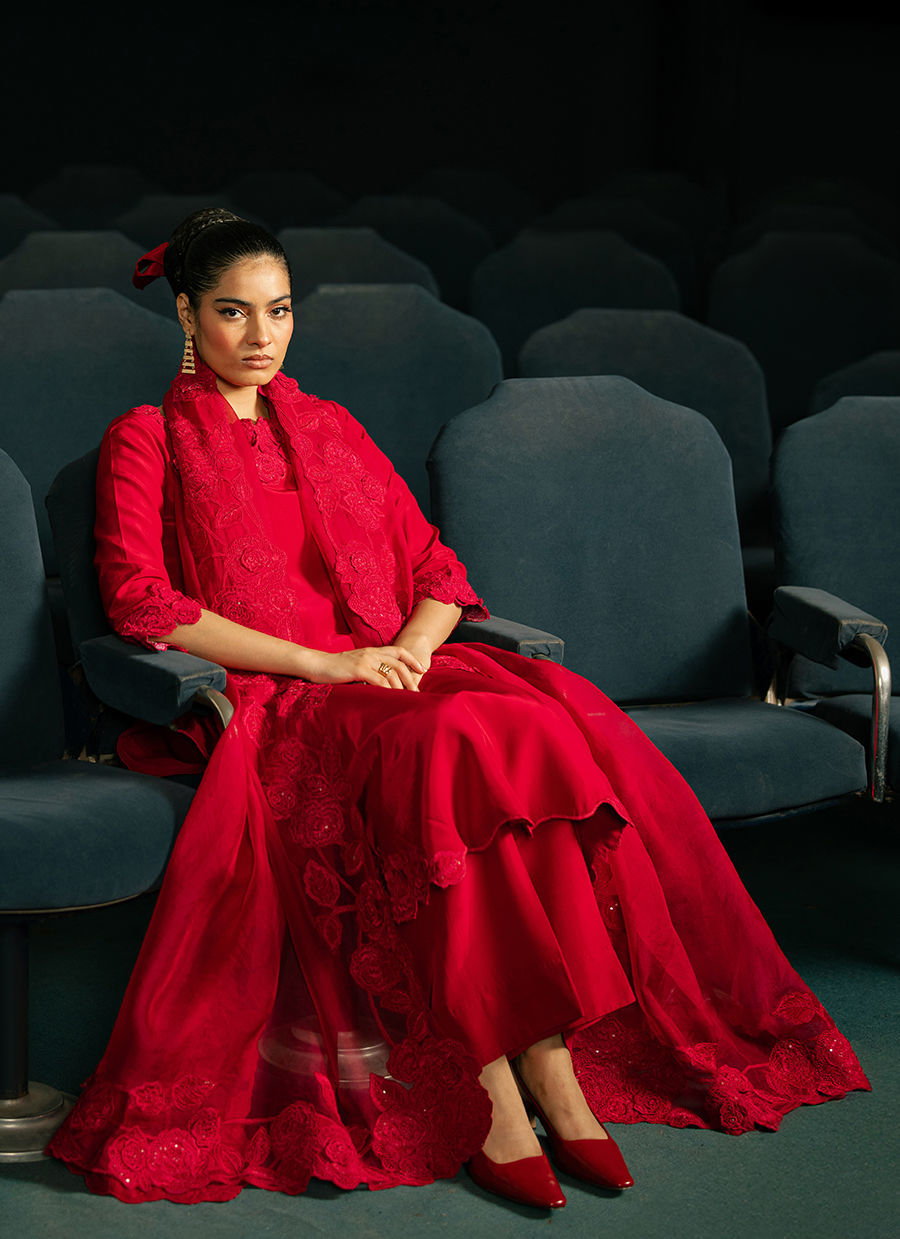 A luxurious silk shirt paired with matching silk trousers, finished with an intricately embroidered organza dupatta for an elegant and sophisticated ensemble.