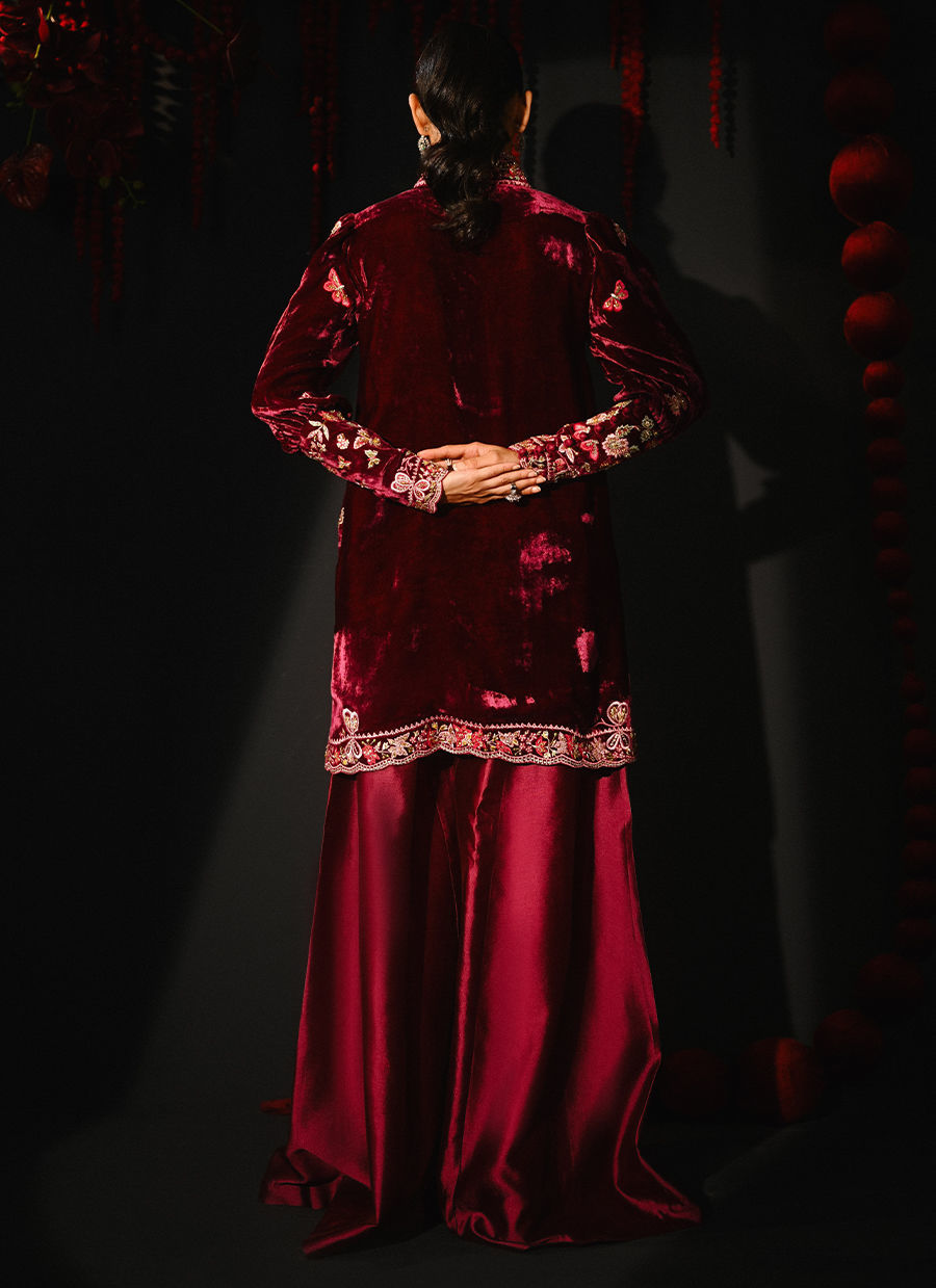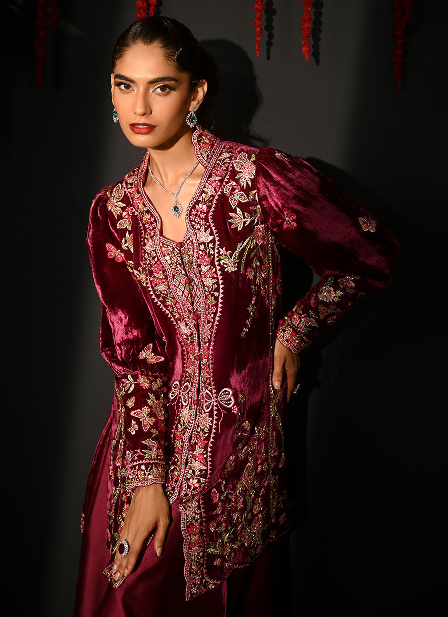 This striking magenta ensemble features a short front-open velvet jacket adorned with resham embroidery and intricate hand embellishments. The puffy sleeves add a touch of drama, while delicate floral and butterfly motifs bring a whimsical charm. Paired with flared sheesha silk pants, the look exudes contemporary elegance with a playful, feminine edge.