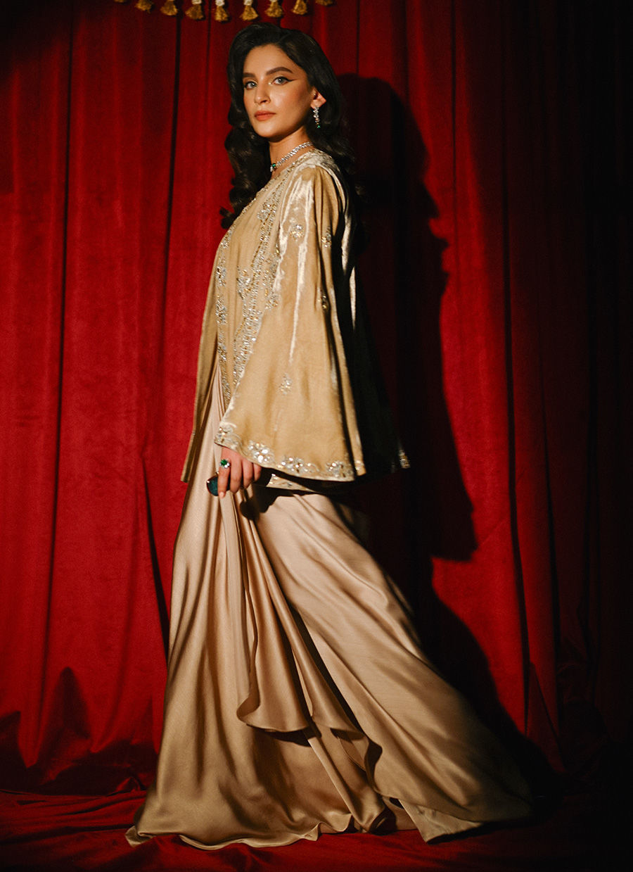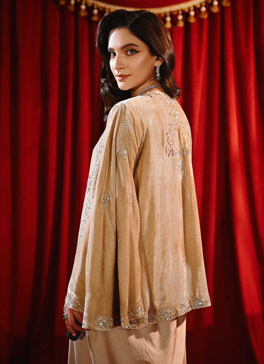 This beige ensemble features a front-open short velvet jacket adorned with exquisite hand embellishment in silver and gold tones. Delicate floral and bow-shaped embroidery, accented with gota, sequins, and cut dana work, adds richness and texture. Paired with a shamoos bandeau and a gracefully draped skirt, this look perfectly balances traditional artistry with modern elegance.
