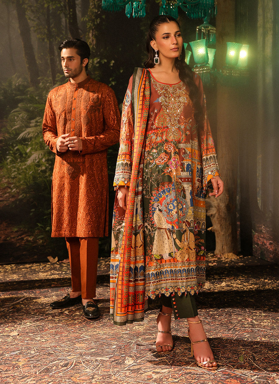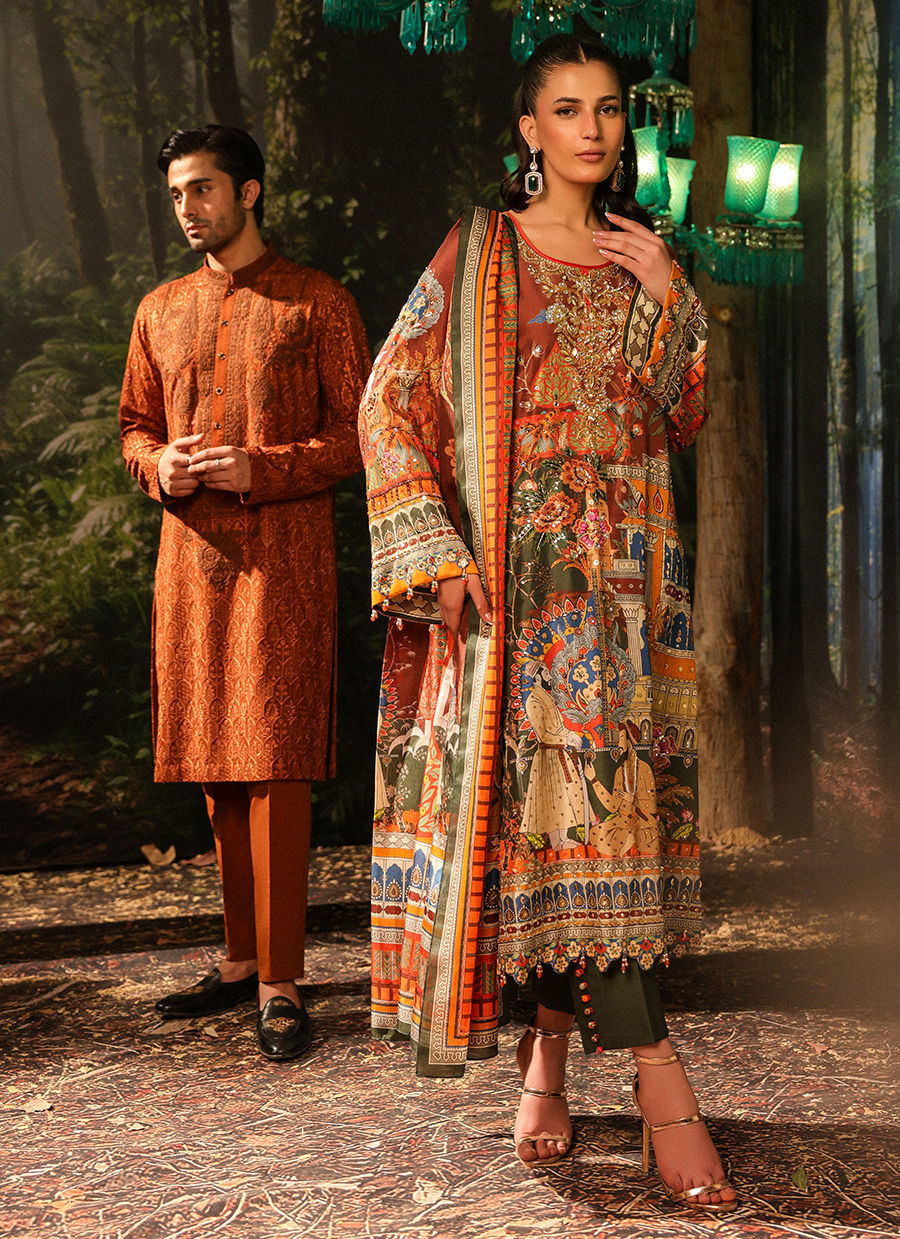 Intricate crystal and sequin detailing on a fun Mughal printed ensemble, with a rich gold neckline.