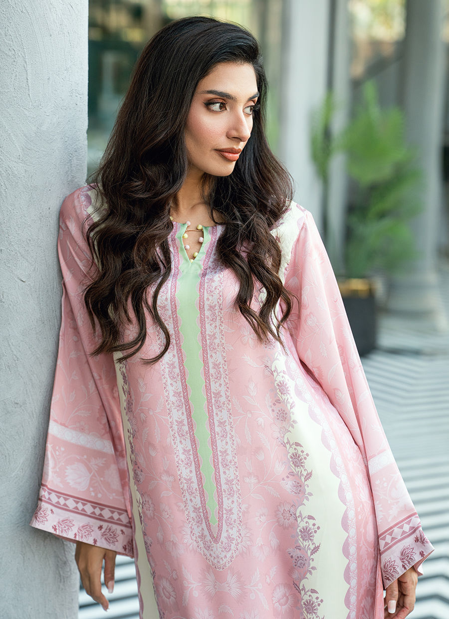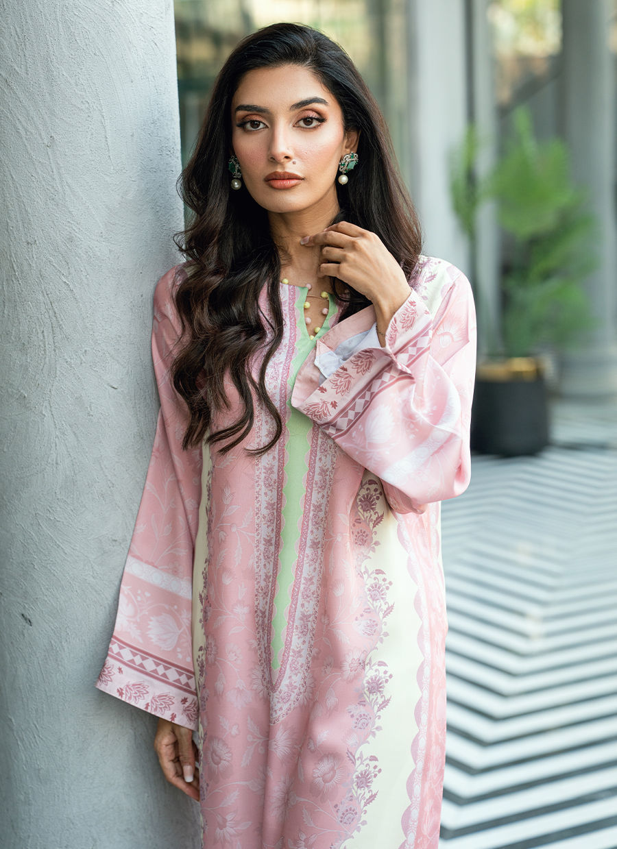 This elegant kaftan is crafted in a soft blush pink base, beautifully contrasted with ivory panels and borders. The design features a delicate digital floral print in harmonious tonal shades, creating a refined and feminine aesthetic.