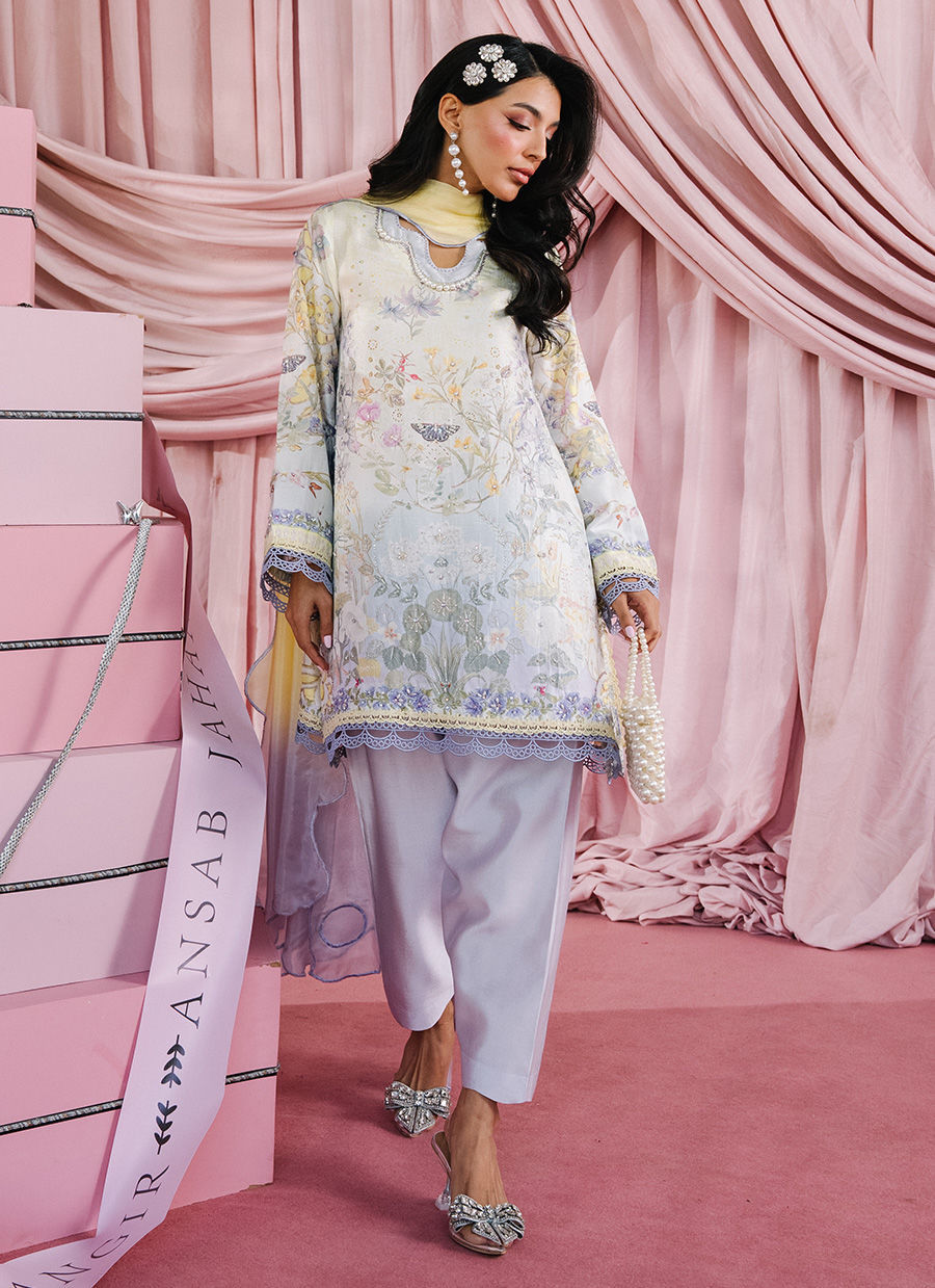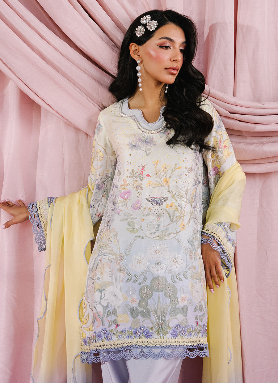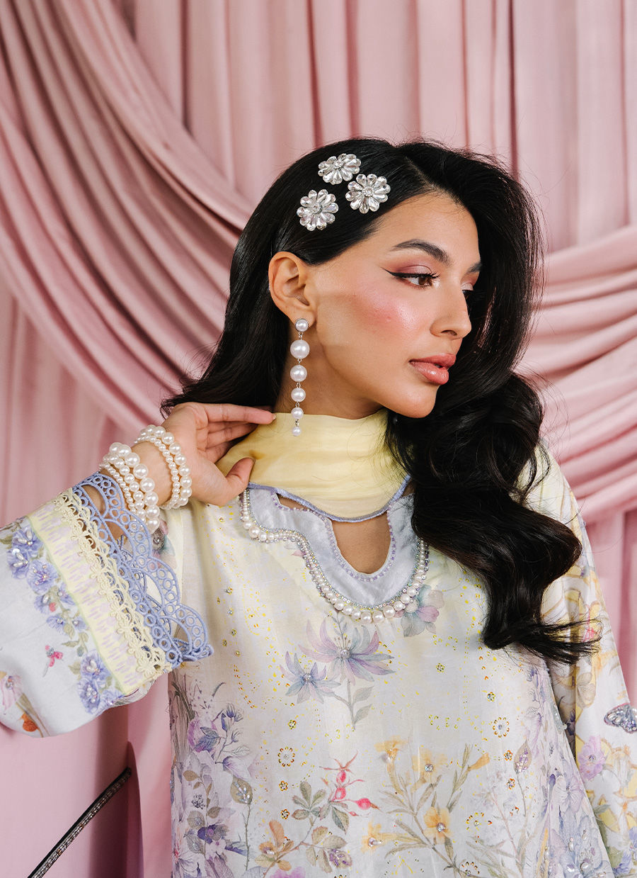 A short raw silk shirt featuring pearly neckline detailing, enhanced with subtle cut-dana and pearl embellishments over a fresh, bloomy print. Paired with a Sheesha silk narrow shalwar and finished with a medium silk gradient scalloped dupatta for an elegant, refined look.