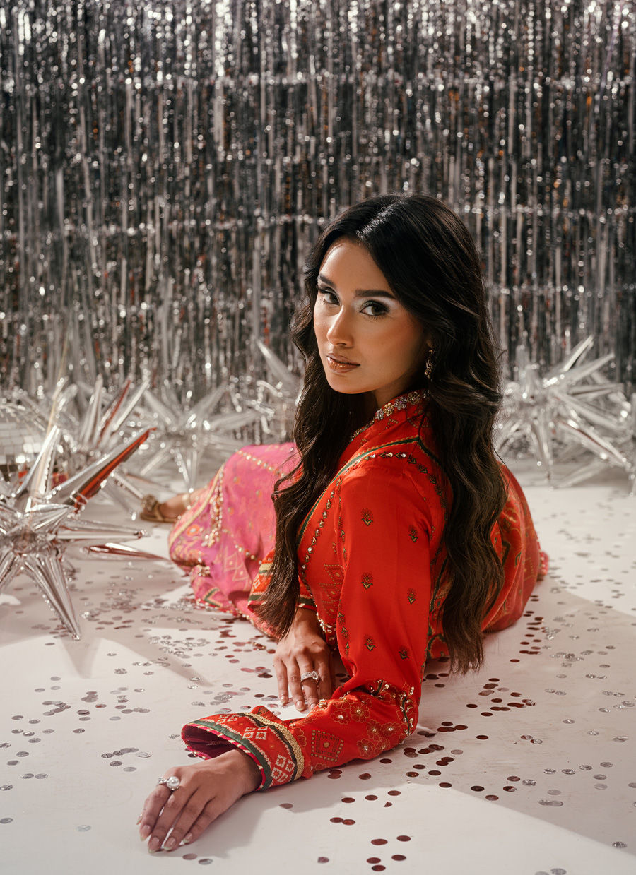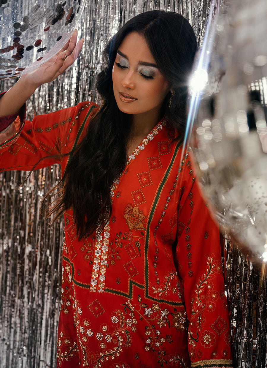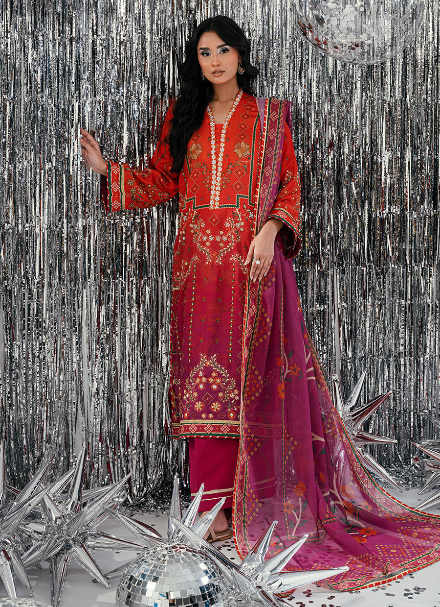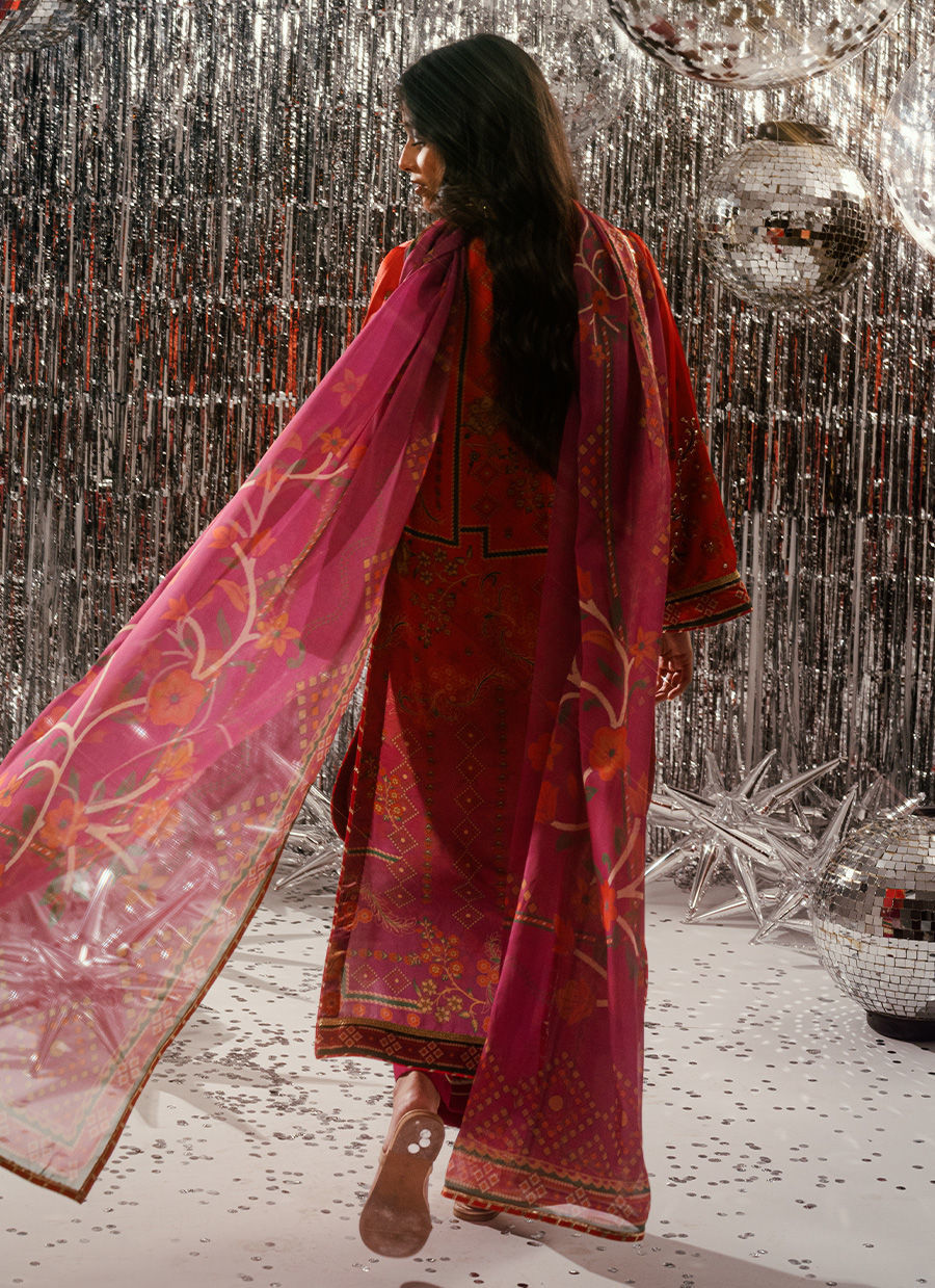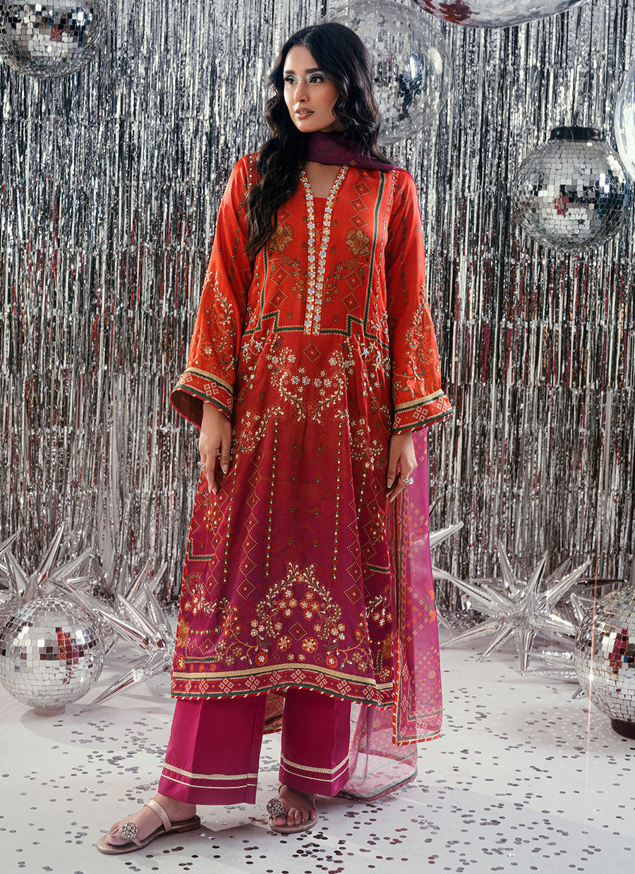 A radiant expression of color and craftsmanship, Sunlit Umber brings together shades of burnt orange and magenta in a mesmerizing digital print that reflects warmth and vibrance. The long shirt features a contemporary composition with refined detailing, exuding effortless sophistication and modern grace. Paired with coordinated trousers and a matching digitally printed dupatta, the ensemble creates a harmonious balance of tone and texture—capturing the glow of twilight hues in motion. Elegant, timeless, and undeniably captivating, Sunlit Umber celebrates confident femininity through color, flow, and finesse.