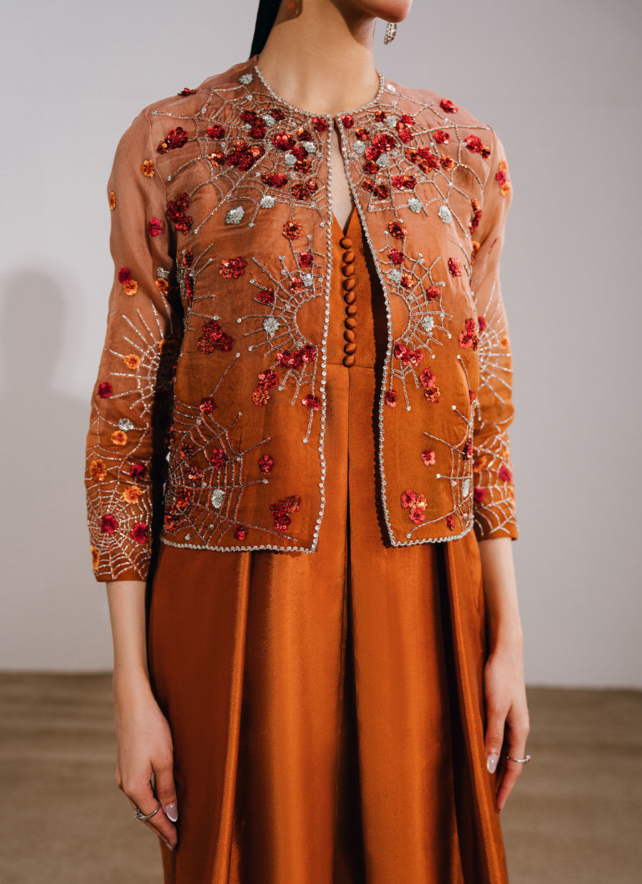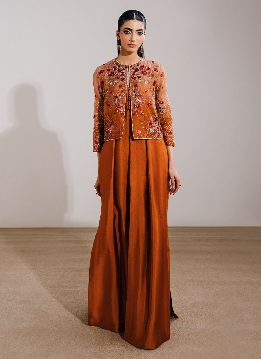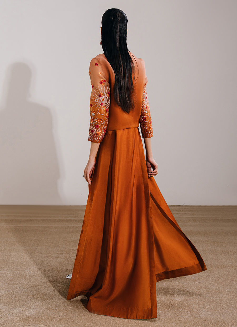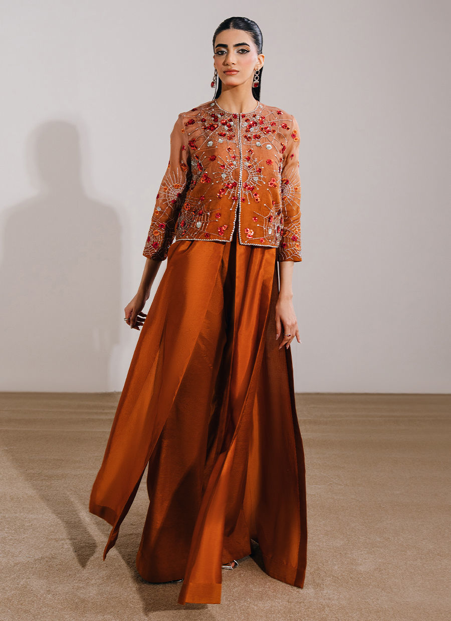 This burnt orange ensemble features a front-open short jacket paired with a layered dress and boot-cut pants for a modern, statement silhouette. The jacket is adorned with exquisite hand-embellished motifs and borders, complemented by meticulously embroidered sleeves for added detail. The underdress is designed with a sleeveless short bodice, attached with fluid panels and accentuated by waist-high slits that add movement and edge, while the boot-cut trousers complete the look with a refined, contemporary finish.