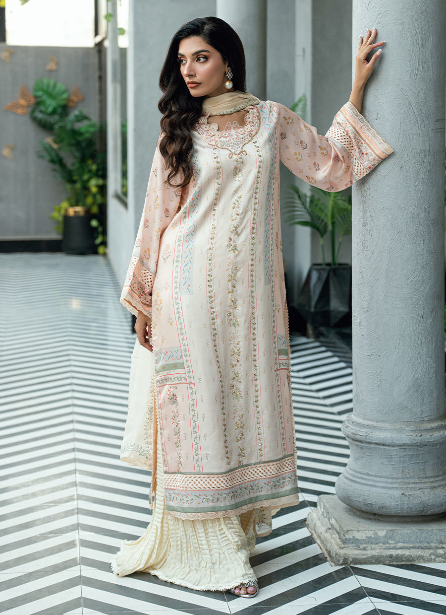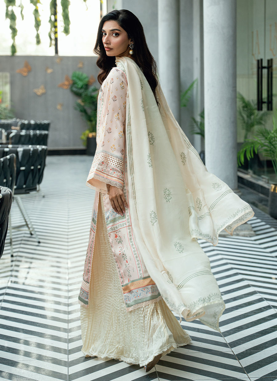 Paired with a matching digitally printed dupatta that complements the pastel palette and flowing crushed gharara pants in a coordinated ivory tone, this ensemble offers elegant movement and timeless appeal. Ideal for festive occasions, Eid celebrations, and sophisticated daytime events.