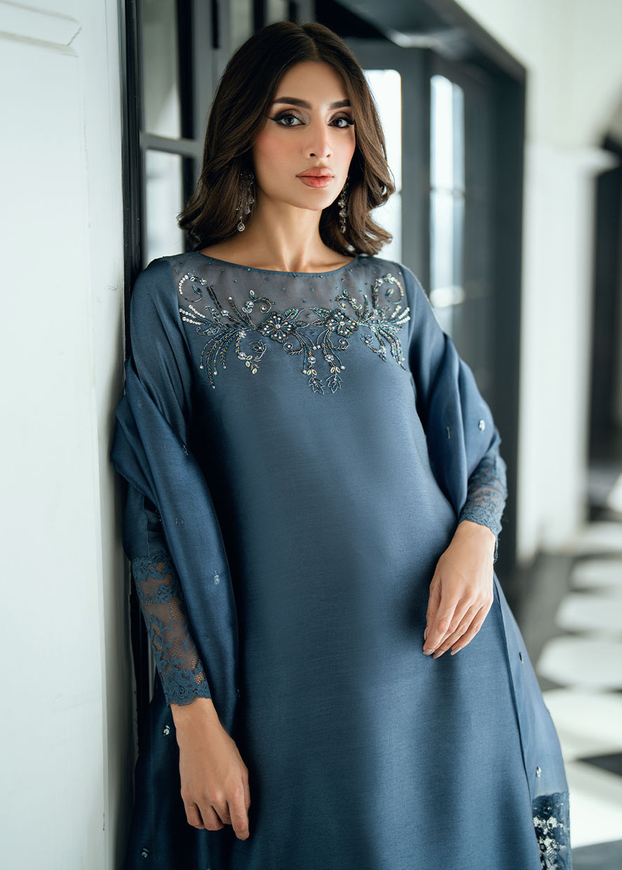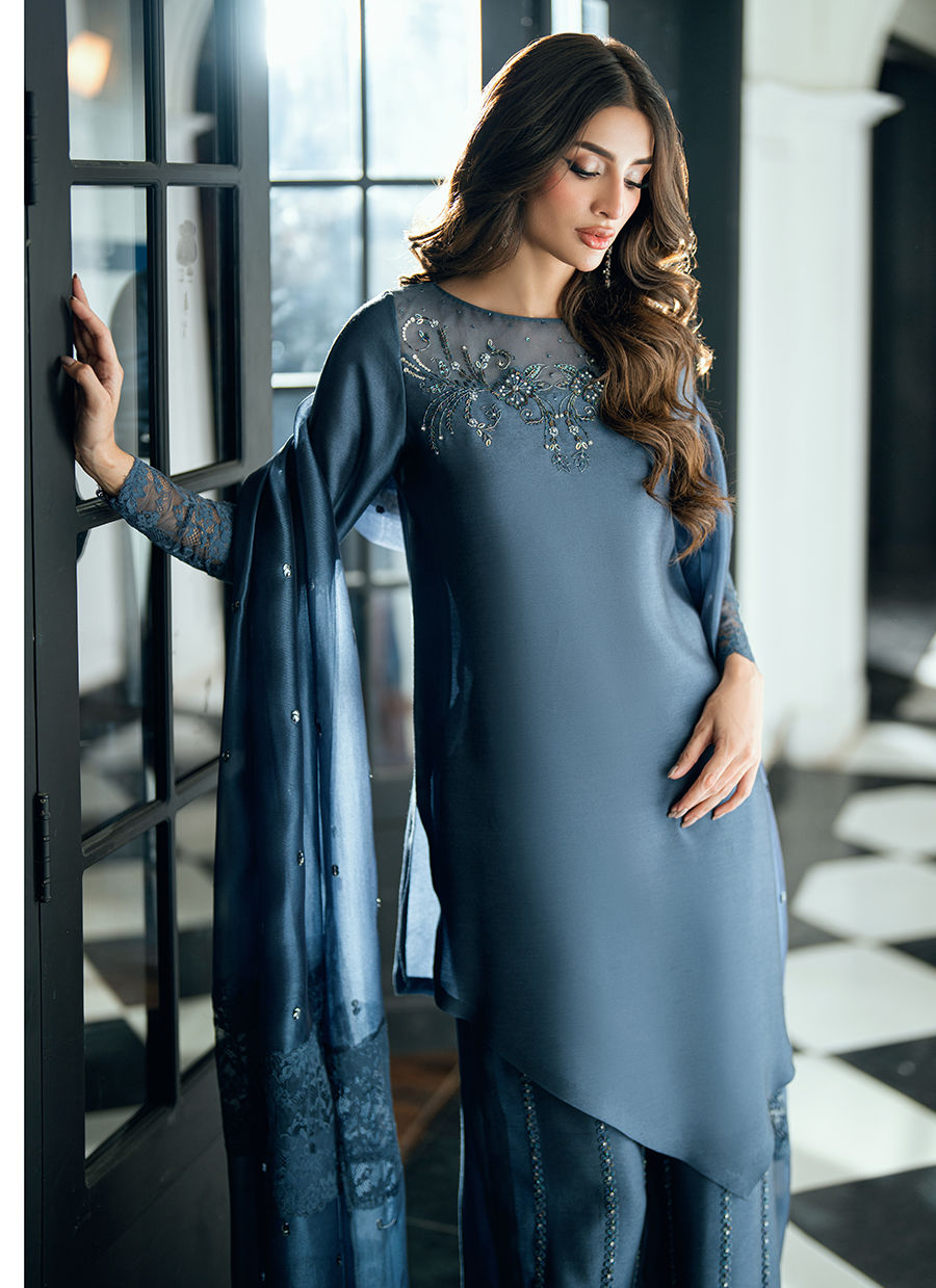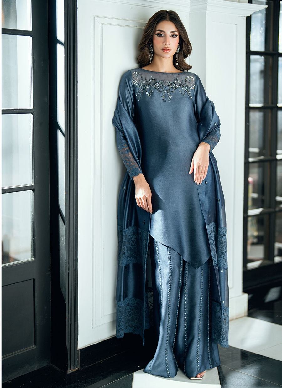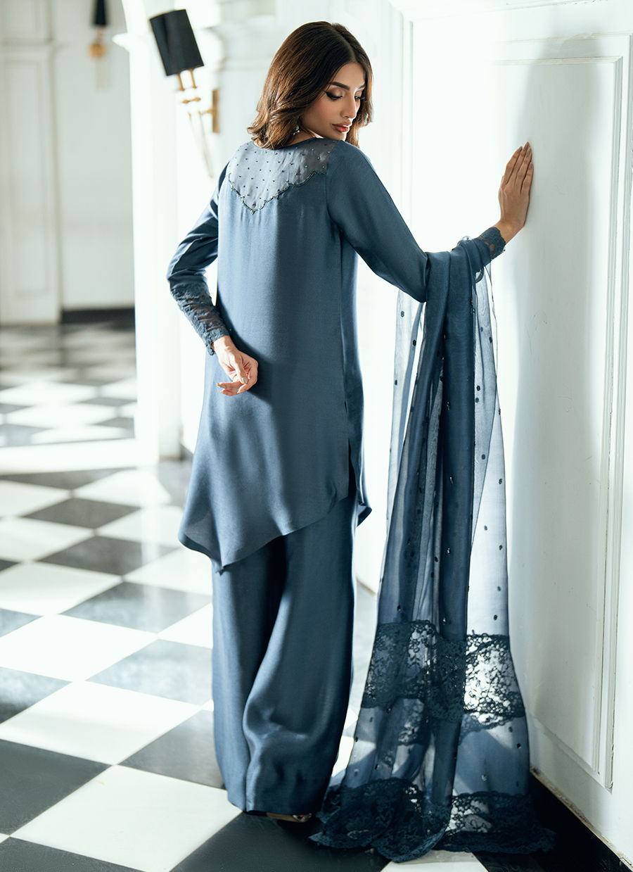 A charcoal grey dream crafted in viscose silk, adorned with hand-worked details on shirt and pants. Pair it with a self-organza chan dupatta finished with diamond shaped tassels.