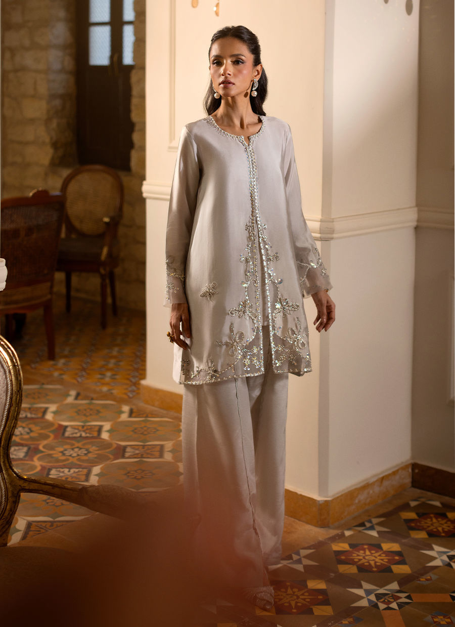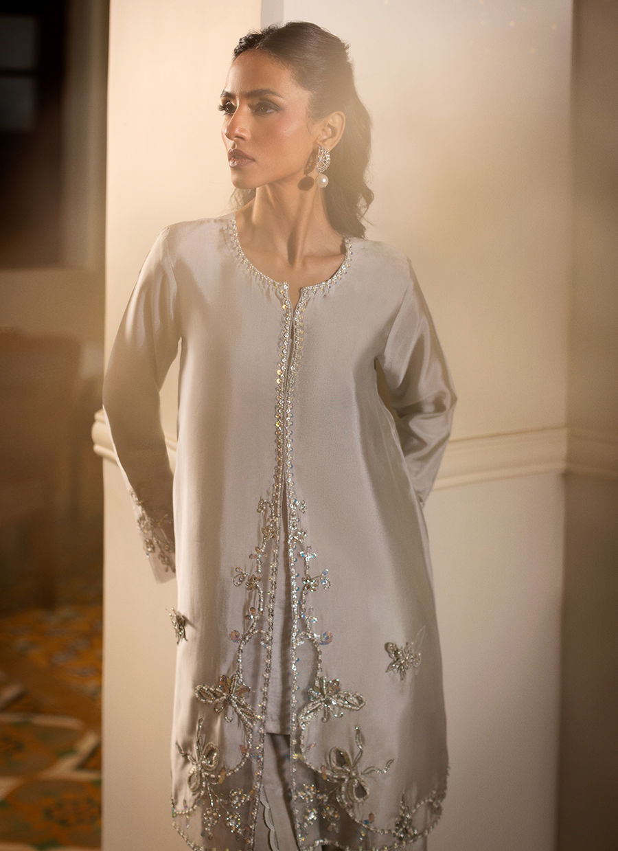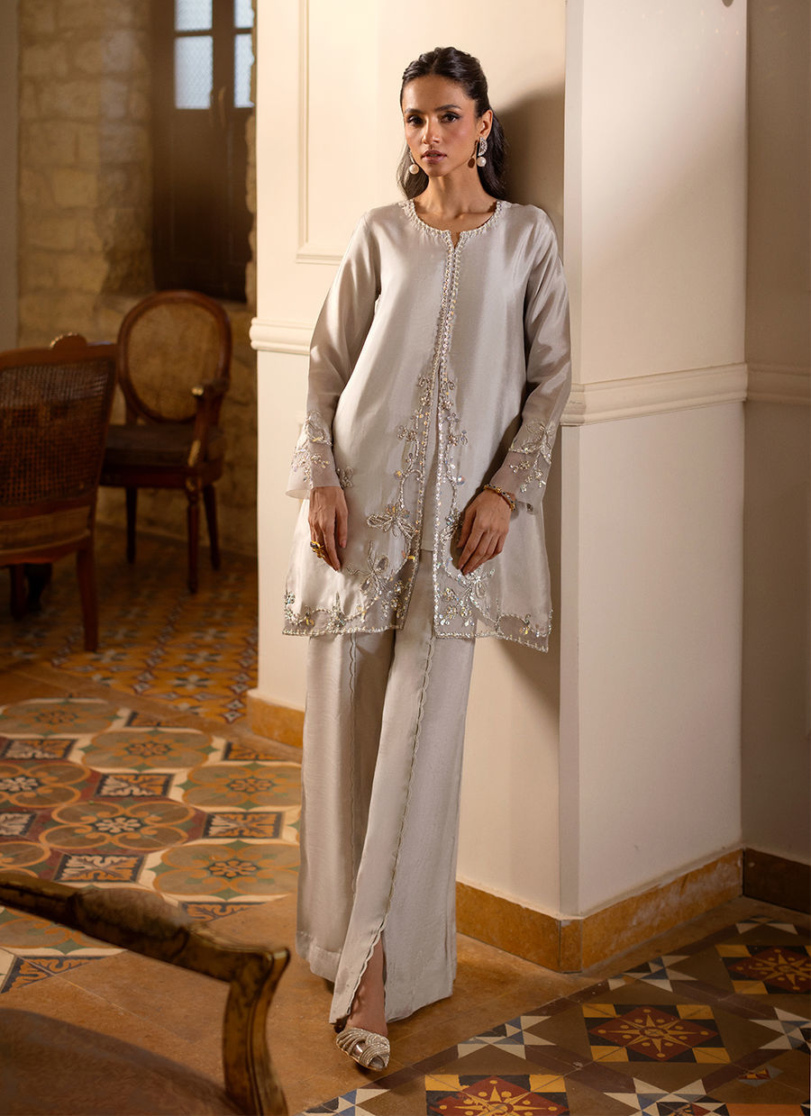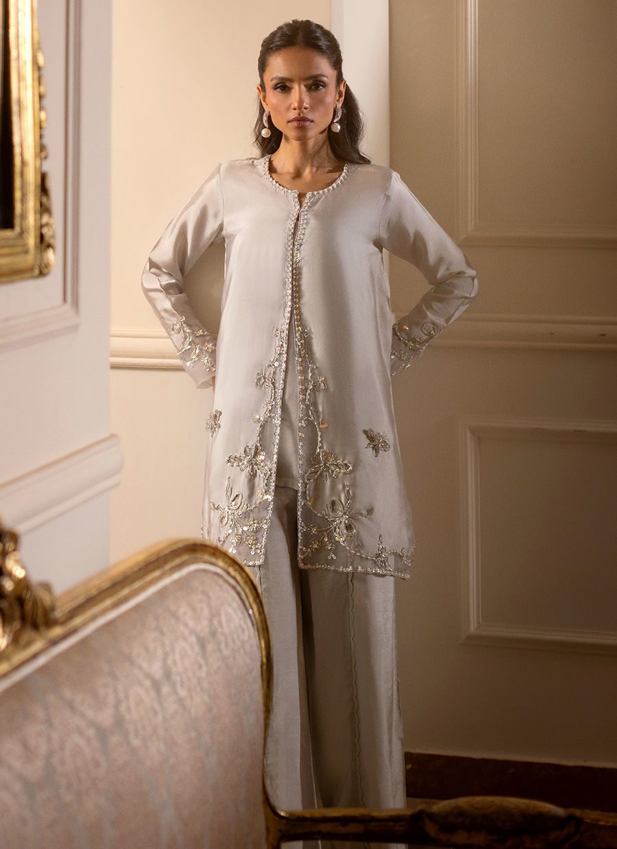 Abida - Front open knee length jacket in subtle silver grey silk canvas featuring all silver hand embroidered details on the hemline and sleeve. The jacket comes with a slip and a matching flared pants to complete the look.