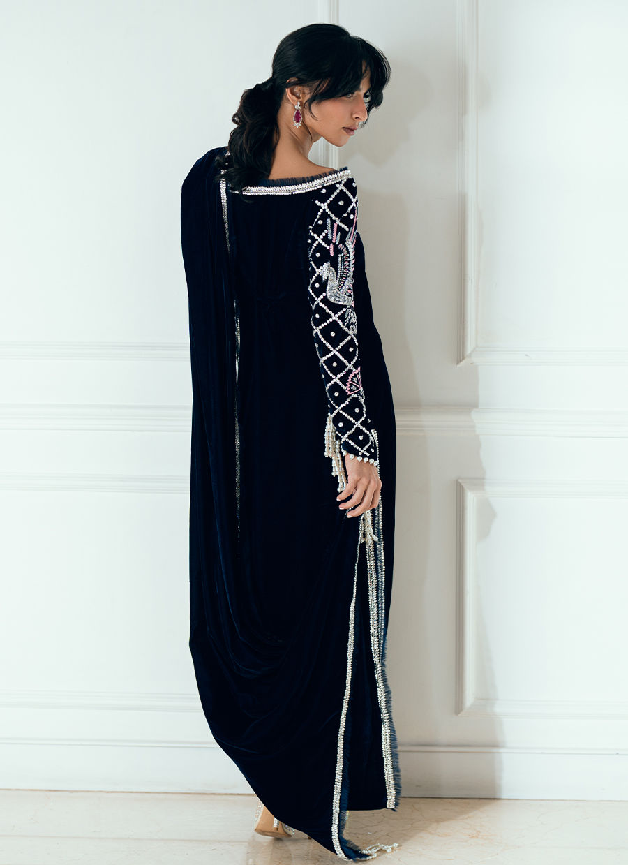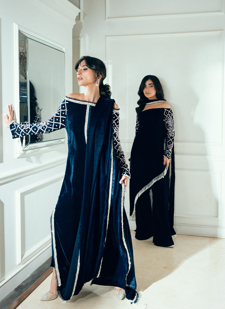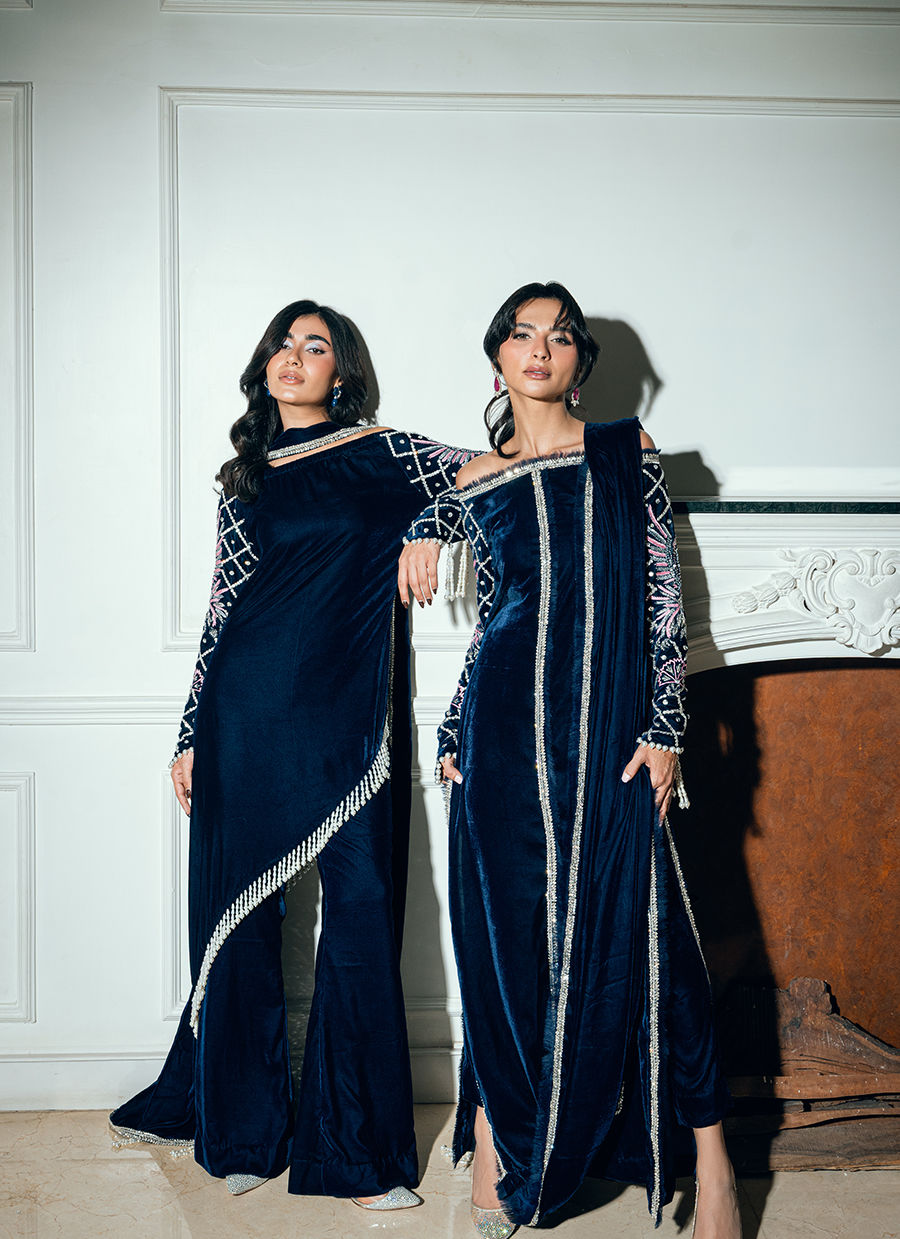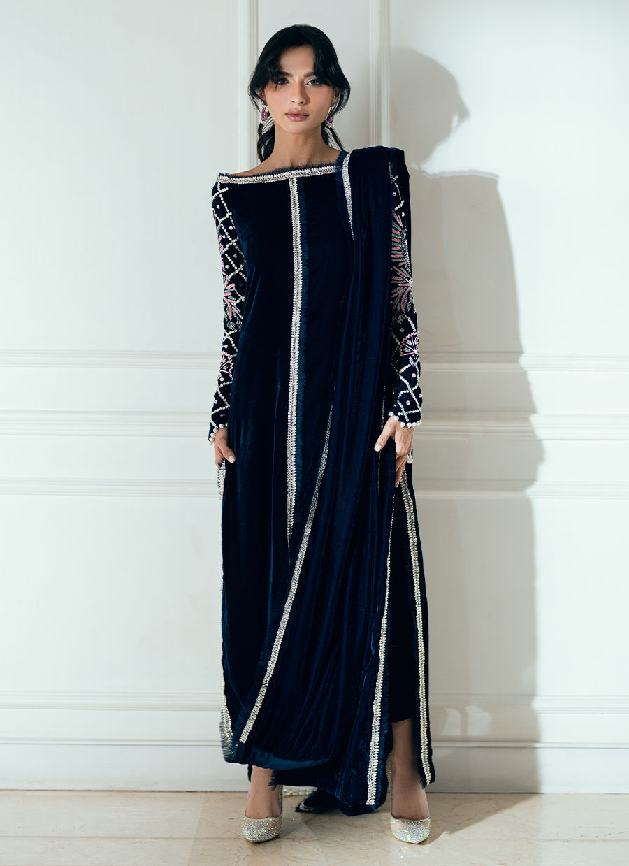 Adeena blue velvet shirt presents handmade stones, thread detailing, and zardozi sleeves, paired with a diamante border running across the shirt. Comes with an attached dupatta for effortless elegance.