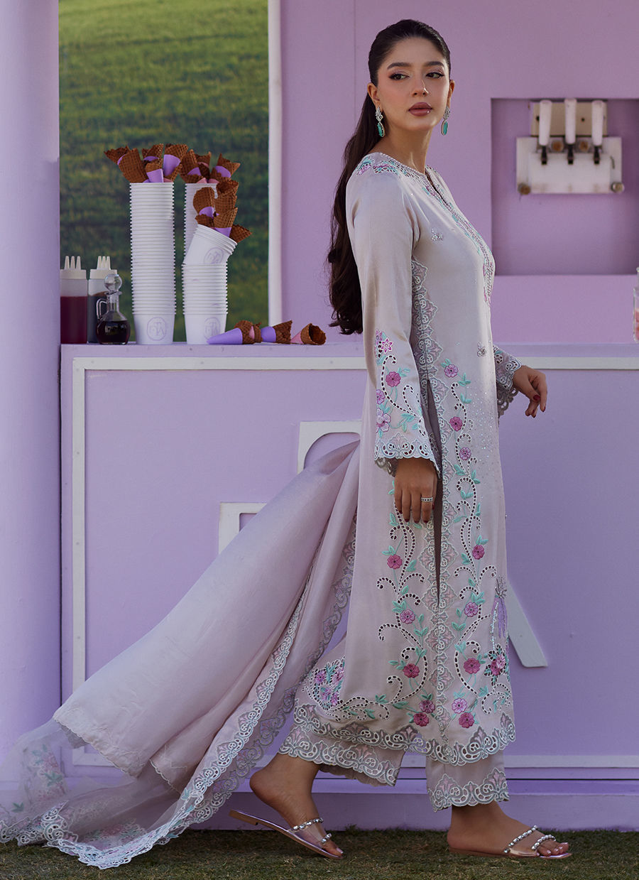 Effortless grace meets artistic craftsmanship in Ailsa — a dreamy ensemble designed for the ultimate soft festive glow. Crafted in an icy lavender raw silk straight long shirt, this look is beautifully embroidered in delicate shades of pink, turquoise, and off-white, finished with intricate schiffli detailing along the neckline, hem, and side slits for a refined, lace-like finish. The neckline is further elevated with exquisite zardozi handwork, while dainty embroidered bunches add a romantic touch around the daaman and side slits — making this piece feel elegant, elevated, and unmistakably FTA. Paired with a luxurious medium silk dupatta, finished with embroidered organza pallus and a four-side schiffli border, and completed with a matching raw silk izaar edged with schiffli, Ailsa is perfect for Eid mornings, intimate get-togethers, and pastel-perfect festive moments.