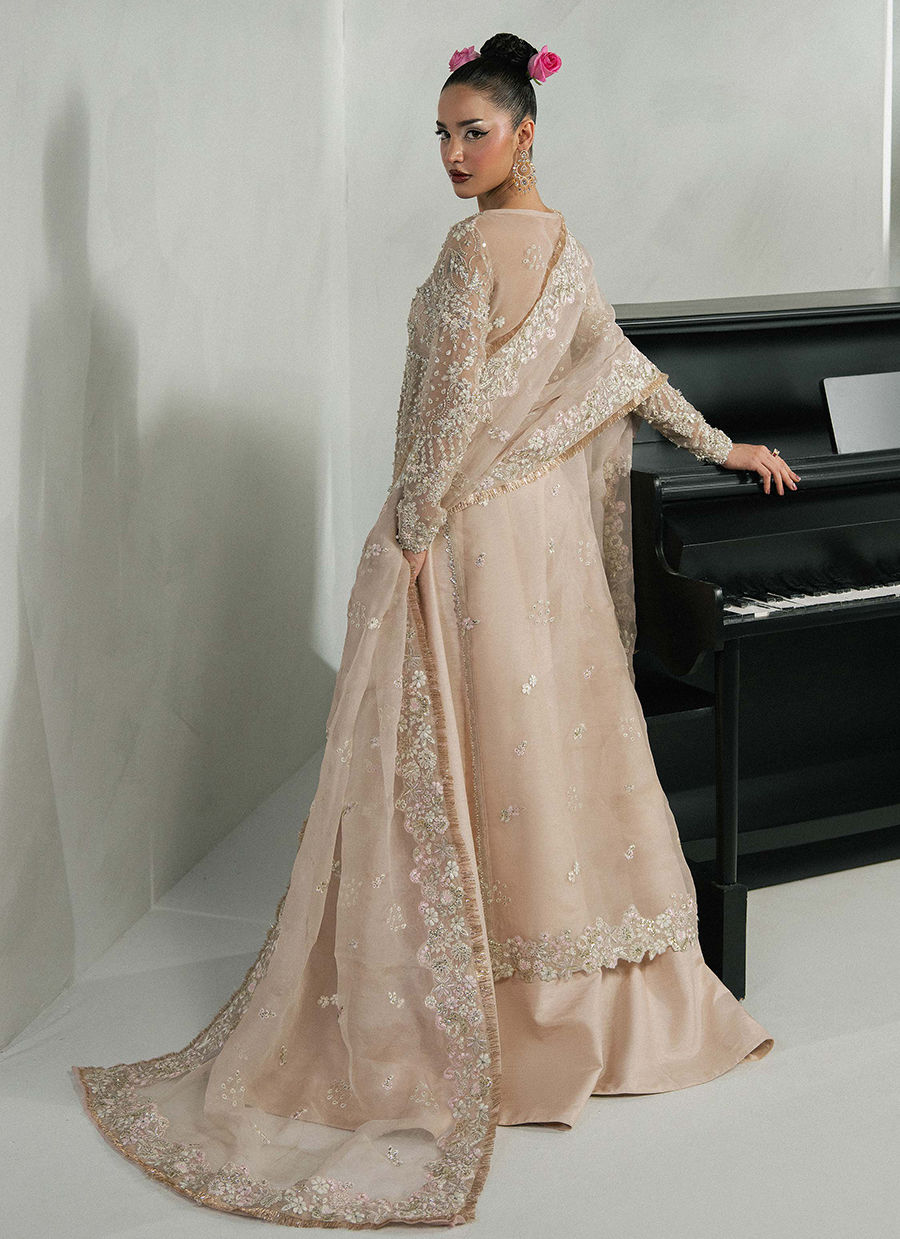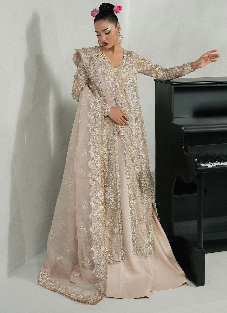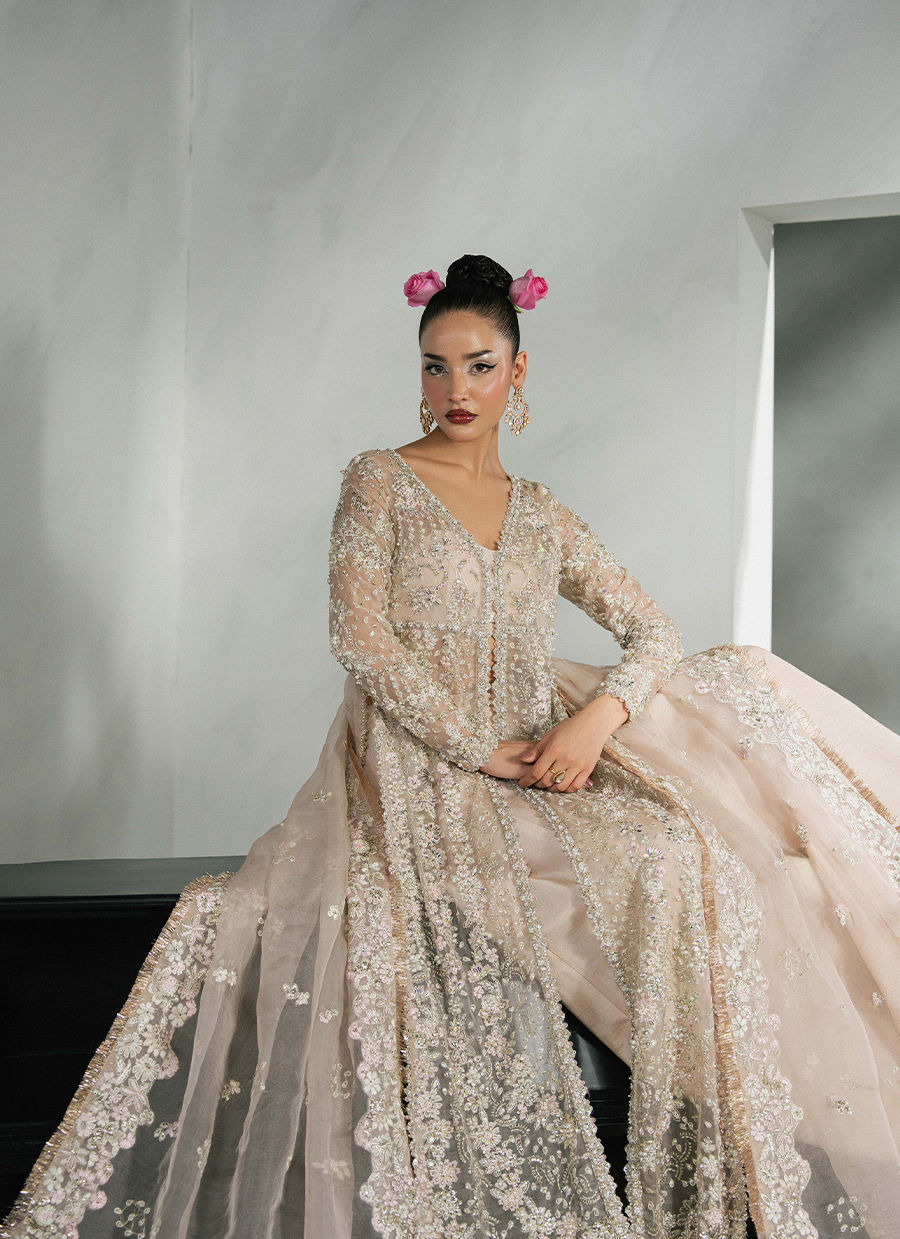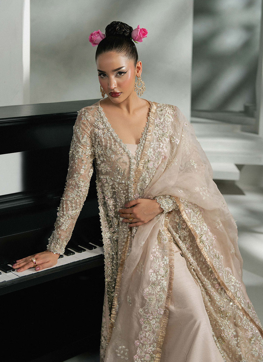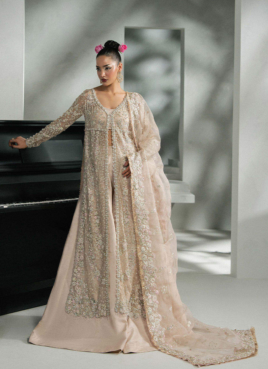 Alicia is an exquisite ivory-gold long Oganza shirt with full sleeves and a front-open silhouette is adorned with delicate embellishments and shimmering crystals, radiating refined opulence. Paired with flared Raw silk pants, the ensemble is completed with an Oganza dupatta featuring a richly adorned pallu border, exuding luxury and timeless sophistication.