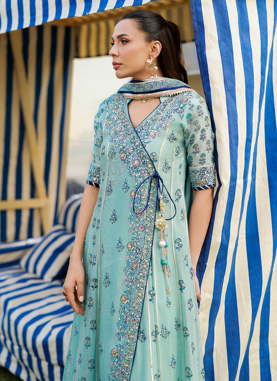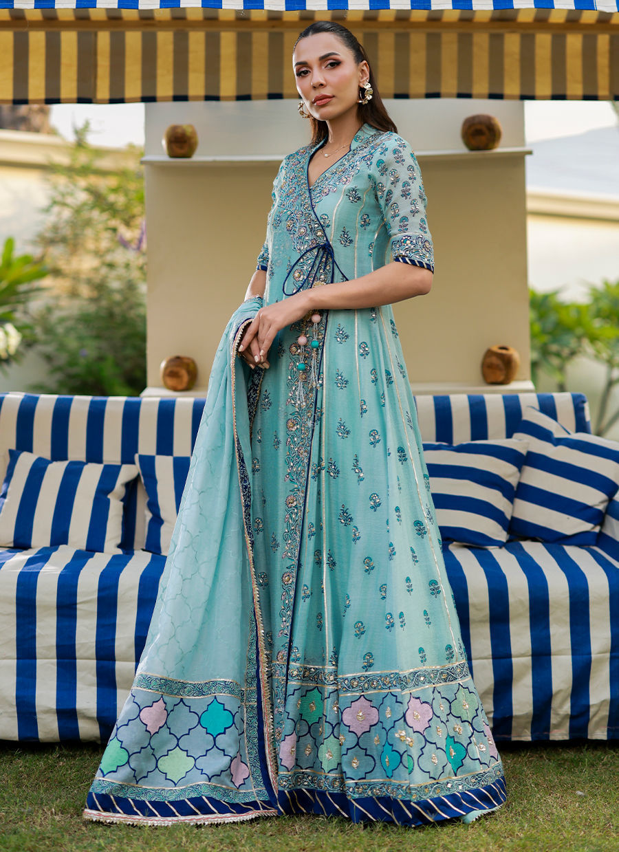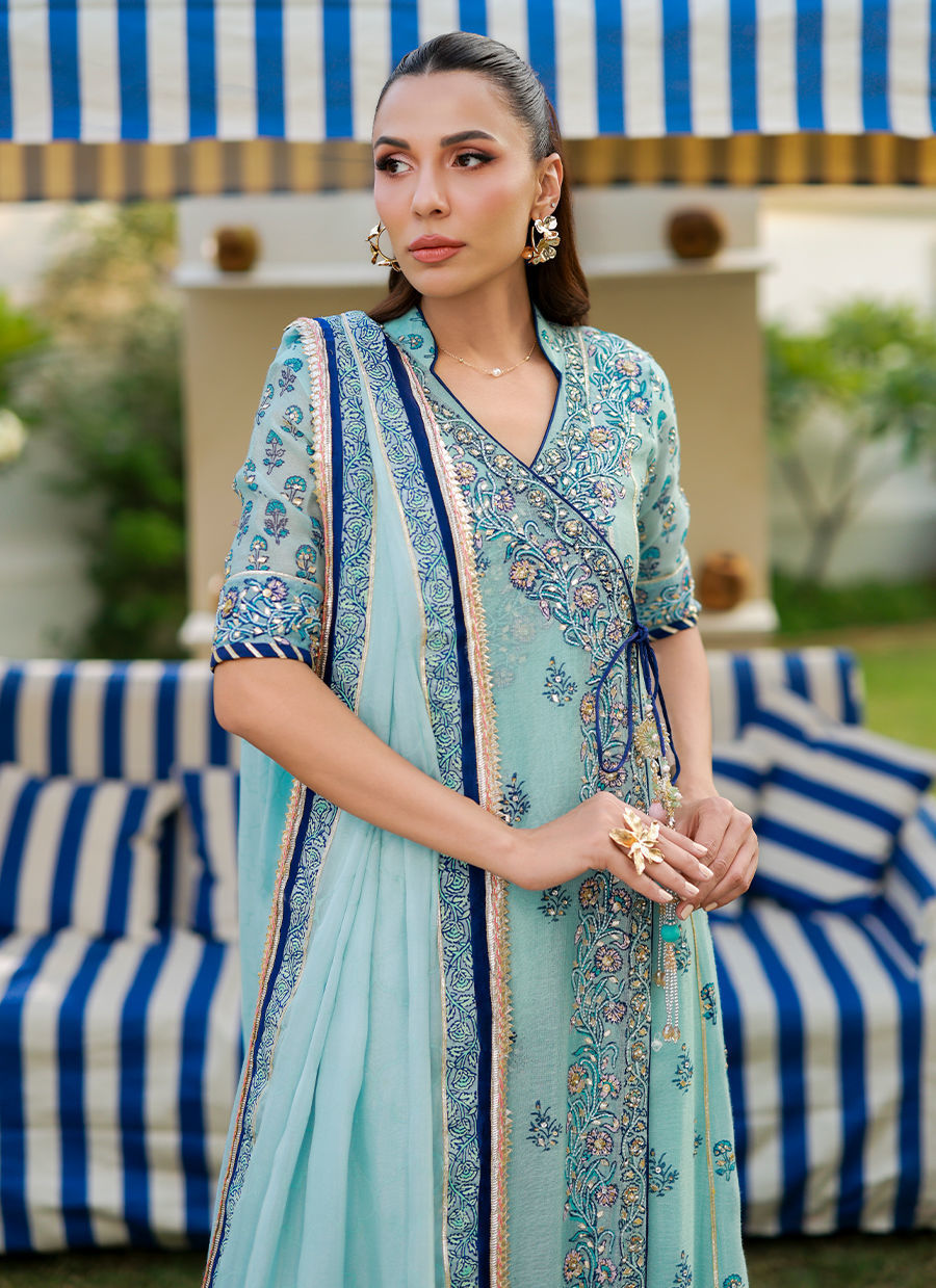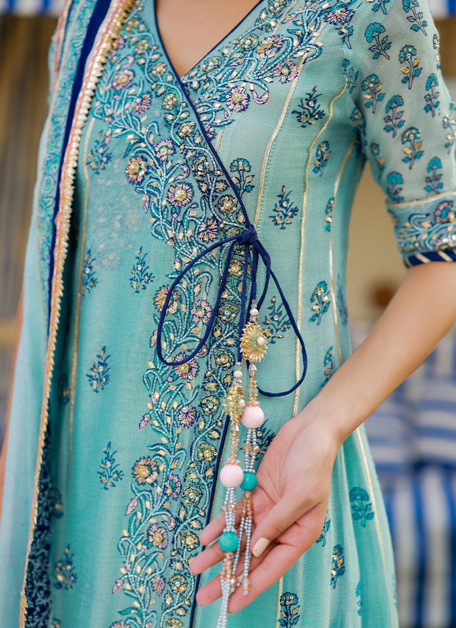 An ice blue angharka crafted in khaddi net, featuring block print and tassel detailing, with hand-embellished gota accents. Paired with an izaar and a medium silk dupatta adorned with block print and gota detailing for a graceful and elegant ensemble.