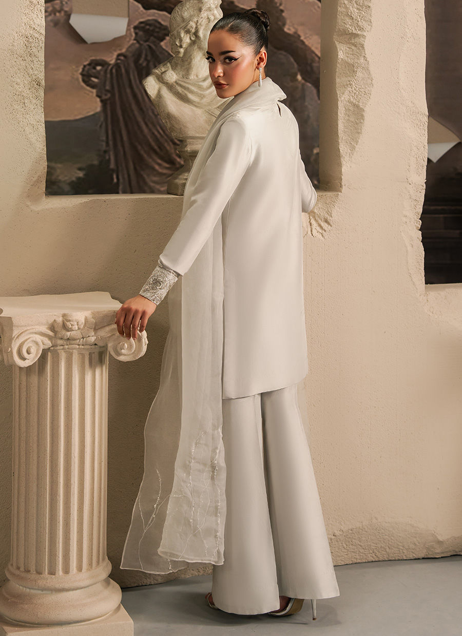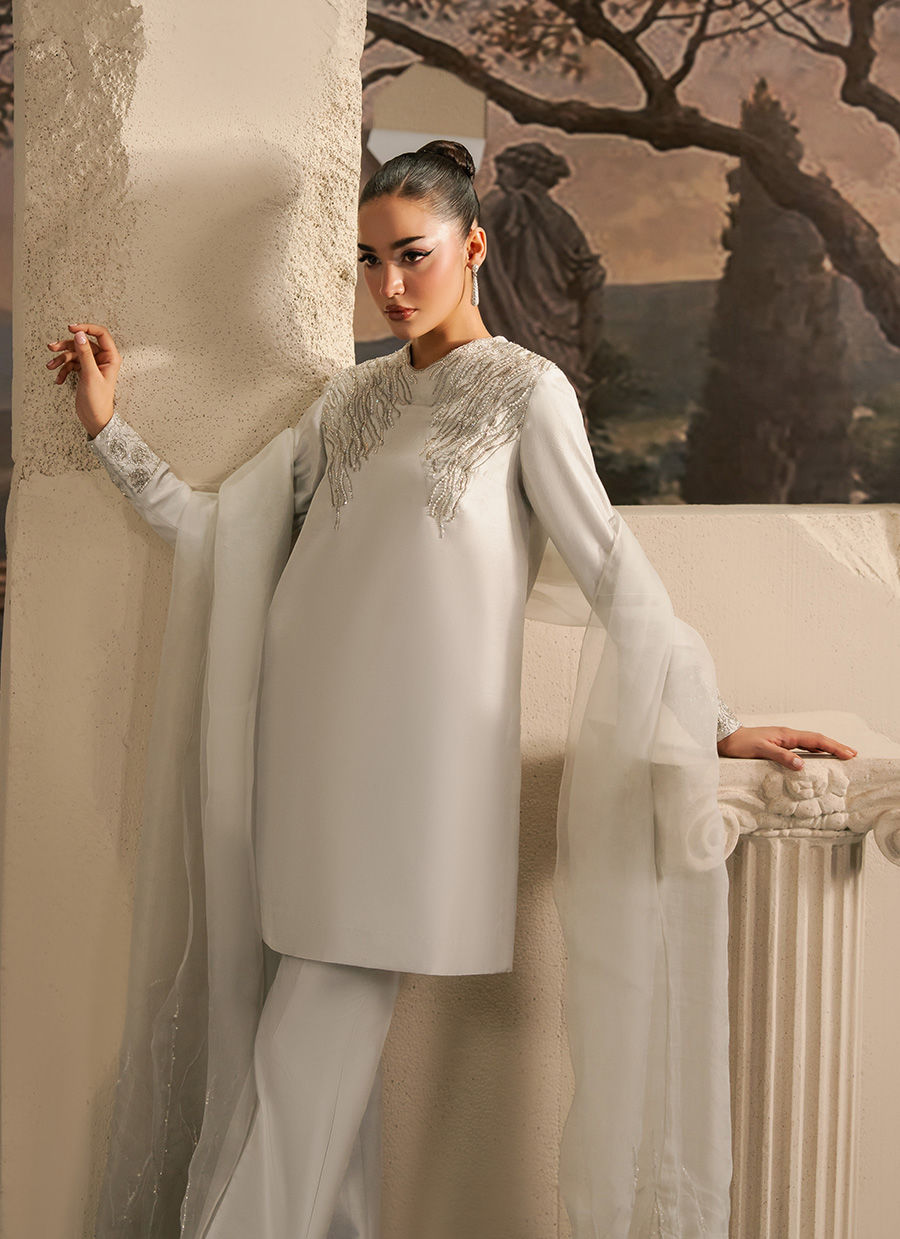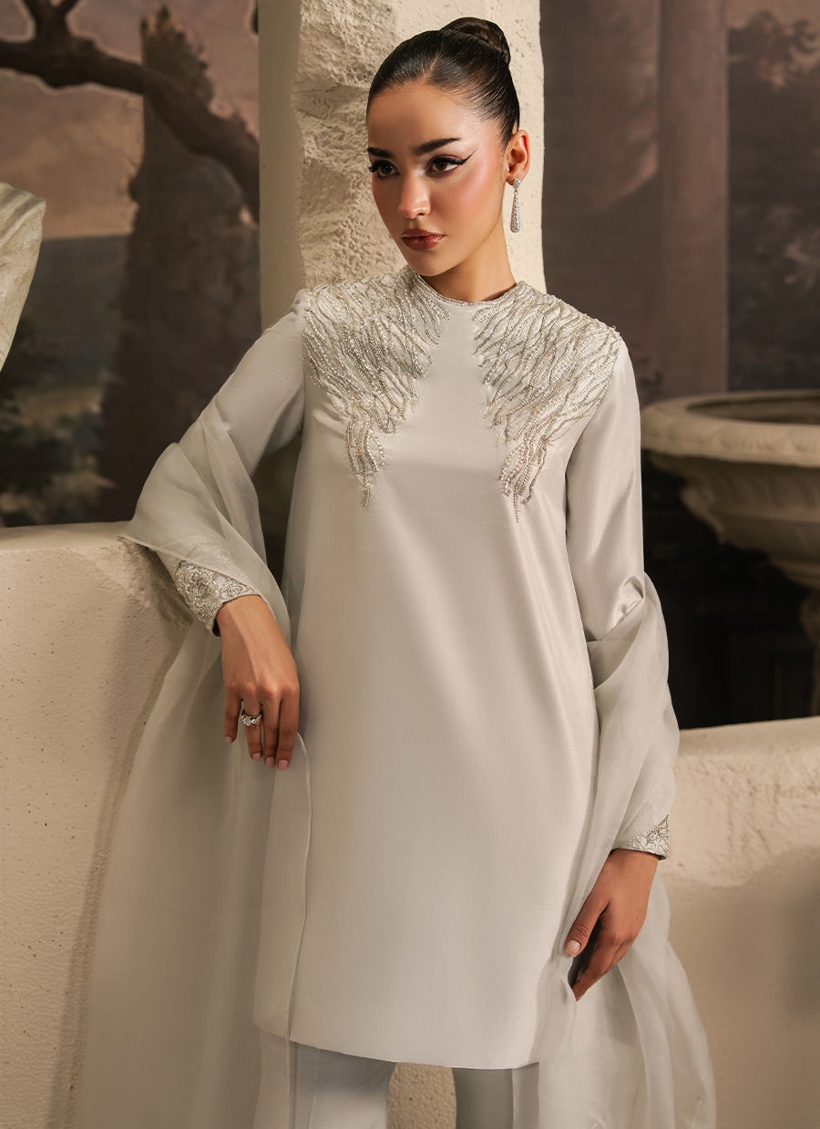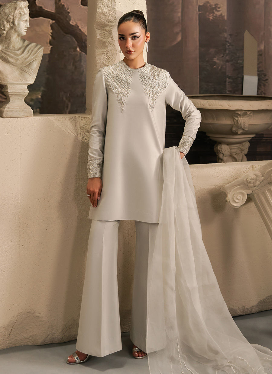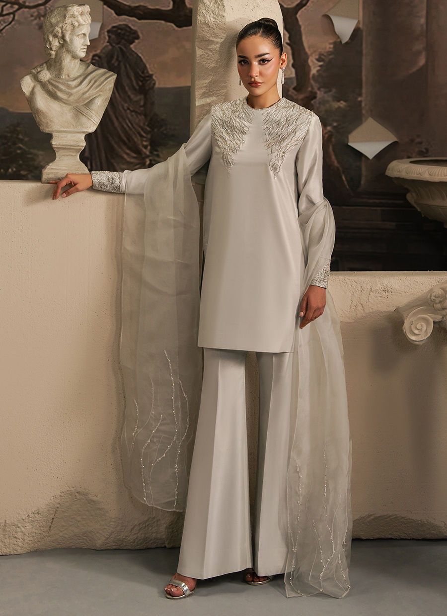 Crafted in luminous silver pure raw silk, Althea redefines modern elegance with a short tailored shirt and boot-cut pants, paired with an organza dupatta finished with pearl pleating along the hem for a statuesque silhouette. The ensemble is elevated with intricate hand embellishments of pearls, beads, cut dana, and silver chains, striking the perfect harmony between refined detail and extreme luxury.