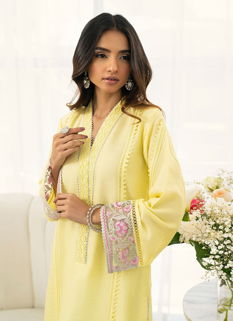 Long silhouette shirt in pretty lime yellow shade featuring floral embroidered panels on hemline which are adorned with schiffli details. The neckline is enhanced with crochet lace and silver gota. The shirt can be paired with straight matching pants.