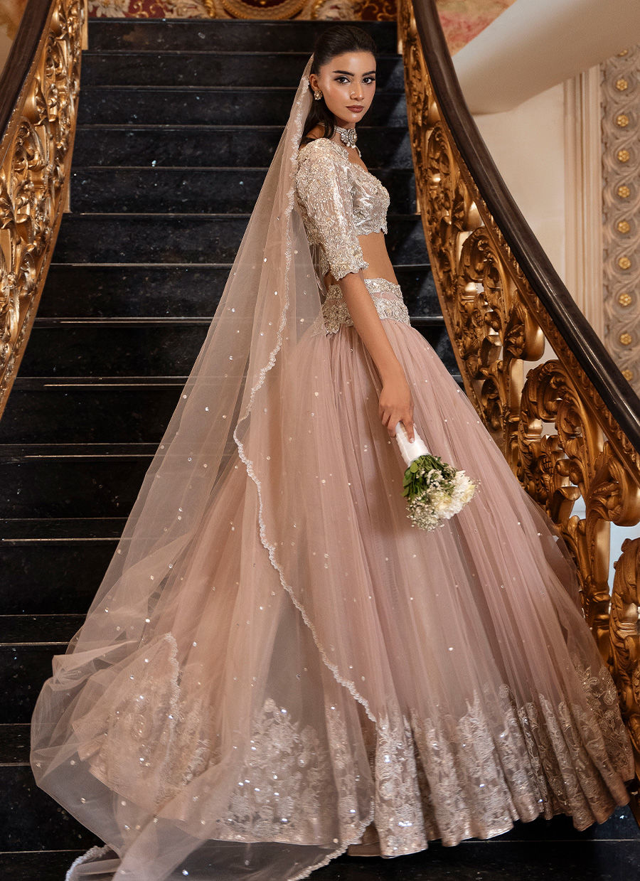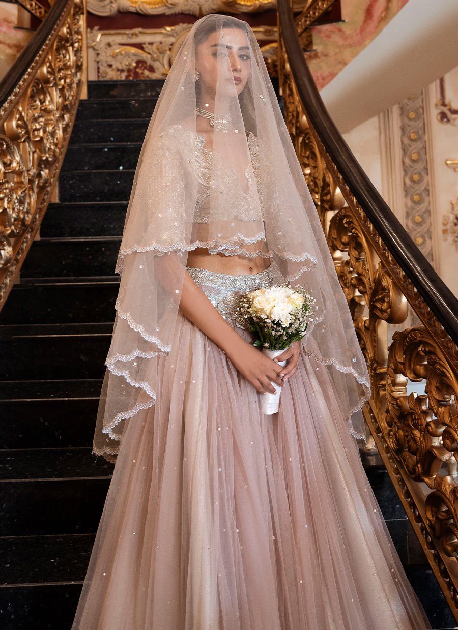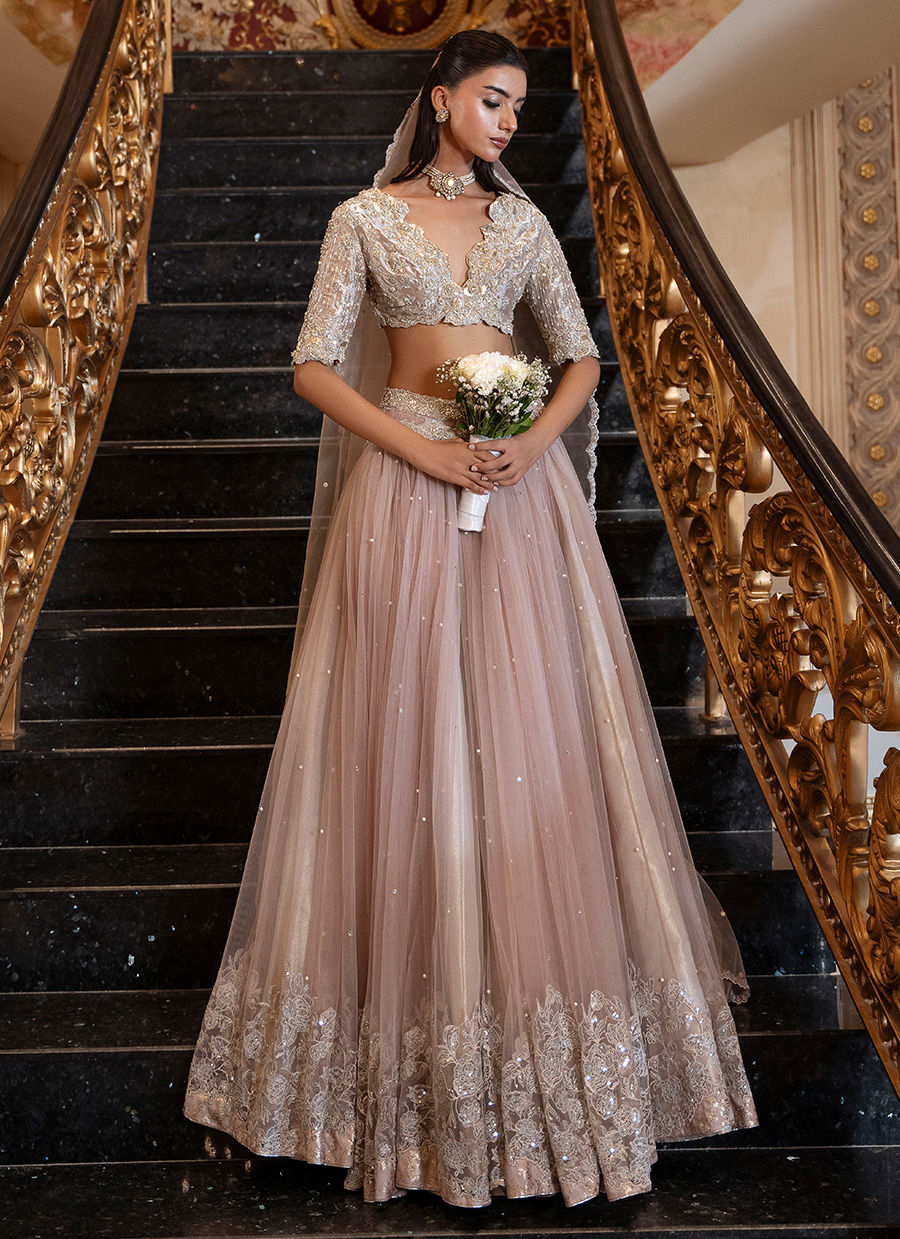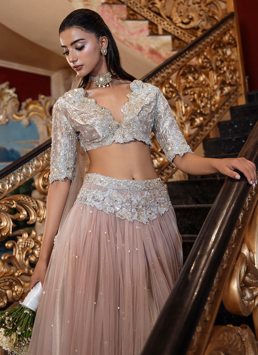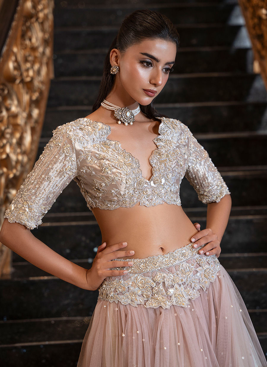 An elegant powder pink and ivory net lehenga, delicately adorned with pearl detailing, embroidered borders and embellished belt. The layered skirt adds graceful volume, giving it the charm of a modern silhouette. Paired with a tissue choli, hand-embellished and designed with a flattering “V” neckline and classic Indian sleeves, the ensemble exudes a youthful yet refined appeal, perfect for any wedding guest. A matching net veil with scalloped detailing completes the look, keeping it minimal yet timeless, while enhancing its overall sophistication.