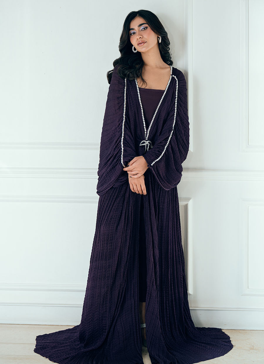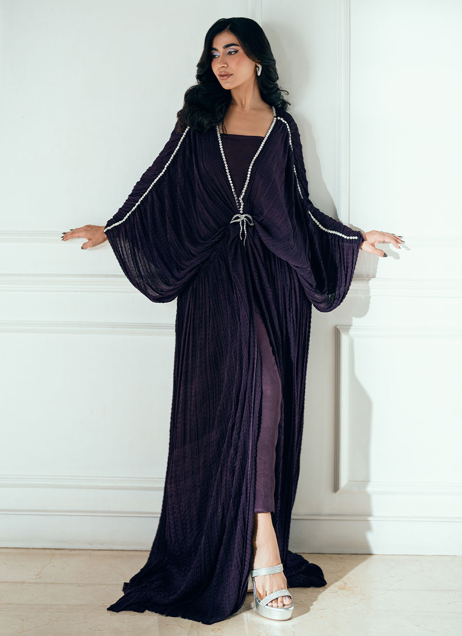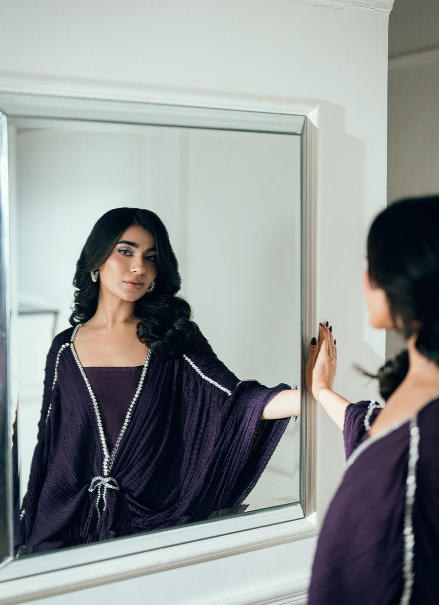 Amy georgette chiffon kaftan showcases diamond-worked necklines on the front, back, and sleeves, paired with elegant 3D bow brooch details on both front and back.