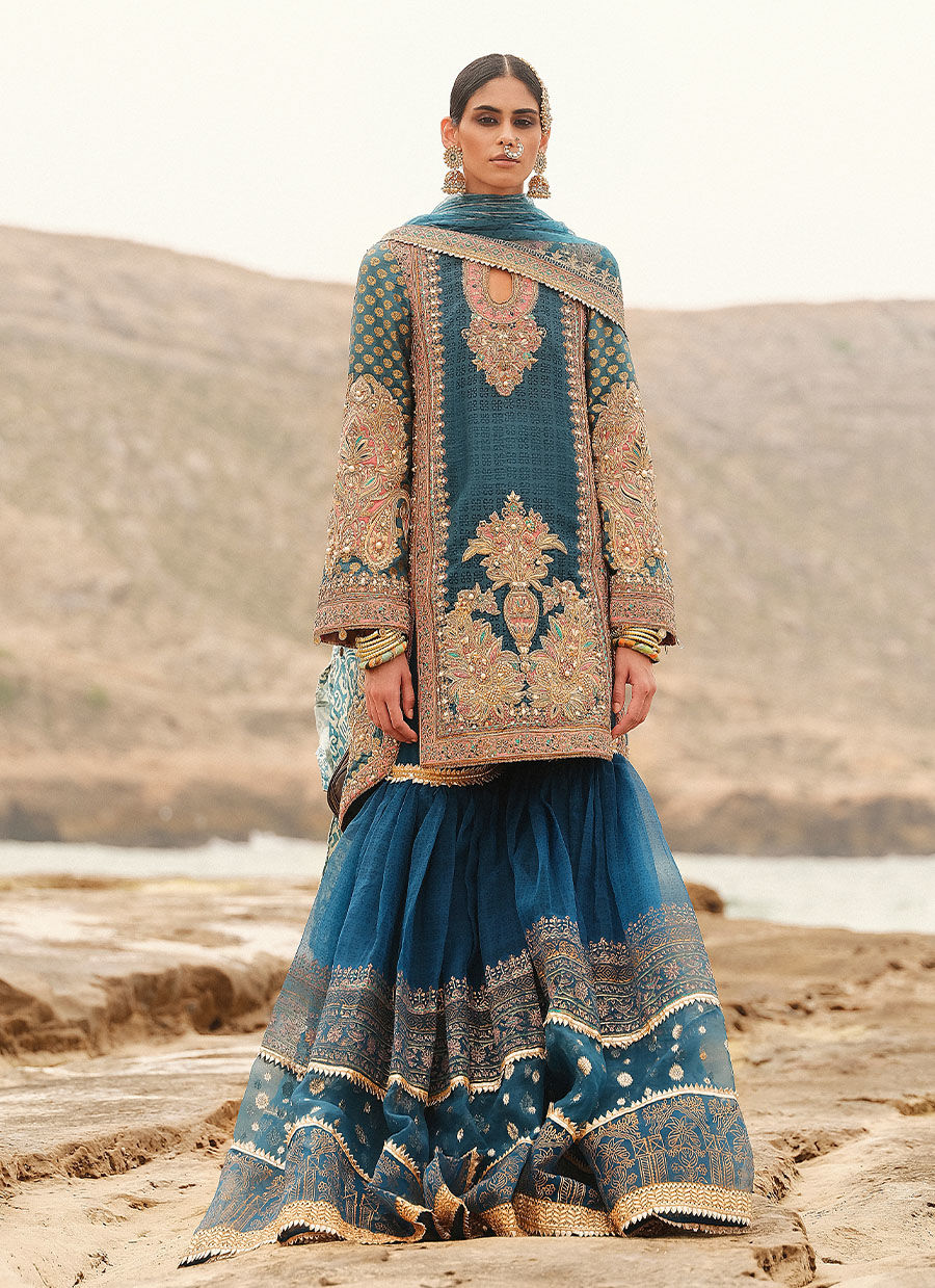 Anabiya'' epitomizes the artistry and grace of bridal couture. The Indian silk front and jamawar back in an inky blue hue adorned with exquisite appliqués adda work and delicate embroidery tell a story of timeless beauty. Paired with a kacha tila organza dupatta featuring intricate block and ari work it's a masterpiece of tradition and sophistication. The ensemble is completed by the organza gharara graced with elegant block print and a kacha tila border. Anabiya'' is a celebration of heritage and style perfect for the bride who seeks timeless elegance on her special day.