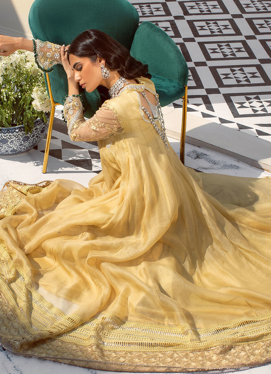 Flared silhouette kalidar in kiwi green shade on pure stripped organza canvas featuring old school zardozi neckline in all silver. The hemline is adorned with crochet border and light catching embroidered organza. The back of the kalidar is adorned with handcrafted signature AA tassels. The outfit can be paired with ruffled and embroidered organza dupatta and matching raw silk pants.