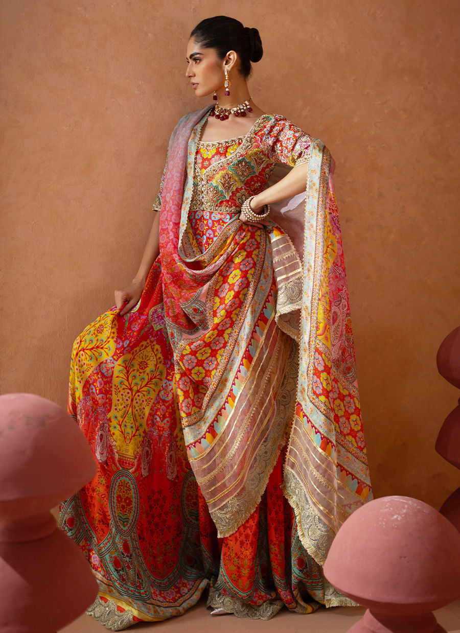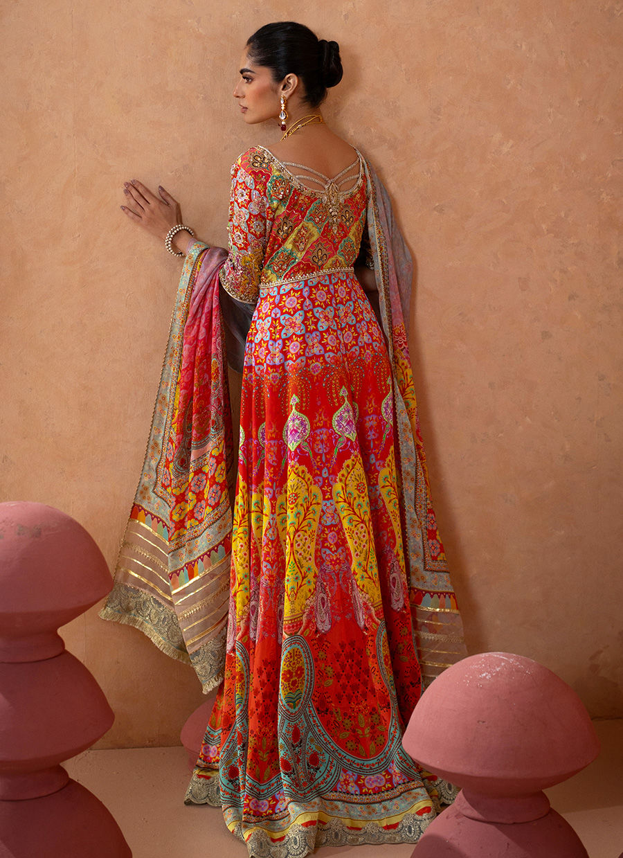 The floor-length Kalidar is presented in captivating shades of coral, sea green, and ochre, crafted from silk canvas. It showcases intricate zardozi embellishments on the bodice and sleeves. The centre back of the Kalidar is elegantly adorned with exquisite zardozi accents, highlighted by a deep-cut neckline. Accompanying the Kalidar is a silk printed dupatta, detailed with gota work on the panels. This Kalidar may be tastefully paired with matching straight-cut raw silk pants.
